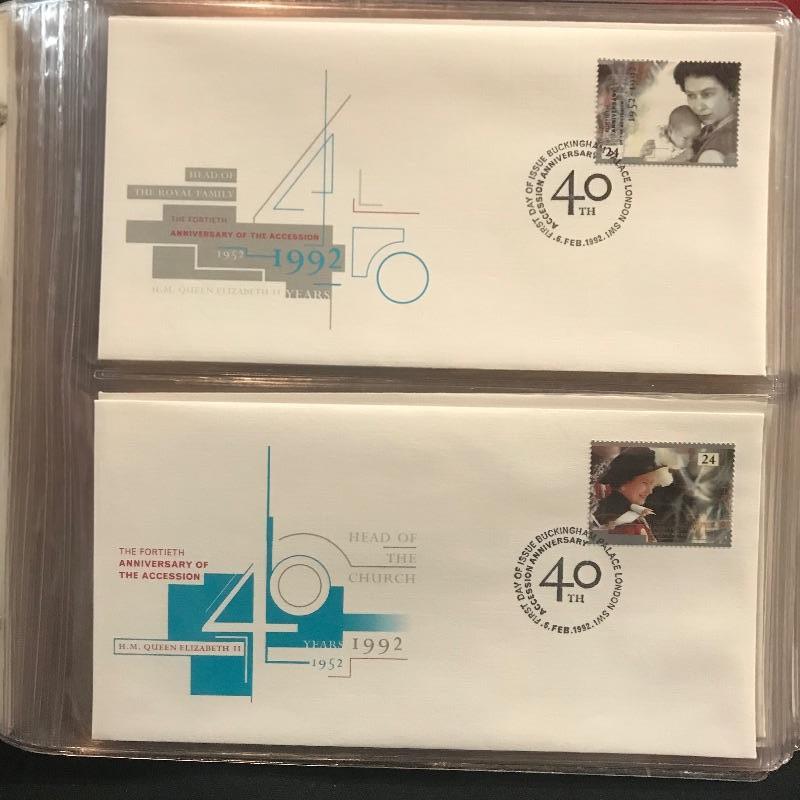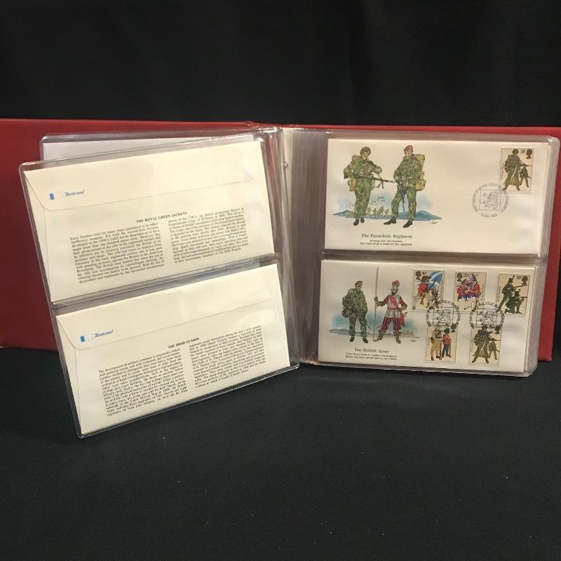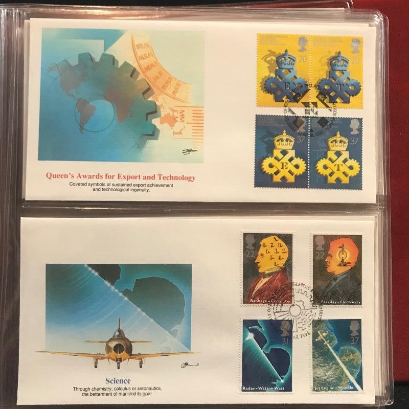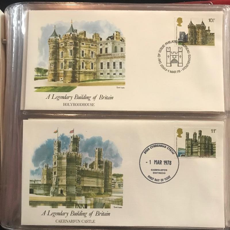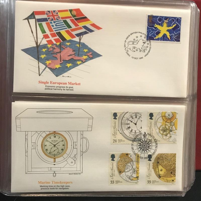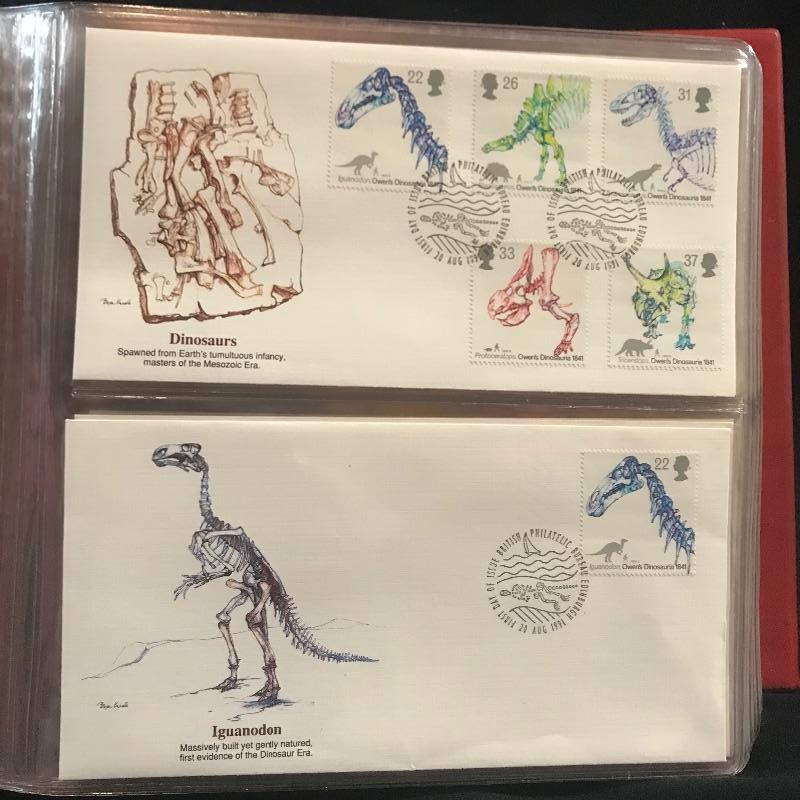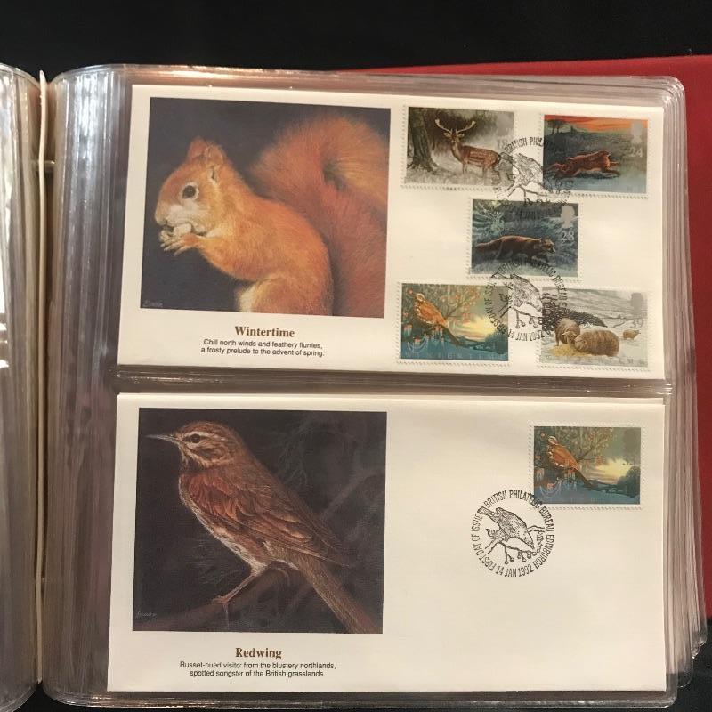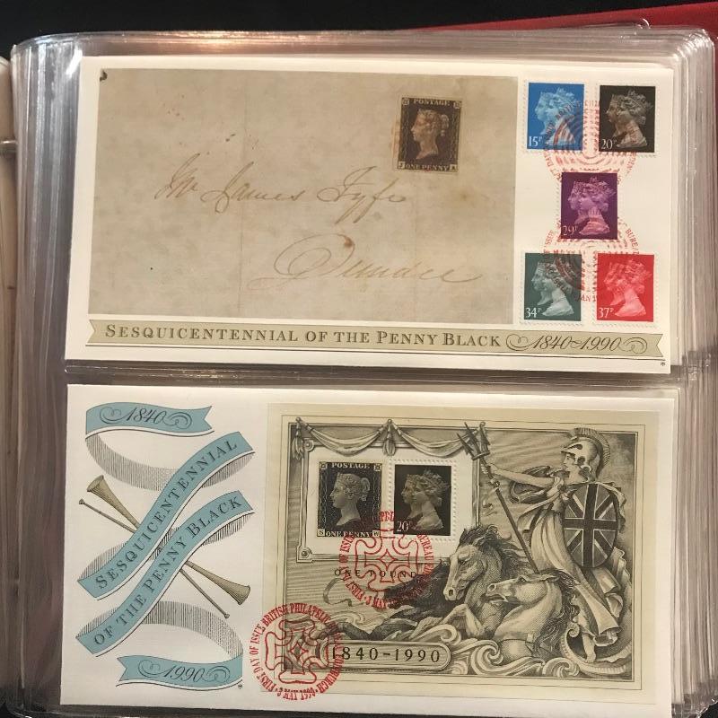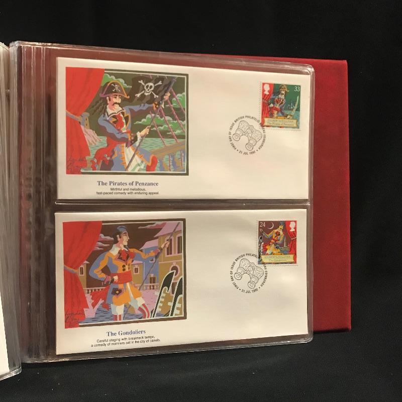 Four leather-like red binders from The Westminster Collectors Society with cancelled 1st day covers. Genres range across the board, mostly from the 1990s, a couple found from the 1970s. Each binder has just under 30 pages with 2 covers each. Title page shown in photos is in each binder.