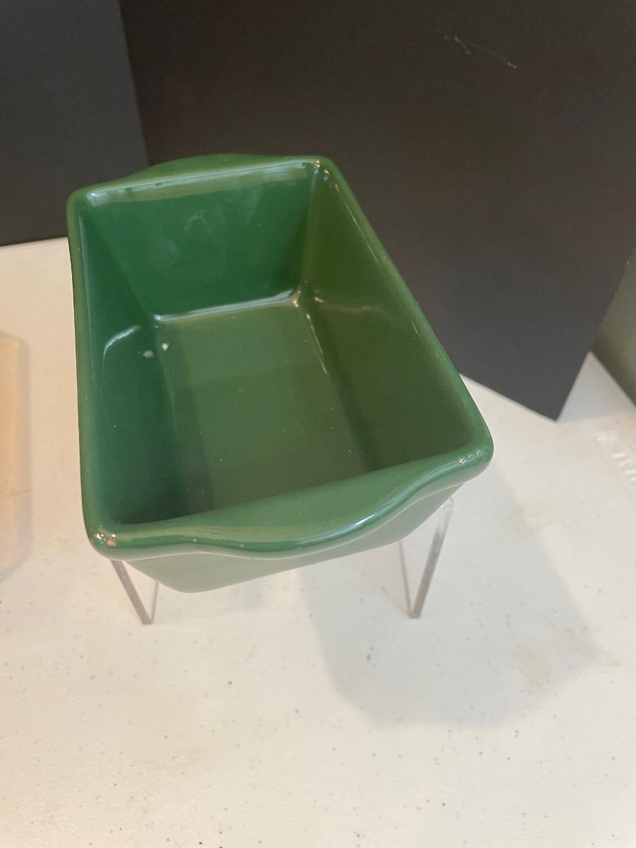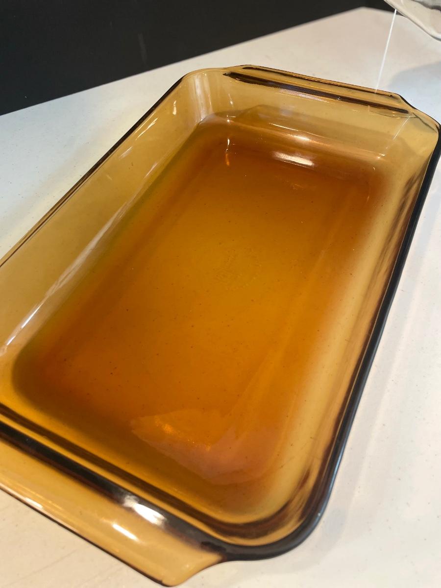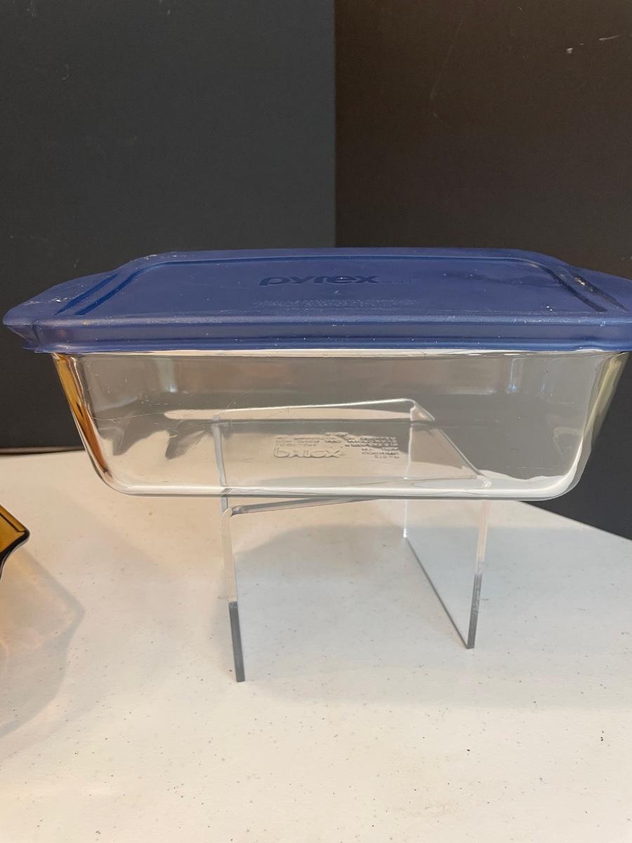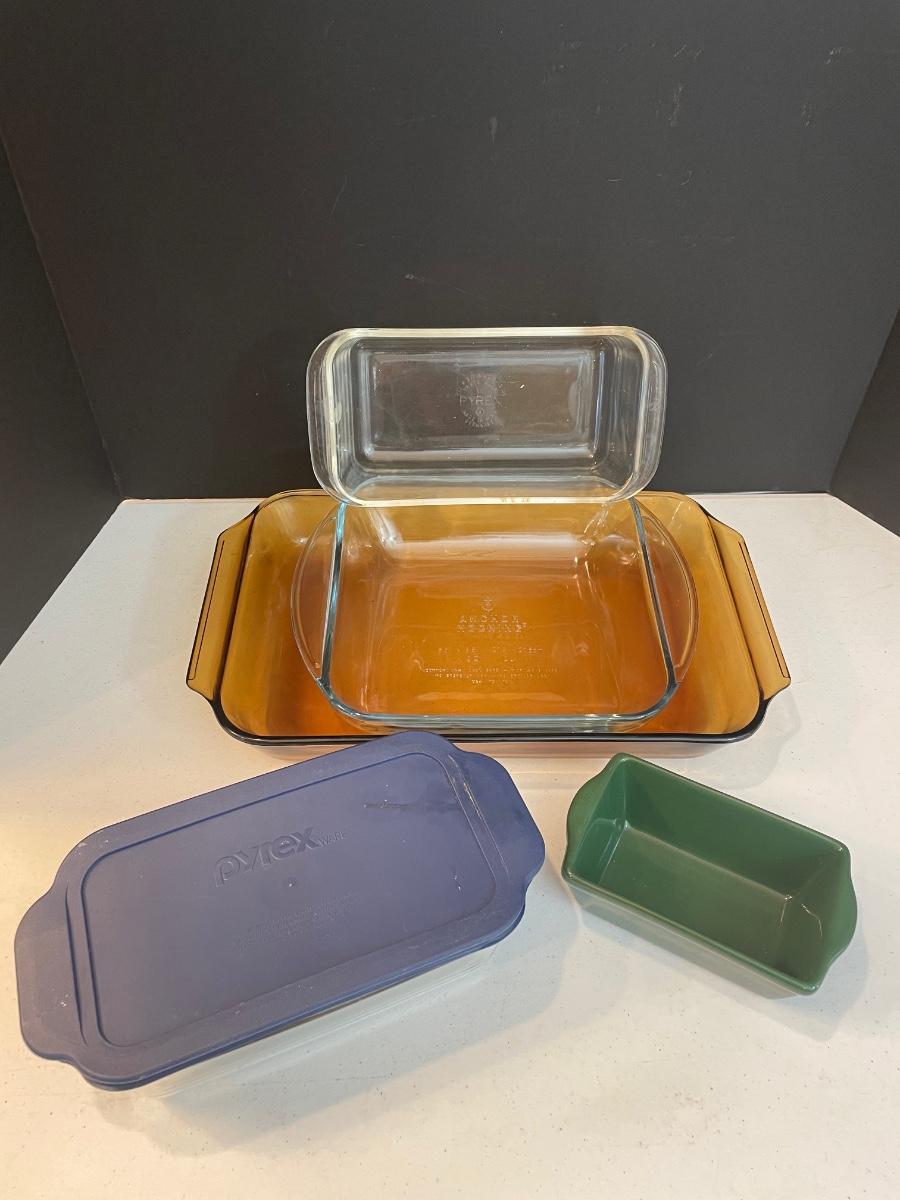 Includes Pyrex lidded loaf pan, clear loaf pan, green enamel coated mini loaf pan, 8 1/2" x 8 1/2" brownie pan and an amber-tinted 9" x 13" cake/casserole dish.