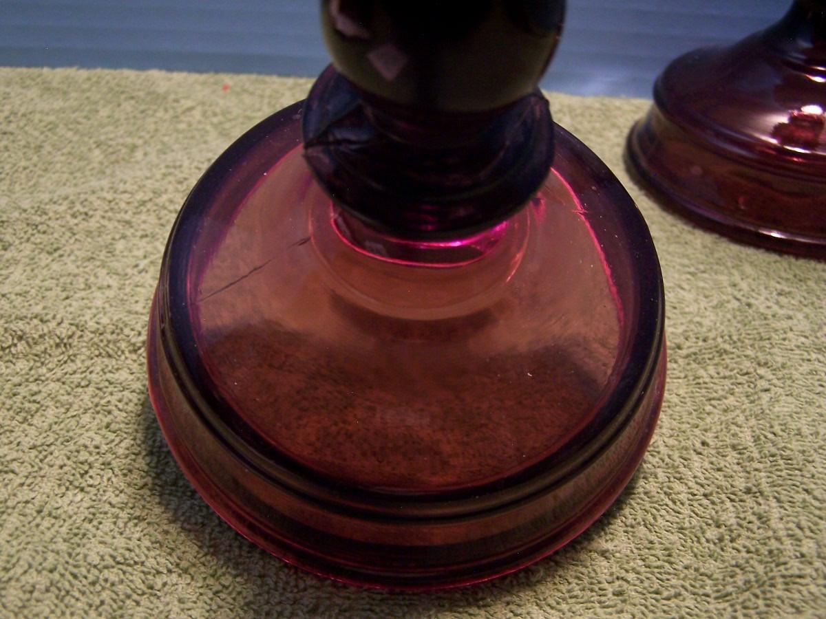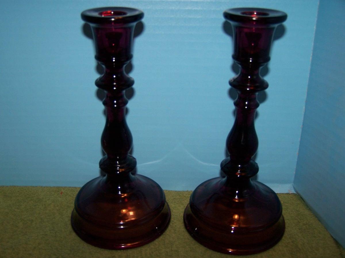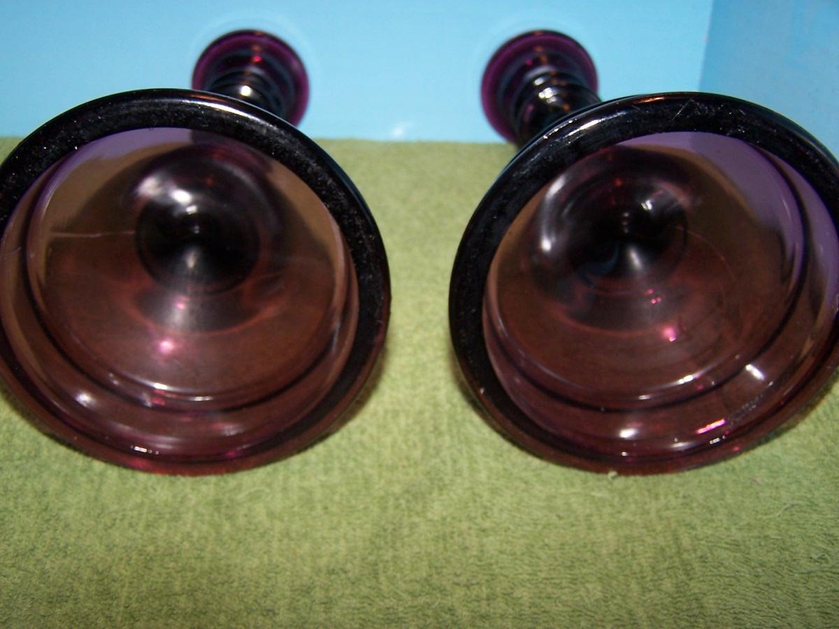 THESE ARE A GORGEOUS PAIR OF AMETHYST IMPERIAL GLASS TALL CANDLESTICKS... THEY ARE UNMARKED... THEY ARE 8 3/8' TALL... THERE ARE SEVERAL MANUFACTURE FLAWS, NO DAMAGE, SLIGHT WEAR...