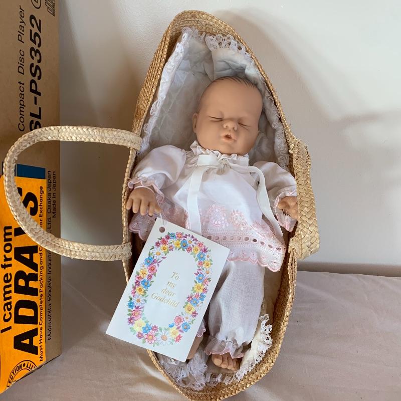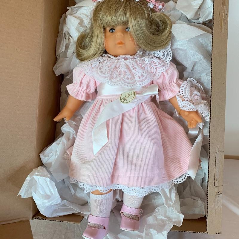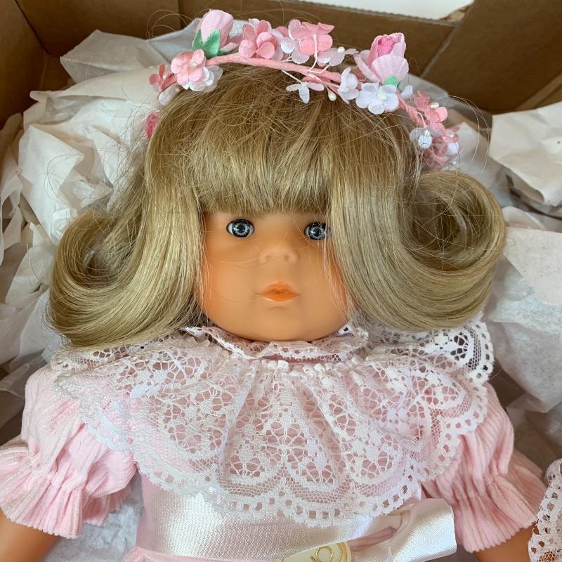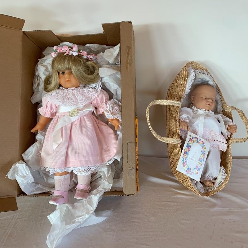 This duo of cuties is a sweet baby Lissi and a Corolle doll. The Lissi is complete with a basket with a tag for a Christening gift to a godchild. The 17.5” tall Corolle Doll in a cute pink and white outfit. These two are a sweet addition for any little child or doll collector. The Corolle doll is not in original box. Shipping available.
