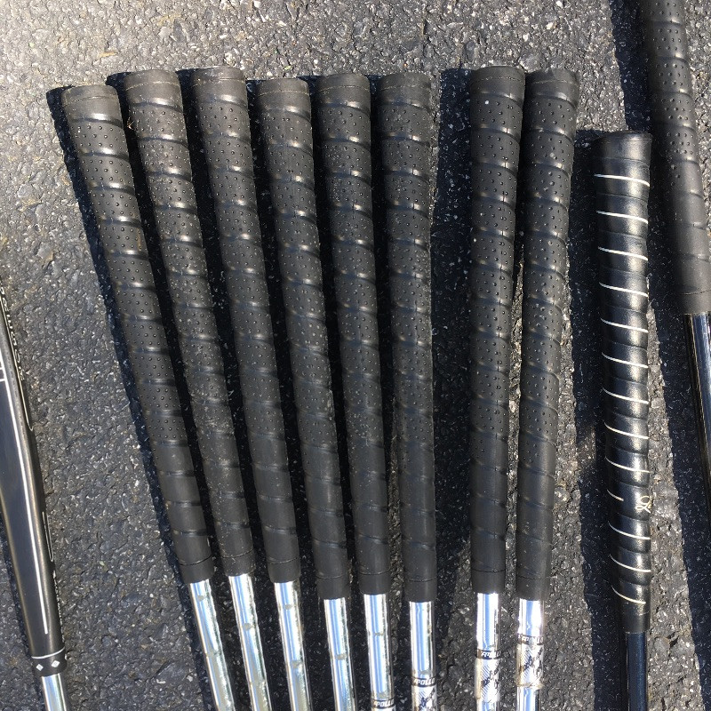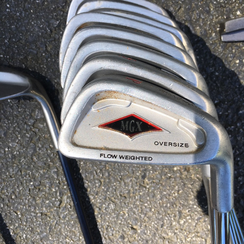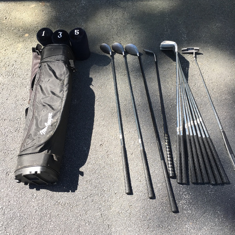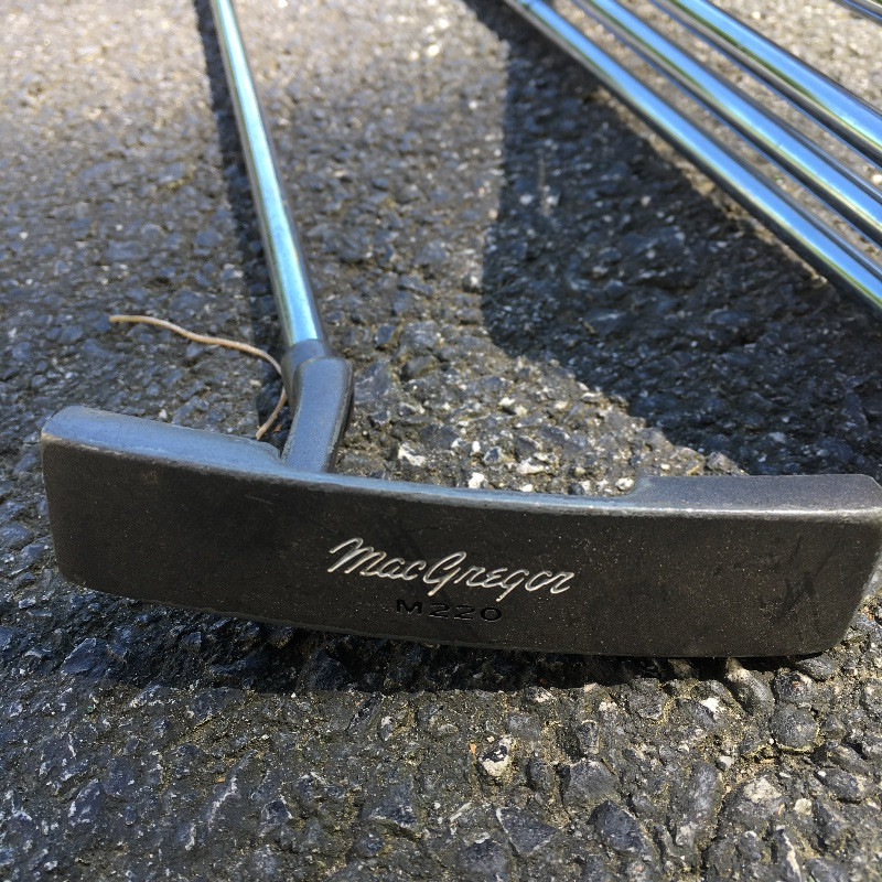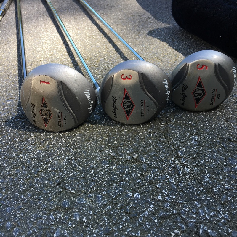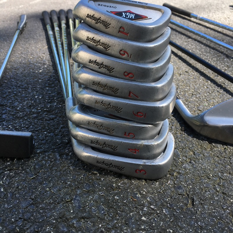 This MacGregor golf set includes three woods, eight MacGregor MGX irons, one MacGregor M 220 putter, one Diamond Golf iron and MacGregor bag. Longest wood measures 44.5”D.