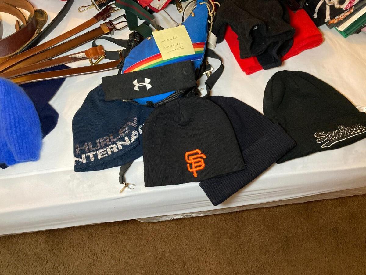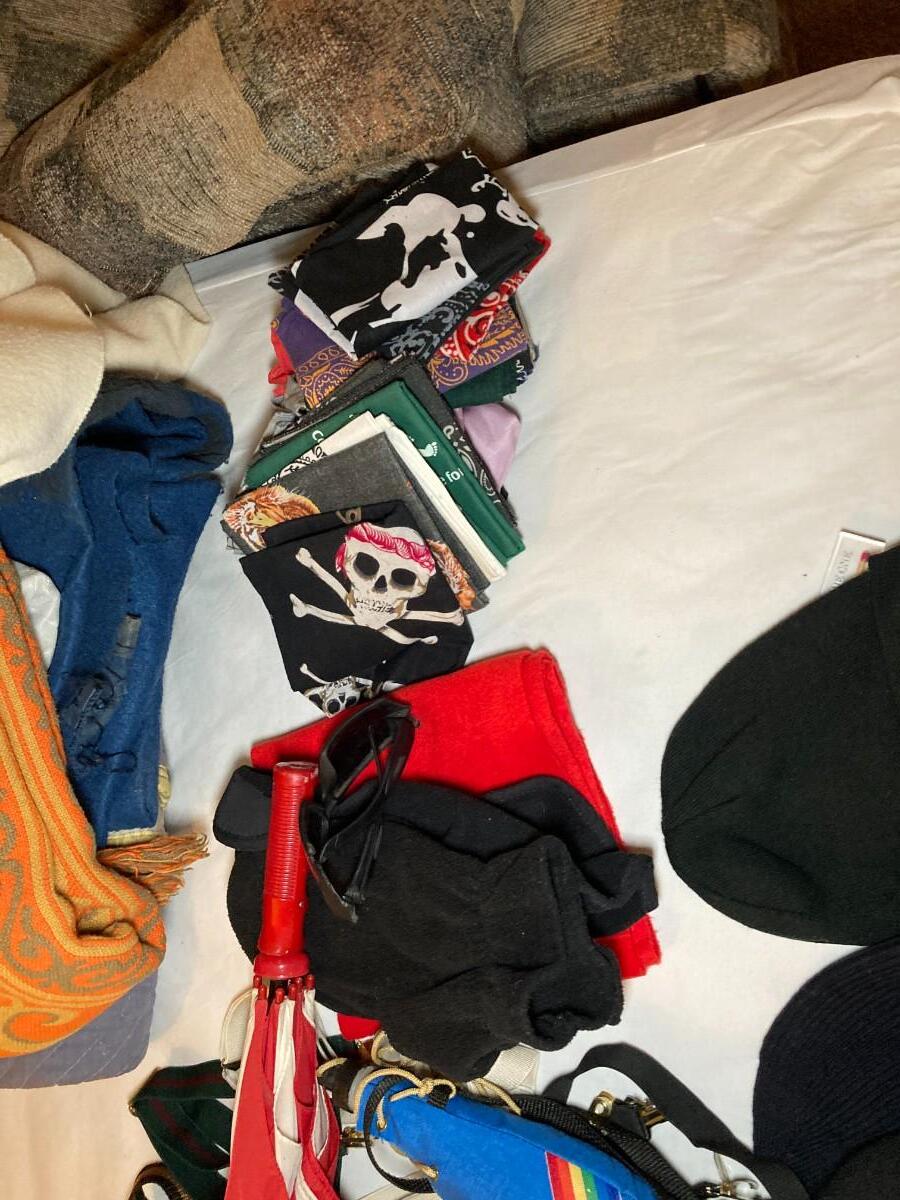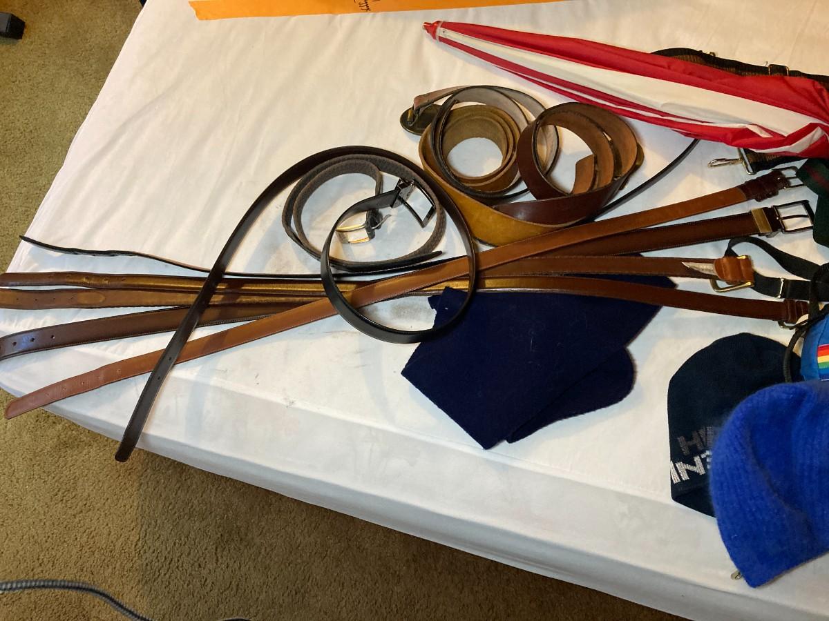 Leather Belts, beanies, bandannas. Includes red fleece scarf, black fleece gloves, umbrella.
