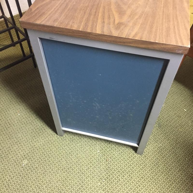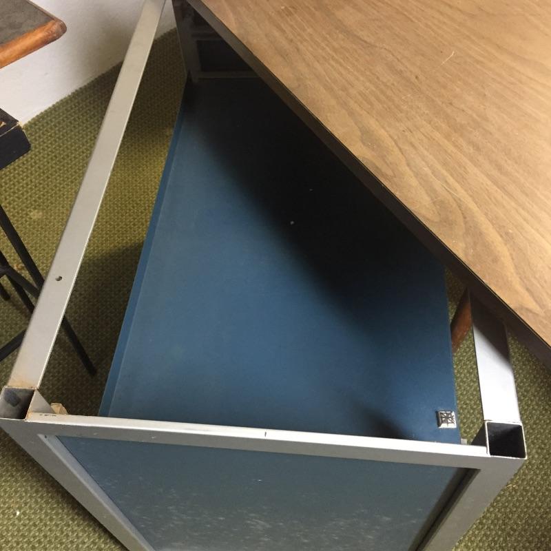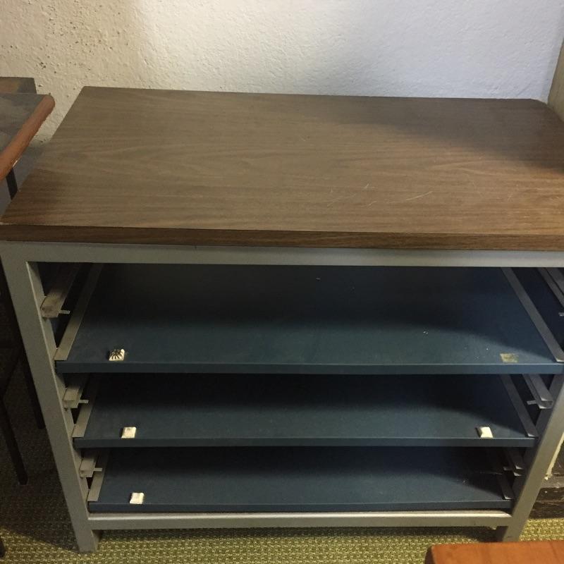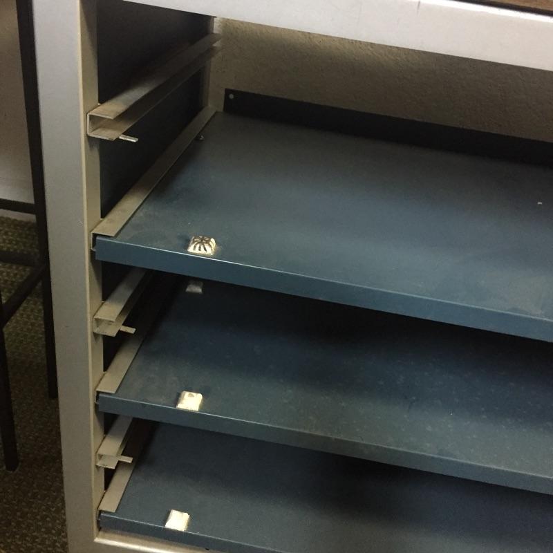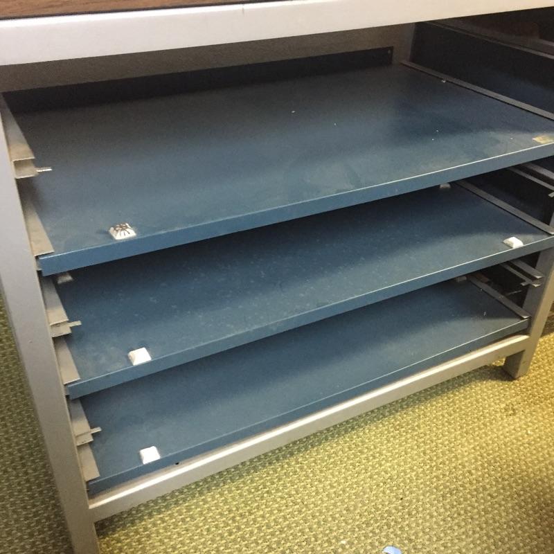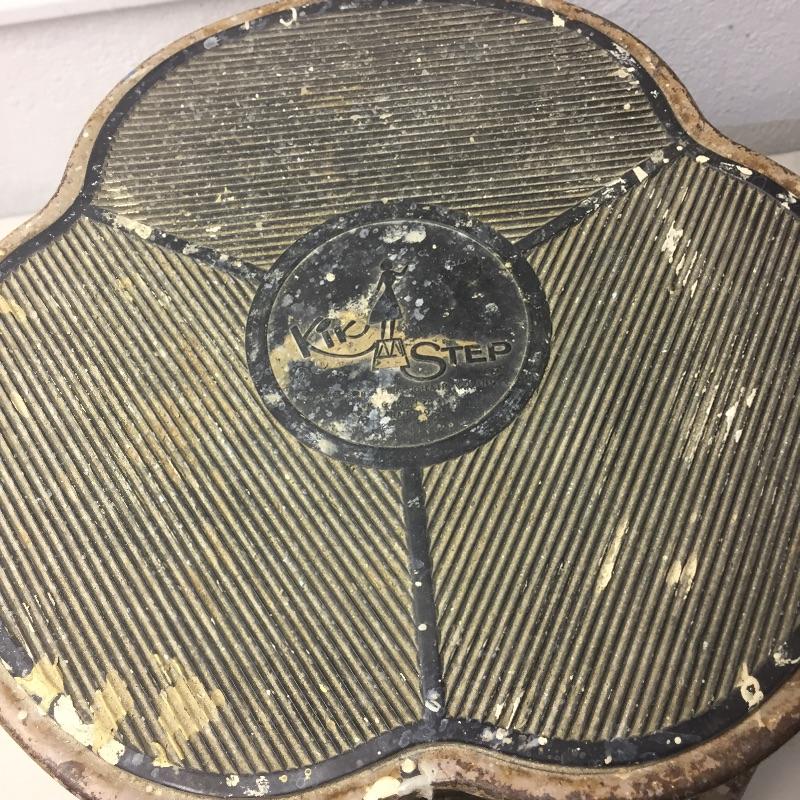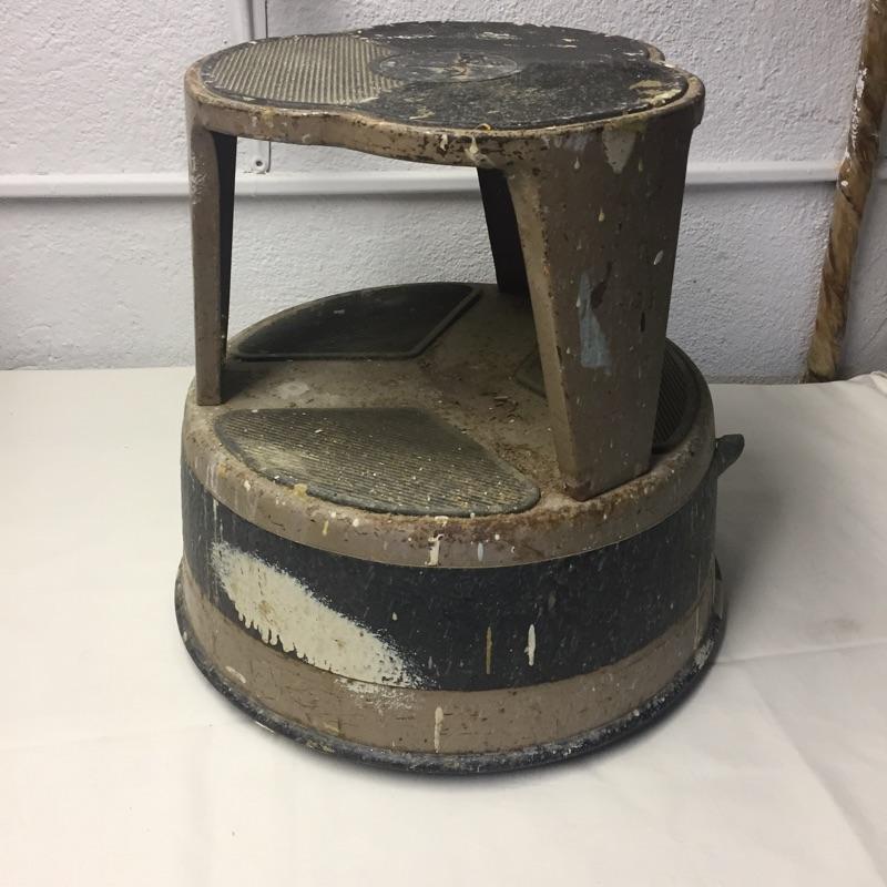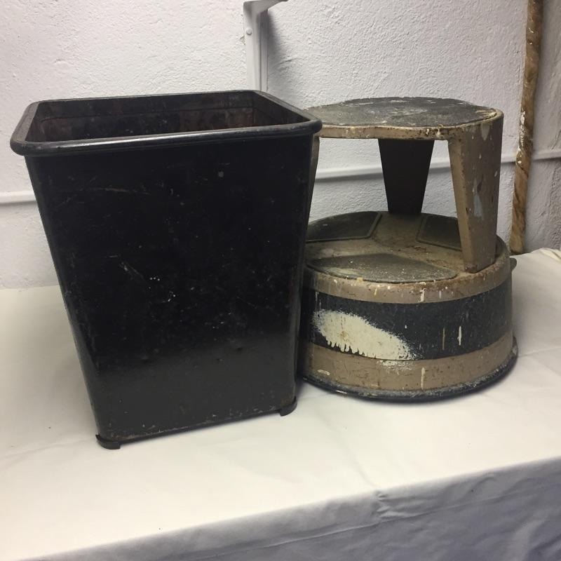 This heavy duty trio will last a lifetime. Great heavy metal shelving unit with shelves that slide measures 18.5” x 32.5” x 28”. A metal wastebasket can handle any trash. And a and footstool on wheels that can hold you steady. Wastebasket measures 13” x13” x 16”.