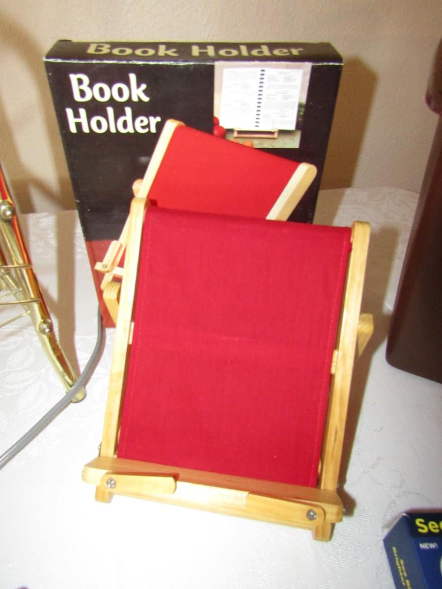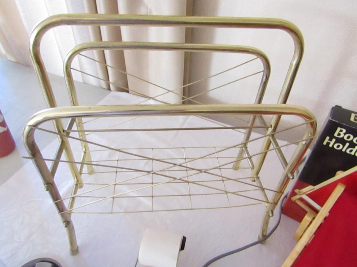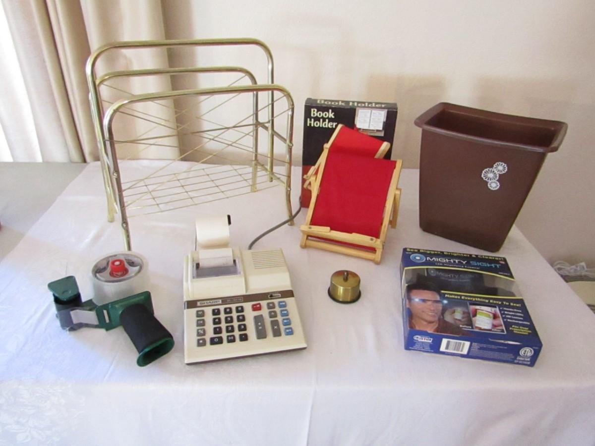 METAL MAGAZINE RACK, BOOK HOLDER, WASTE CAN, BRASS HOLDER FOR A ROLL OF STAMPS, PACKING TAPE AND DISPENSER, MIGHTY SIGHT LED MAGNIFYING EYEWEAR