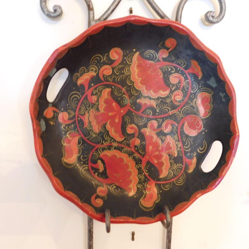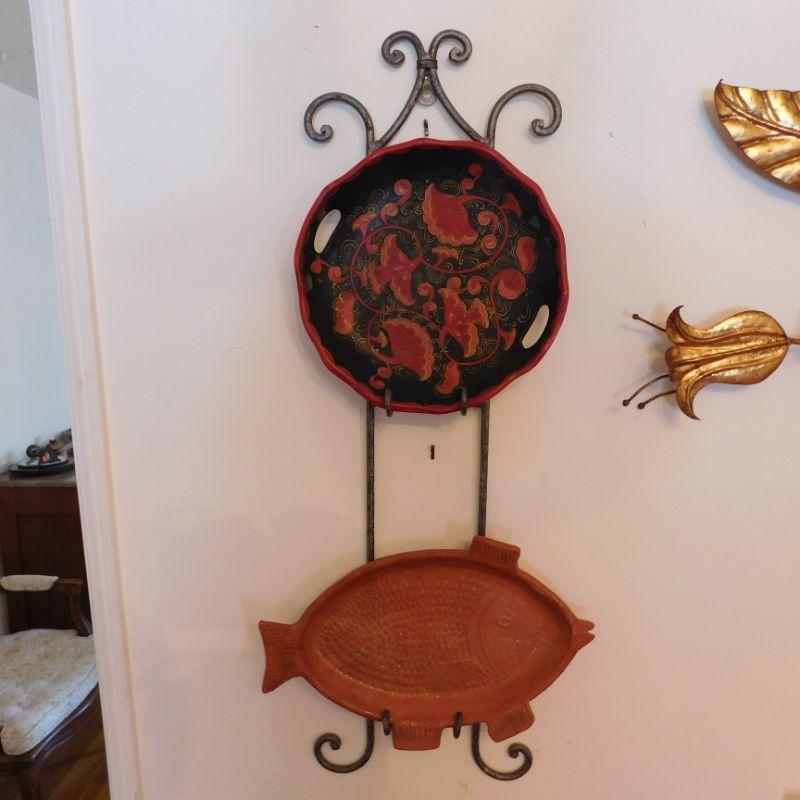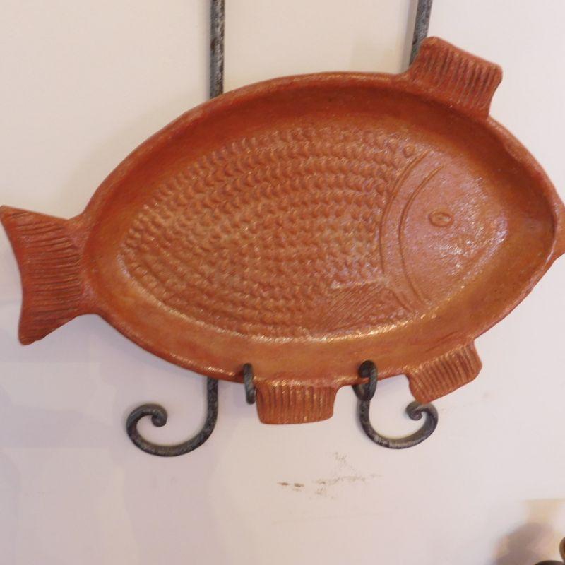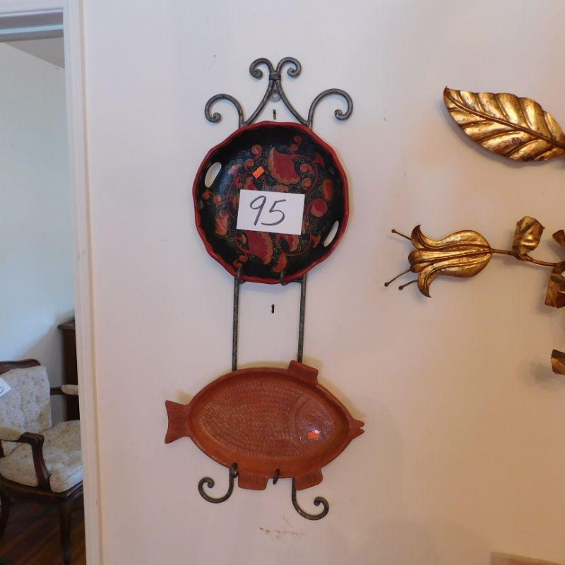 Lot 95 one hand painted wood plate plus one fish plate and plate rack