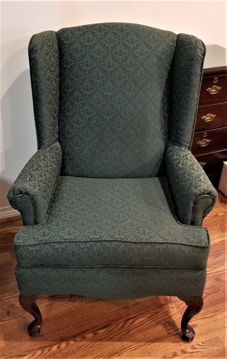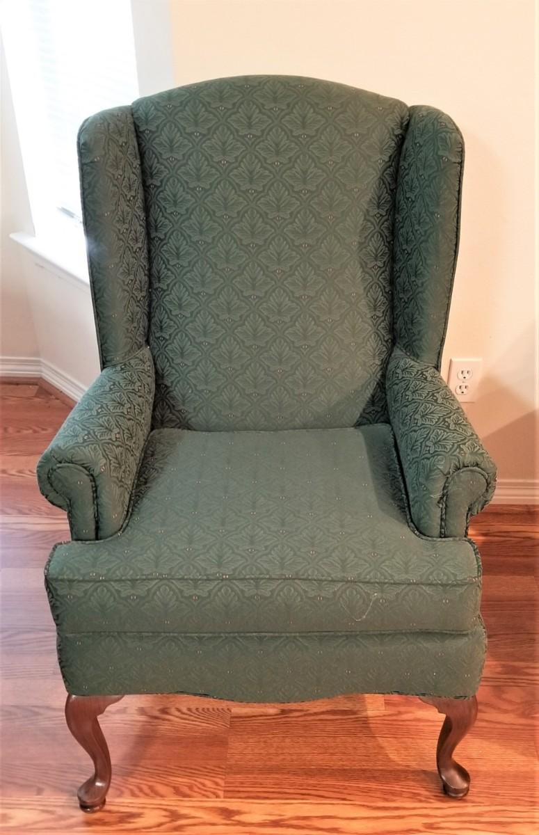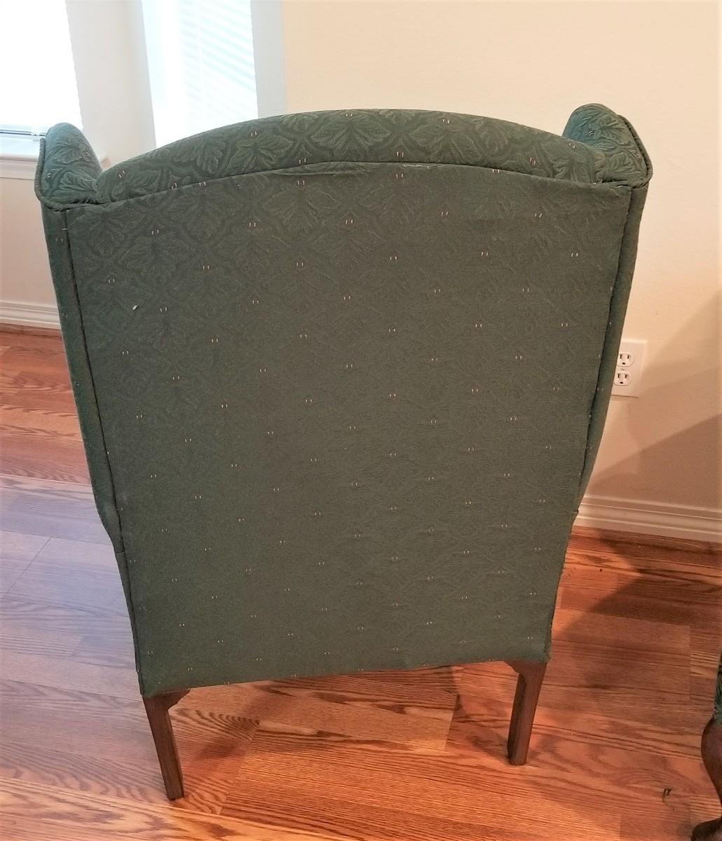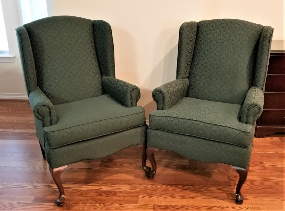 Nice comfy matching pair of Winged-Back Chairs - clean. 24" deep, 28" tall, 25" across. Note: these are NOT recliners.