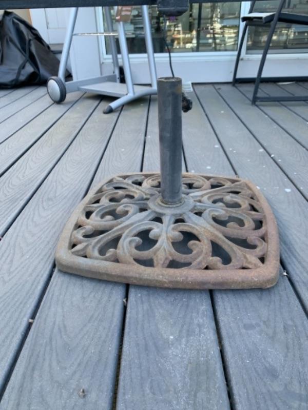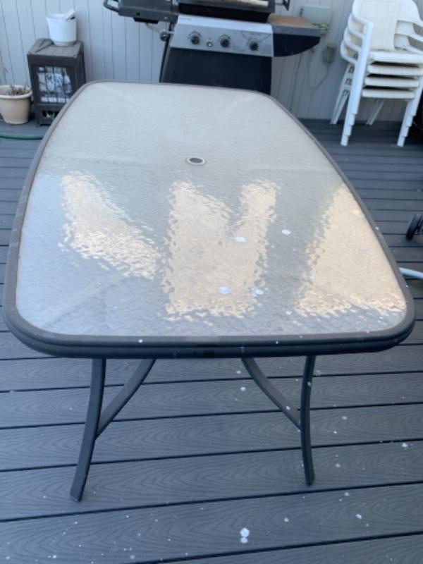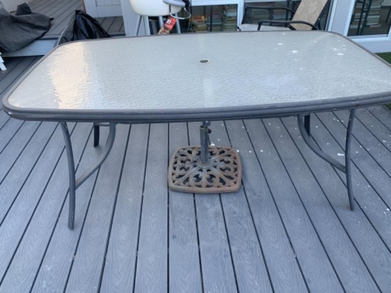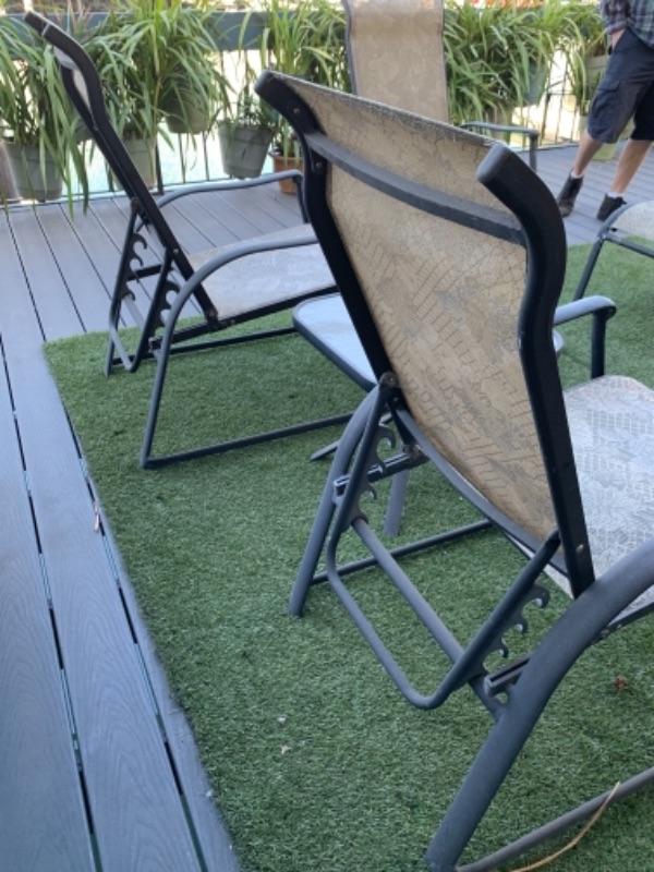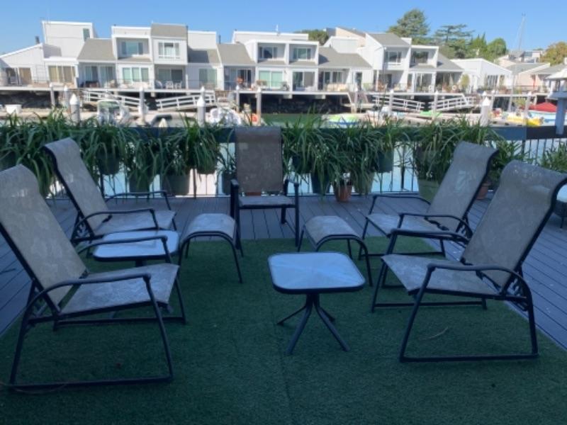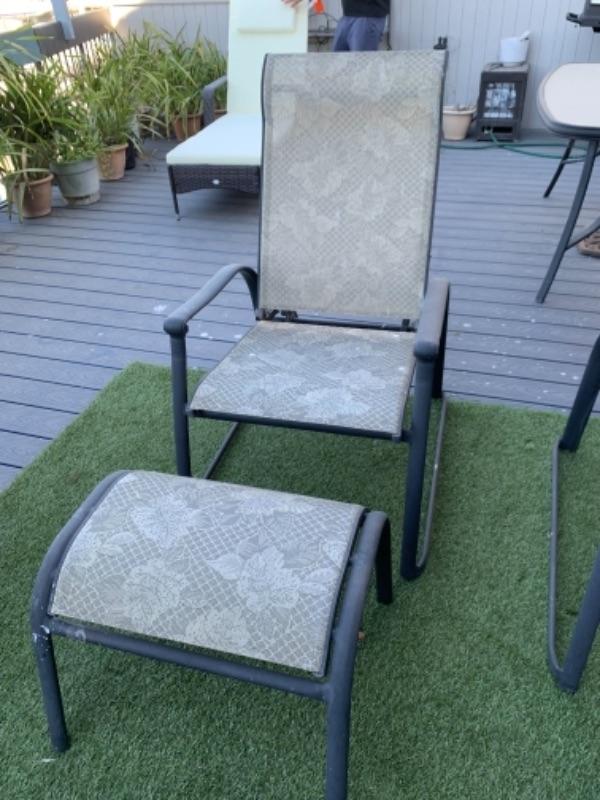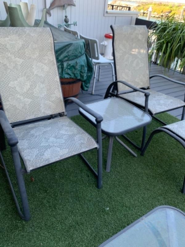 Lot 95. Patio set“”6 reclining chairs, table (65”x40”), umbrella stand, ottomans and small glass tables--$125