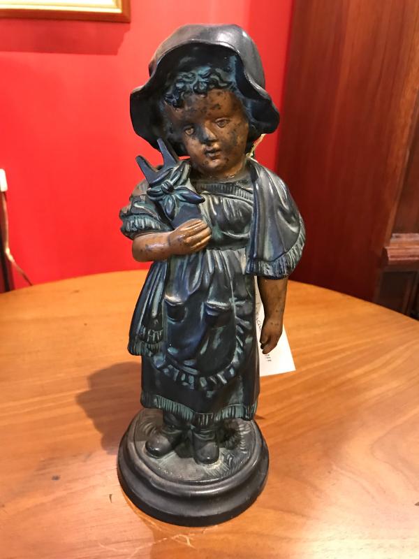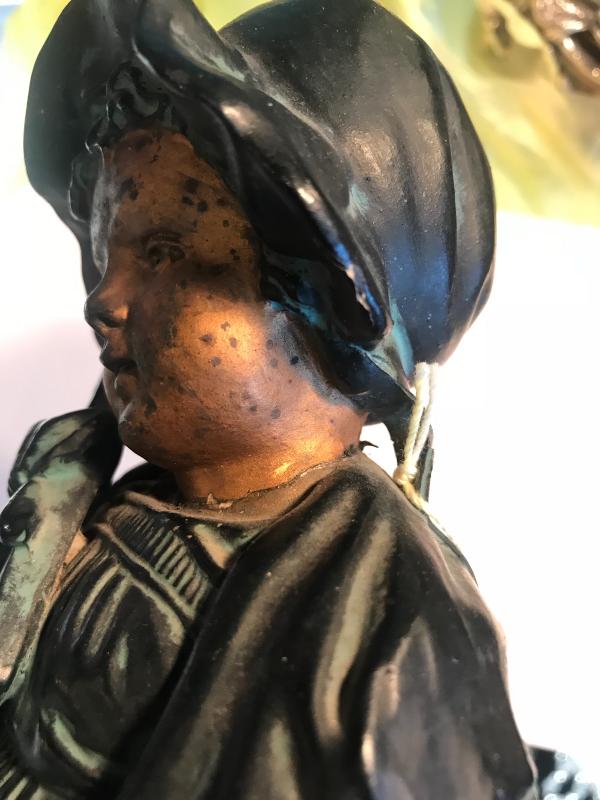 Very rare victorian chalkware figurine of girl in Victorian maid's attire and bonnet holding a boot jack. Gilt and faux bronze finish. Great condition. 10 1/2" H