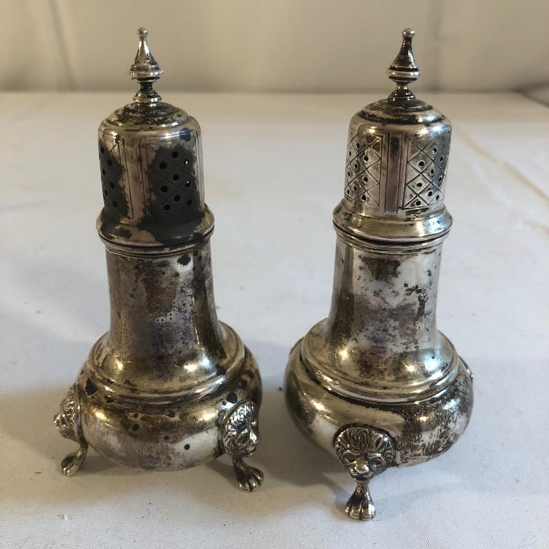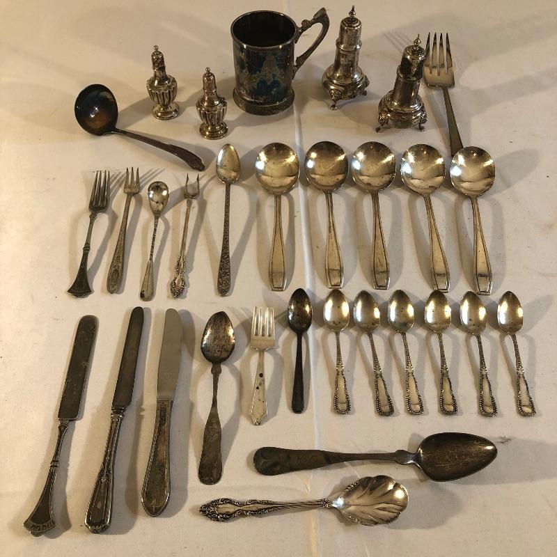 Classic pieces from well known silver companies like Reed & Barton, Community, 1881 Rogers, and more. One spoon is marked sterling, see images. Lot includes a variety of traditional and unique silverware, a set of large salt shakers, a set of small salt shakers, and a Reed & Barton mug. Shipping available.