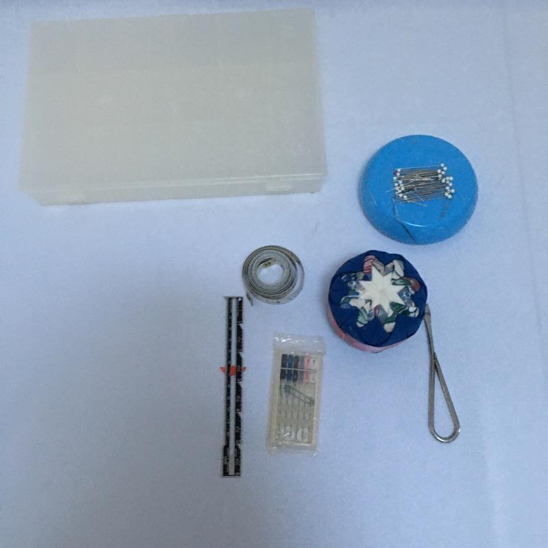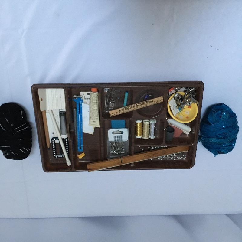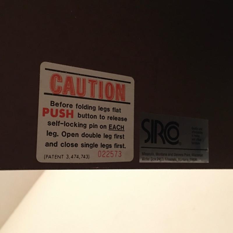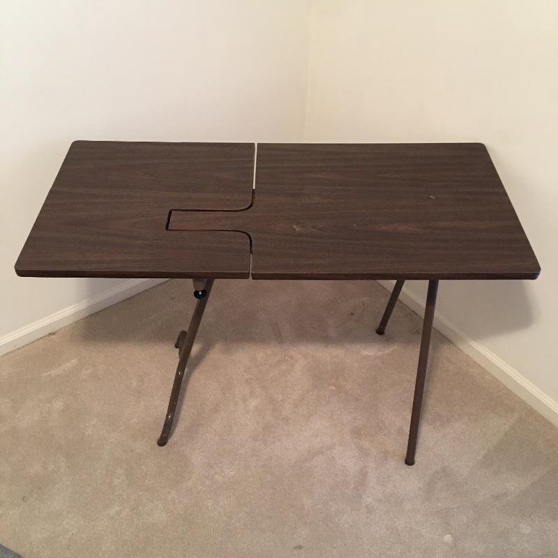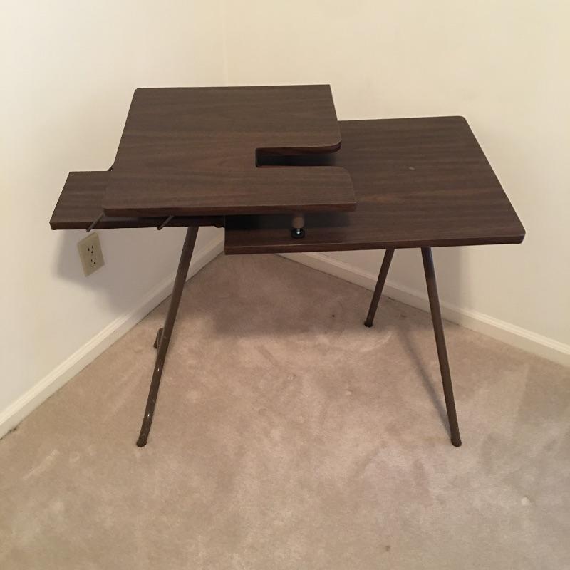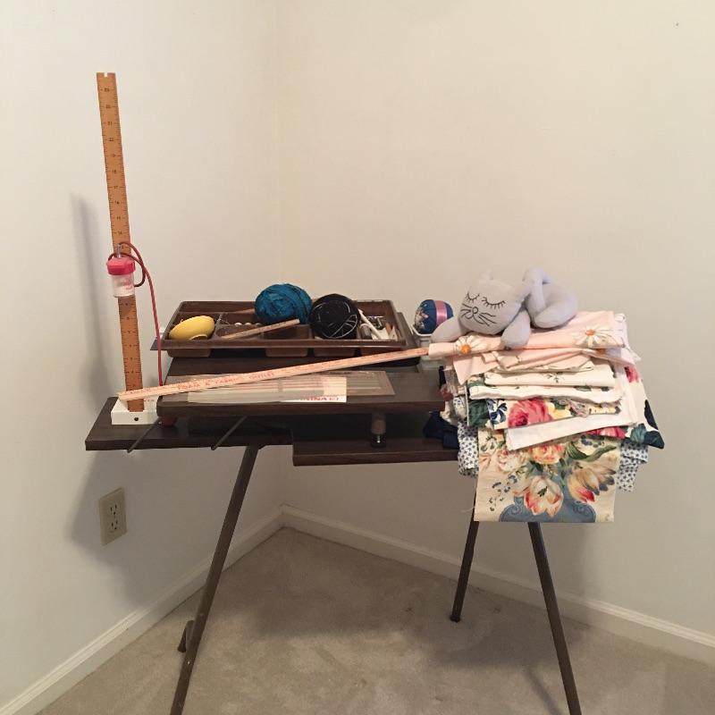 Sirco portable folding two tier sewing and craft table with Singer skirt marker, pins and cushion, fabric remnants, rulers, swivel chair and more. Table measures 20” x 42” x 26.5” when top is not raised.