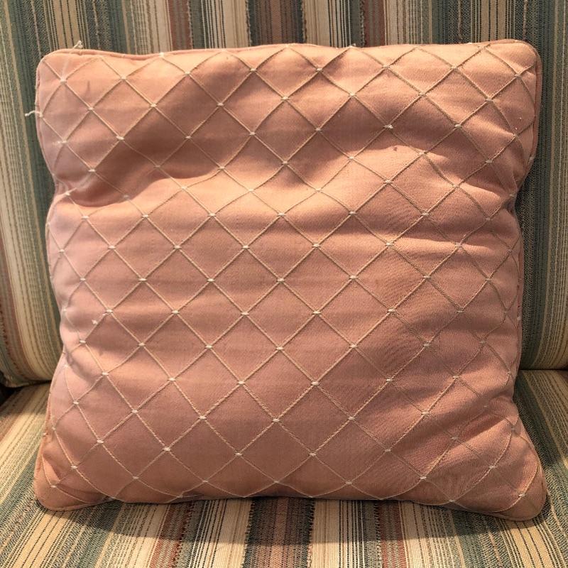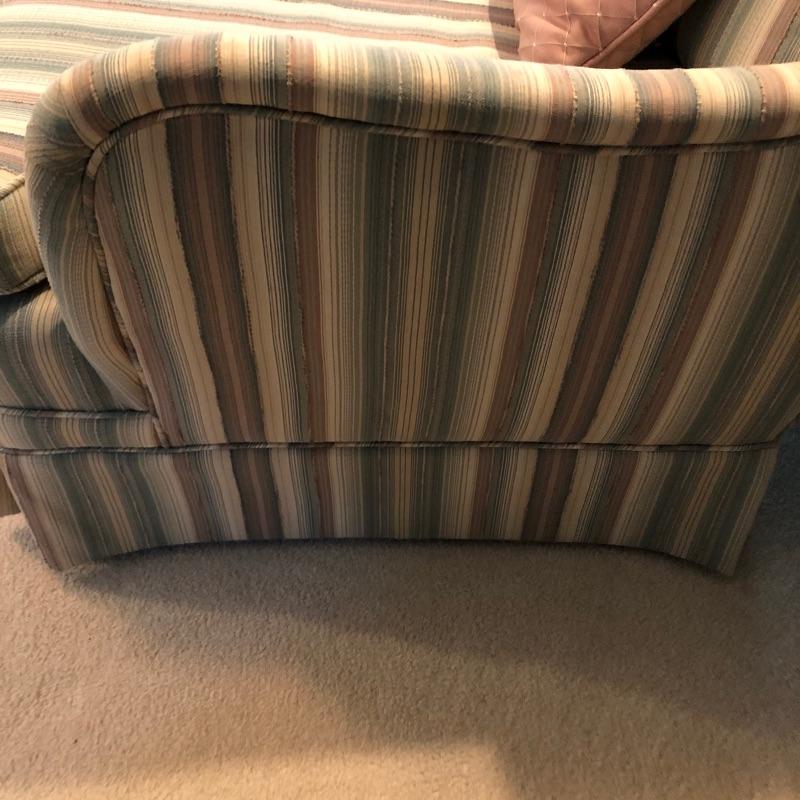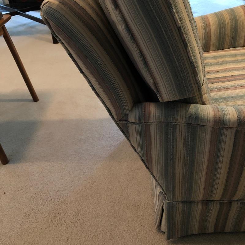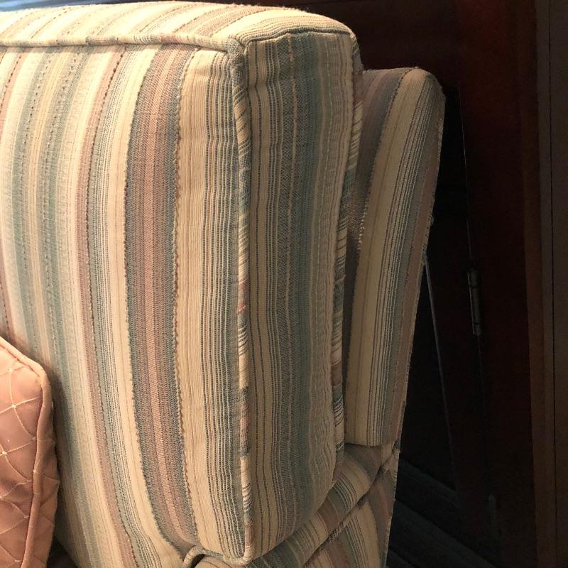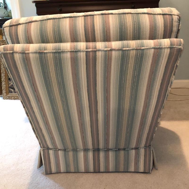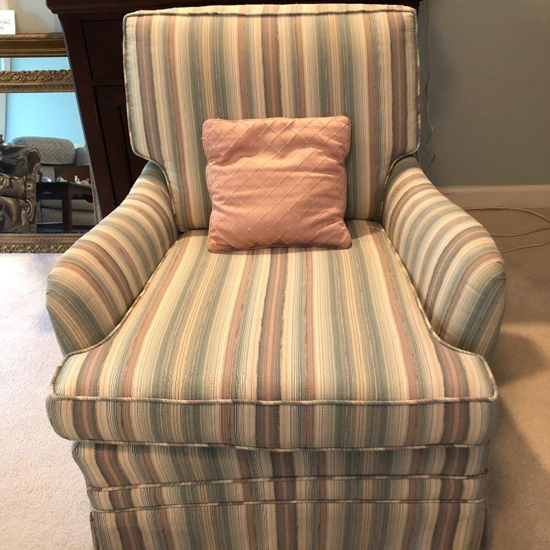 This adorable striped chair is perfect for placing in the corner of your living room or adding to your a den. It comes with a small pink pillow that matches the colors in the chair perfectly. The chair sits at an angle which makes sitting in it that much more comfortable. Add this chair to any living space to add a pop of color. The height of the seat is 18". The chair measures 36x31x35 inches.