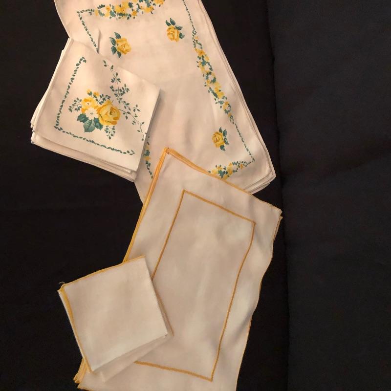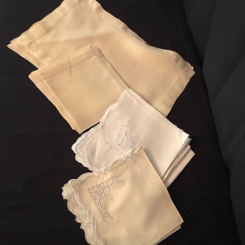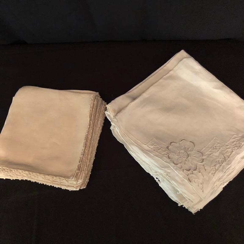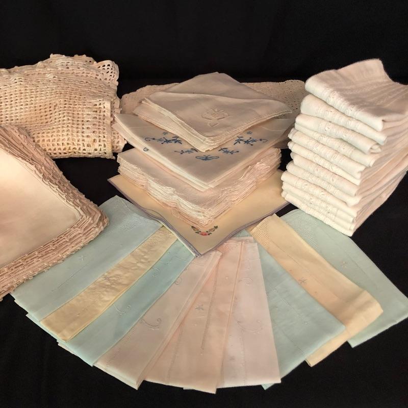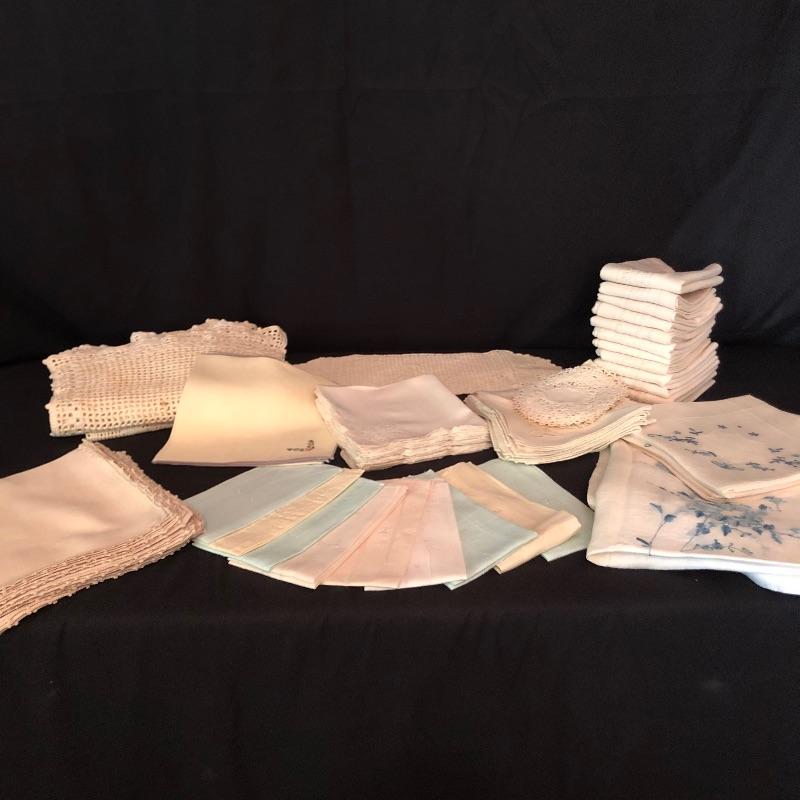 This is a wonderful large assortment of top quality dining table linens that have been well cared for. Lot includes a wide variety of mostly napkins, some with embroidery and almost all are either ivory, white or pale tan. There are a couple of tablecloths and doilies as well. Largest tablecloth measures 66” x 96”.
