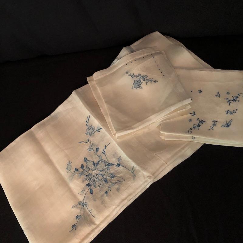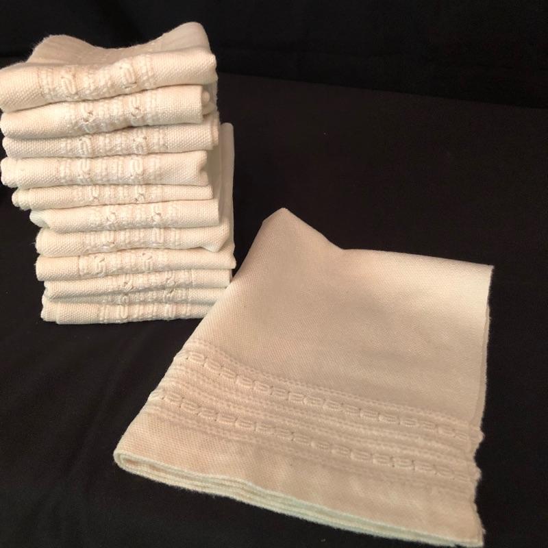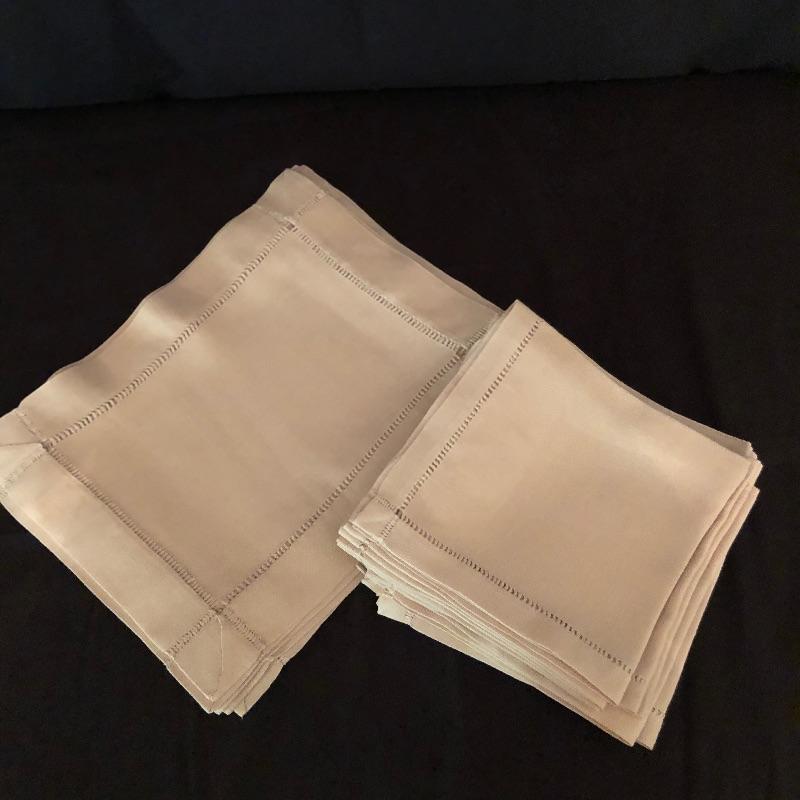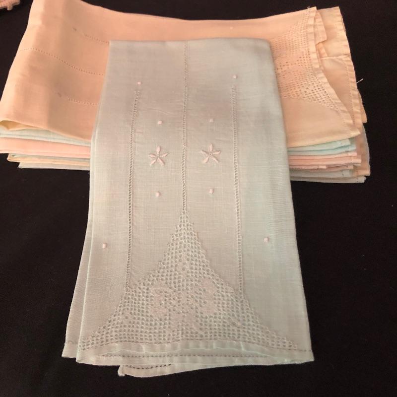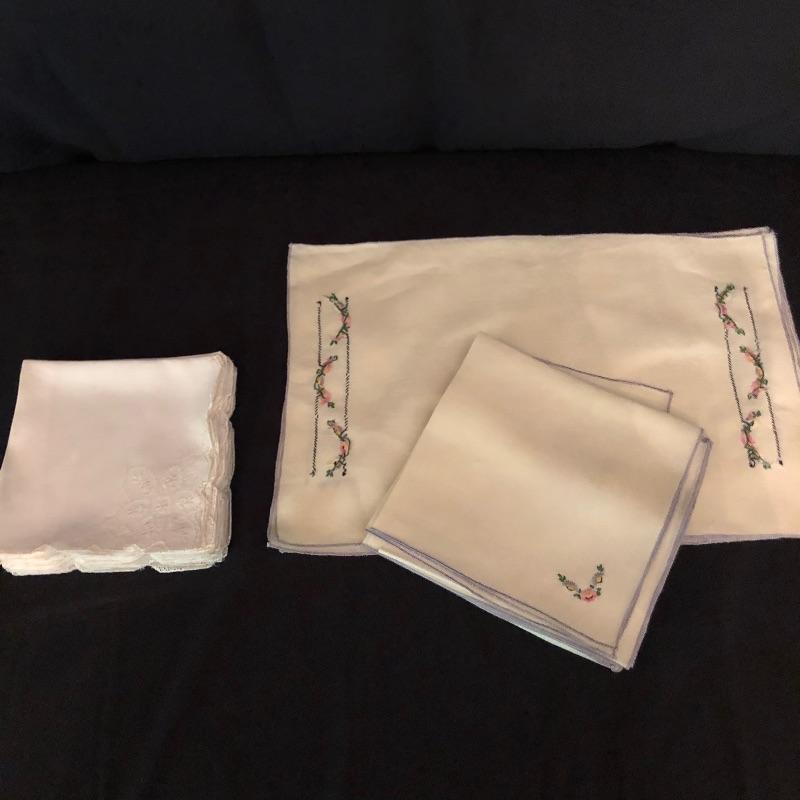 This is a wonderful large assortment of top quality dining table linens that have been well cared for. Lot includes a wide variety of mostly napkins, some with embroidery and almost all are either ivory, white or pale tan. There are a couple of tablecloths and doilies as well. Largest tablecloth measures 66” x 96”.