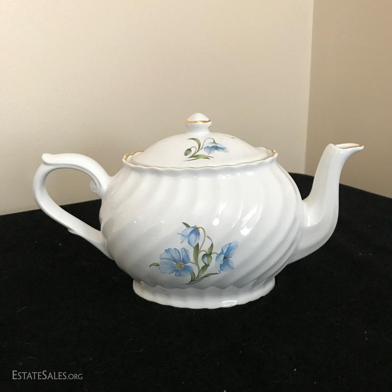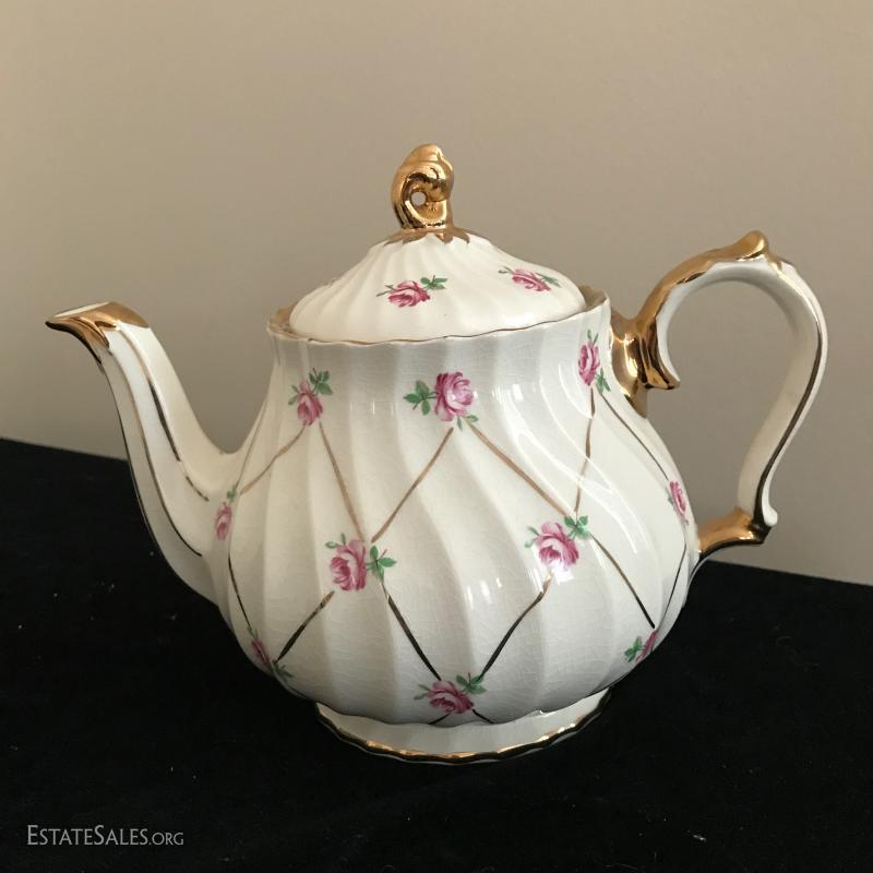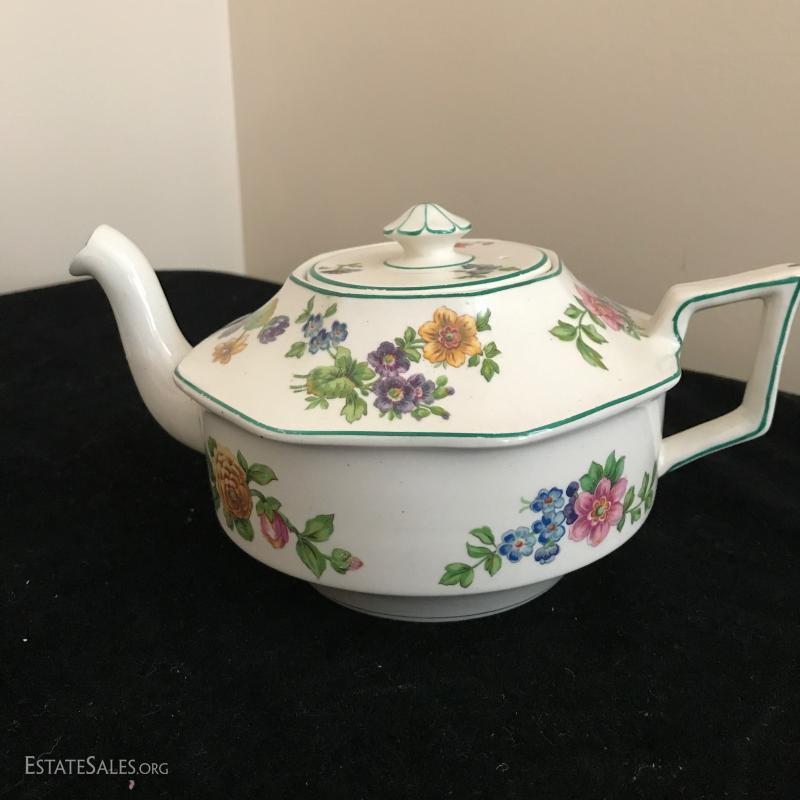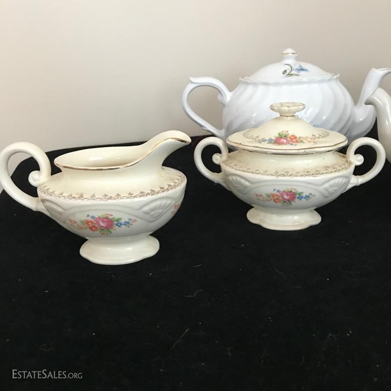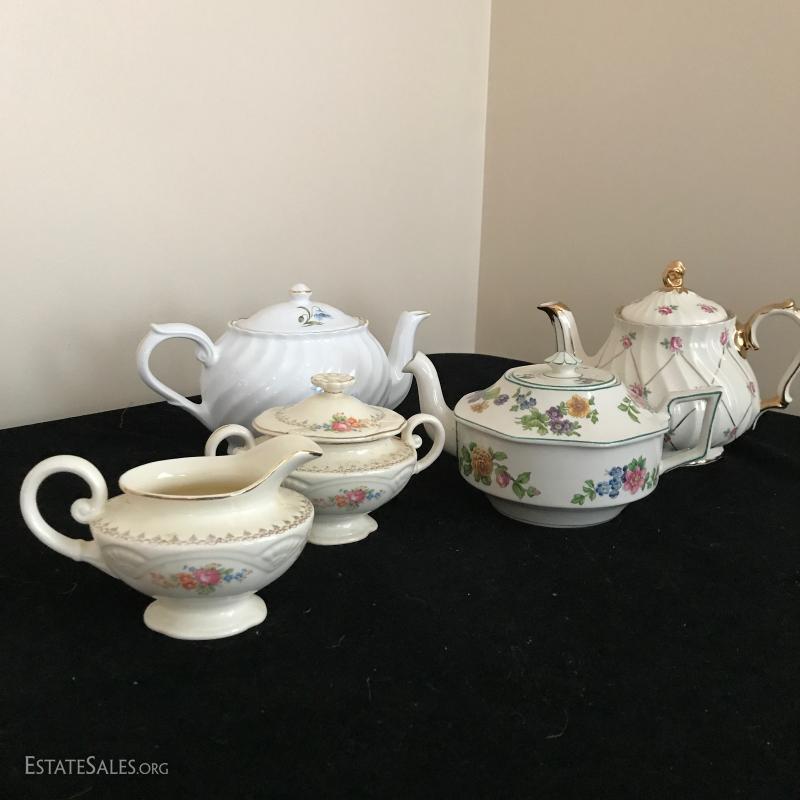Three English teapots and a USA cream and sugar set. All damage free. This lot is available for shipping or local pick up in Mills River, NC only.