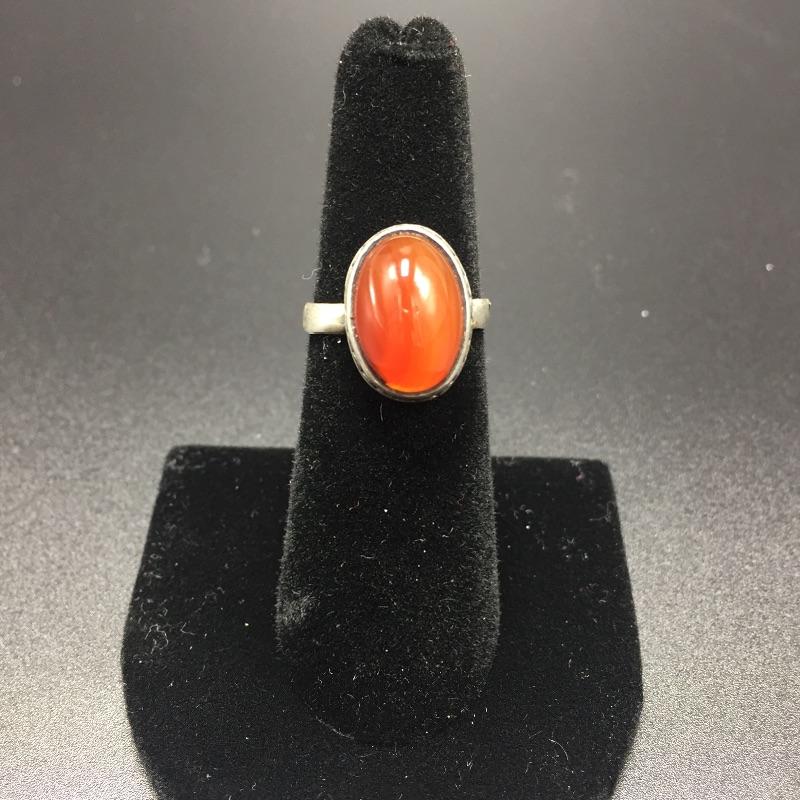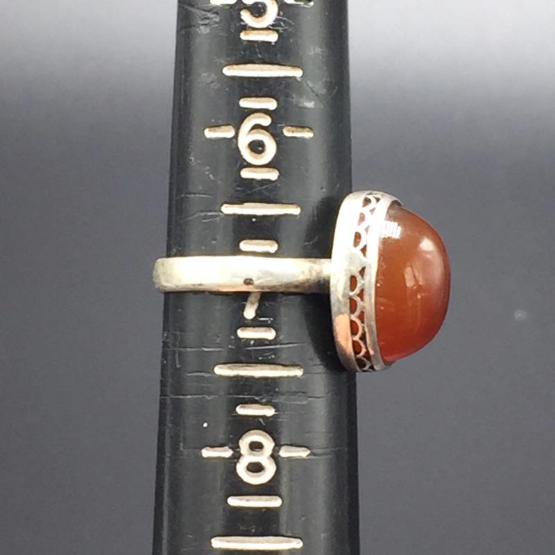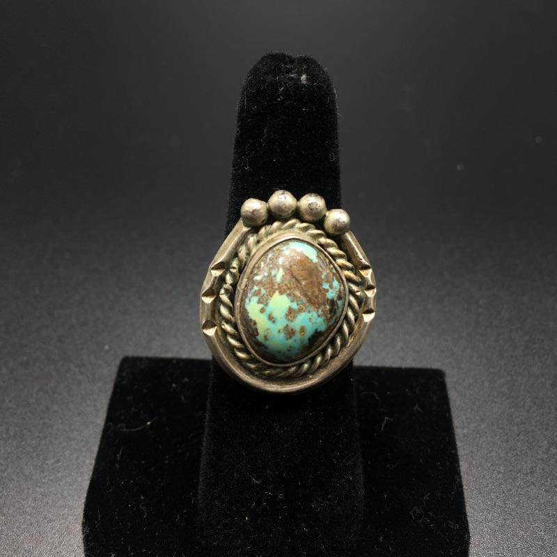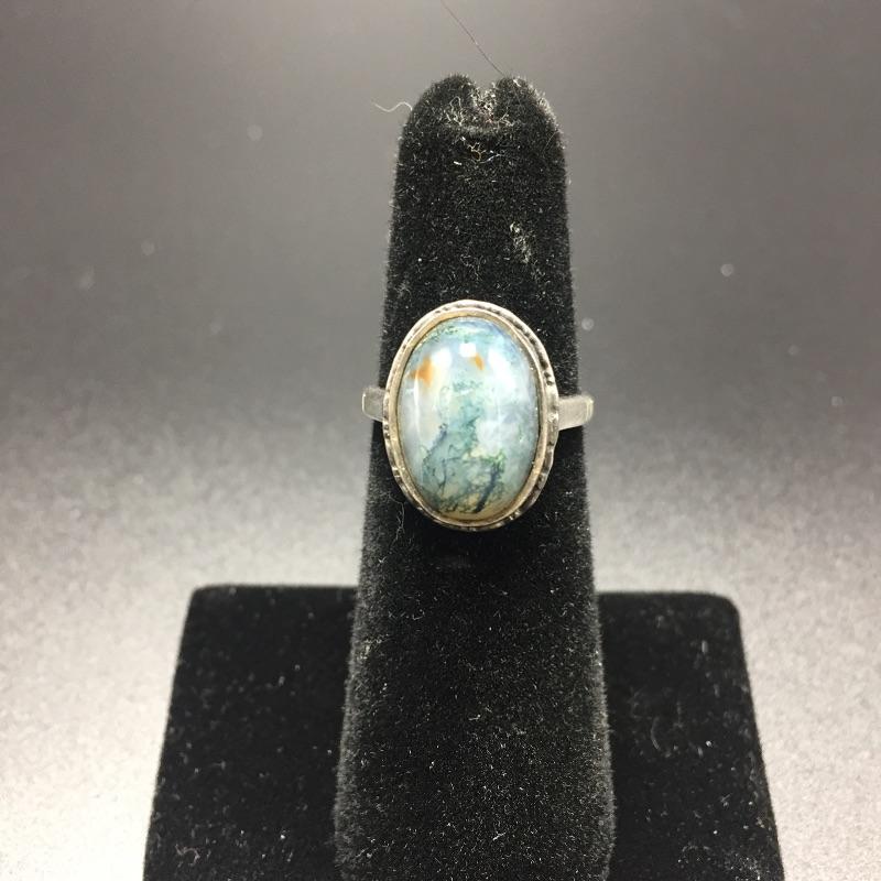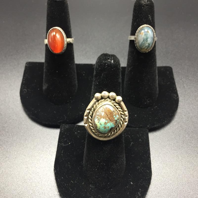Three rings in a variety of stones.Two rings are unmarked and blueish ring is marked England. See pictures for sizes.