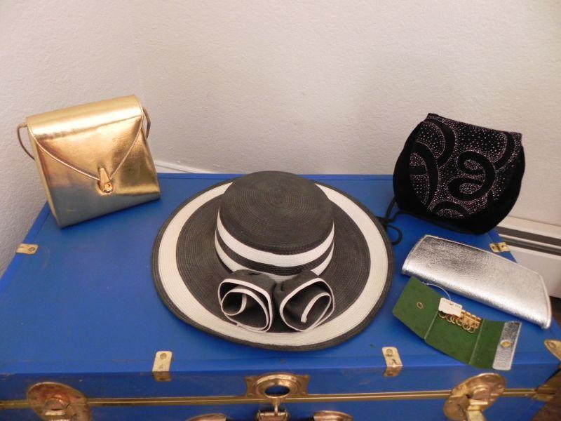 3 FASHION PURSES, ONE WITH MATCHING KEY HOLDER, FLOPPY HAT AND SMALL TRUNK 46X24"