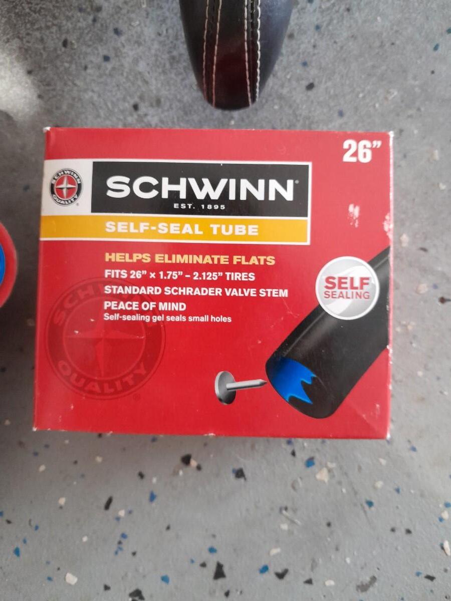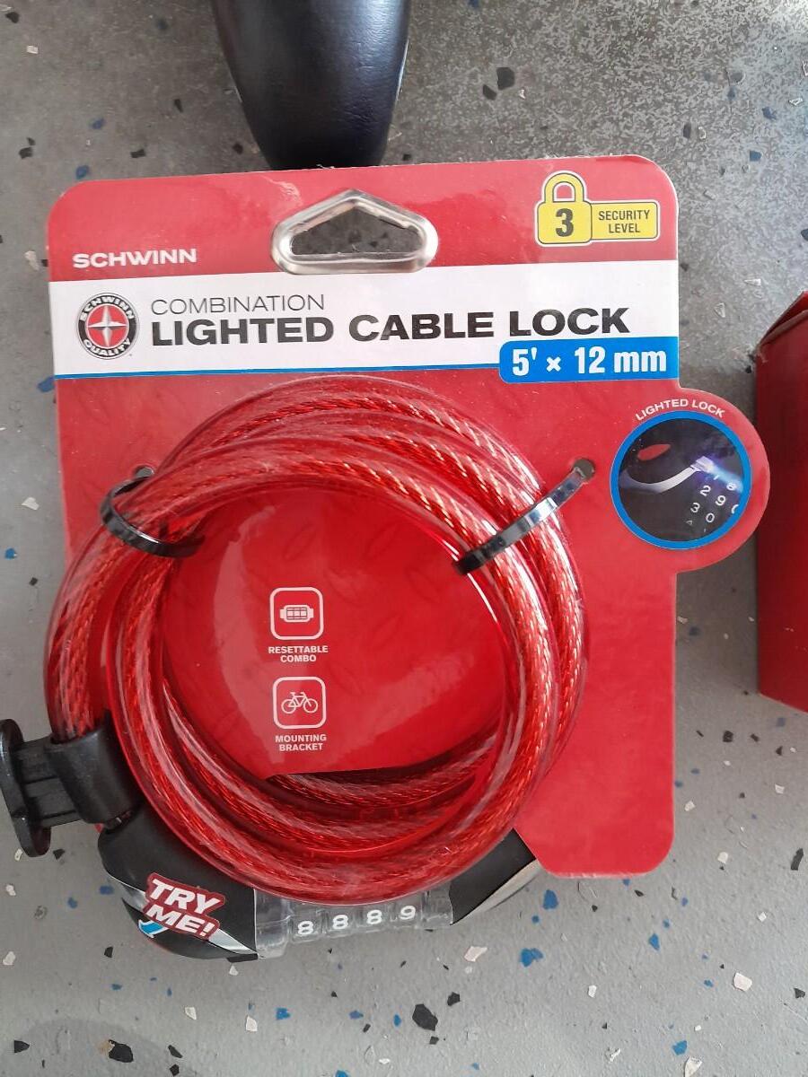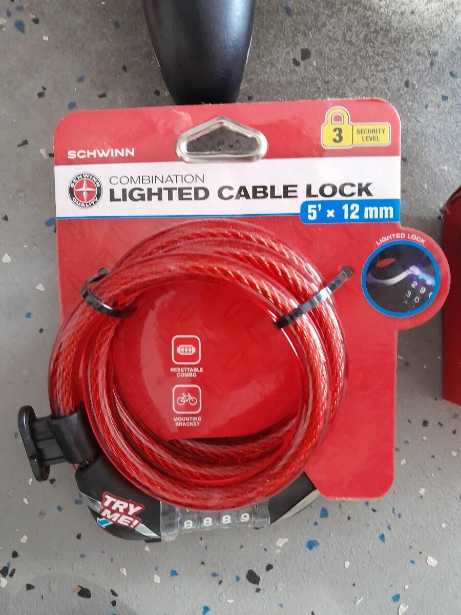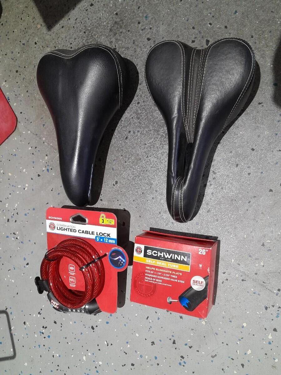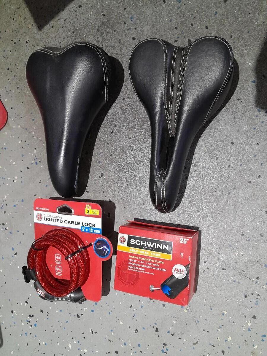TWO BICYCLE SEATS, A 26" TIRE TUBE AND A NEW COMBINATION BIKE LOCK
