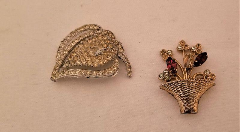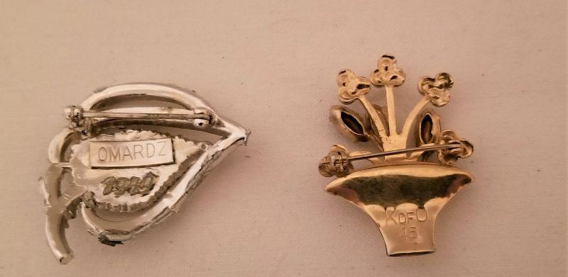 Two vintage Mardi Gras Krewe favor brooches - the rhinestone leaf is marked "Omardz 1949" - the Flower Basket is marked "K of O, '48." Osiris, perhaps? Both have stones missing. Flower basket 1.5" tall, leaf 2" across.