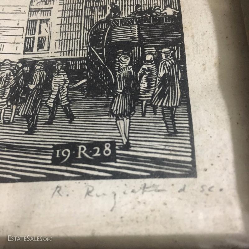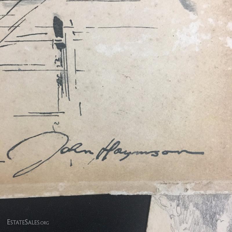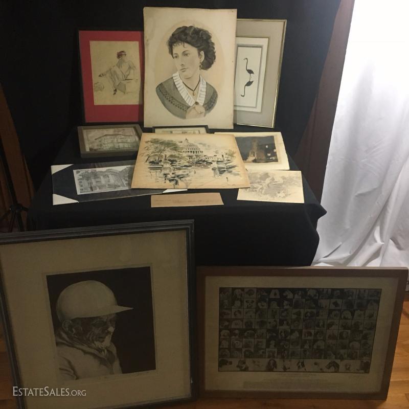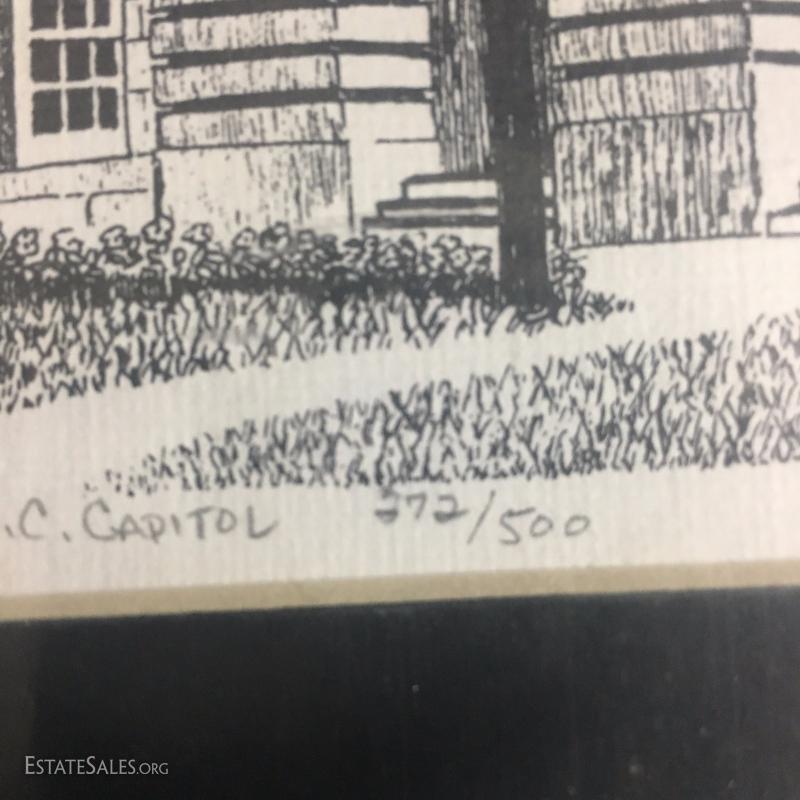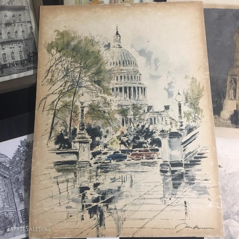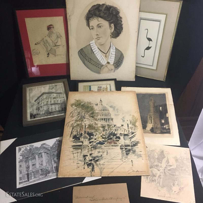 Eleven framed and unframed signed prints. Various artists. Large Old Man signed Folsom III framed 26.5"l x 24"w. Flamingo is framed at 17.5"l x 11"w. Dog poster framed and signed by a George Ford Morris 26"l x 20"w. Watercolor by Bottomley of Edith Cavells monument. 25.5"l x 11"w Lots of others. See photos.