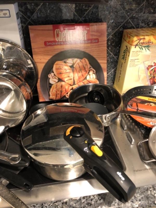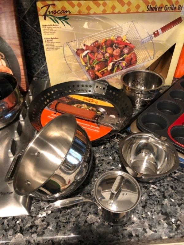 Lot 95. Various unused cookware“”baking dishes, muffin tins, stir fry baskets for grill, pressure cooker, indoor grill, roast rack, pots and pans--WAS $120““NOW $90