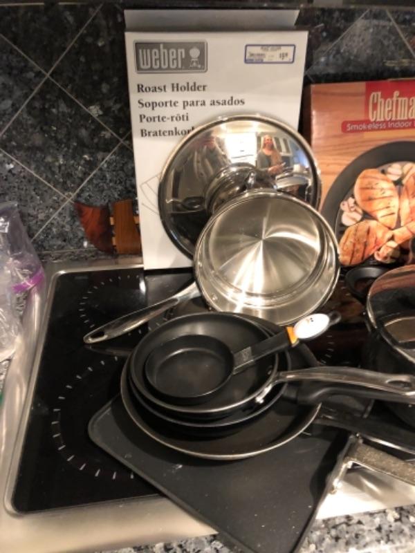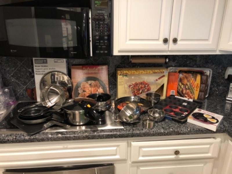 Lot 95. Various unused cookware“”baking dishes, muffin tins, stir fry baskets for grill, pressure cooker, indoor grill, roast rack, pots and pans--WAS $120““NOW $60