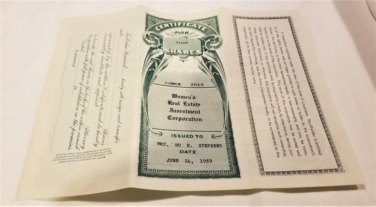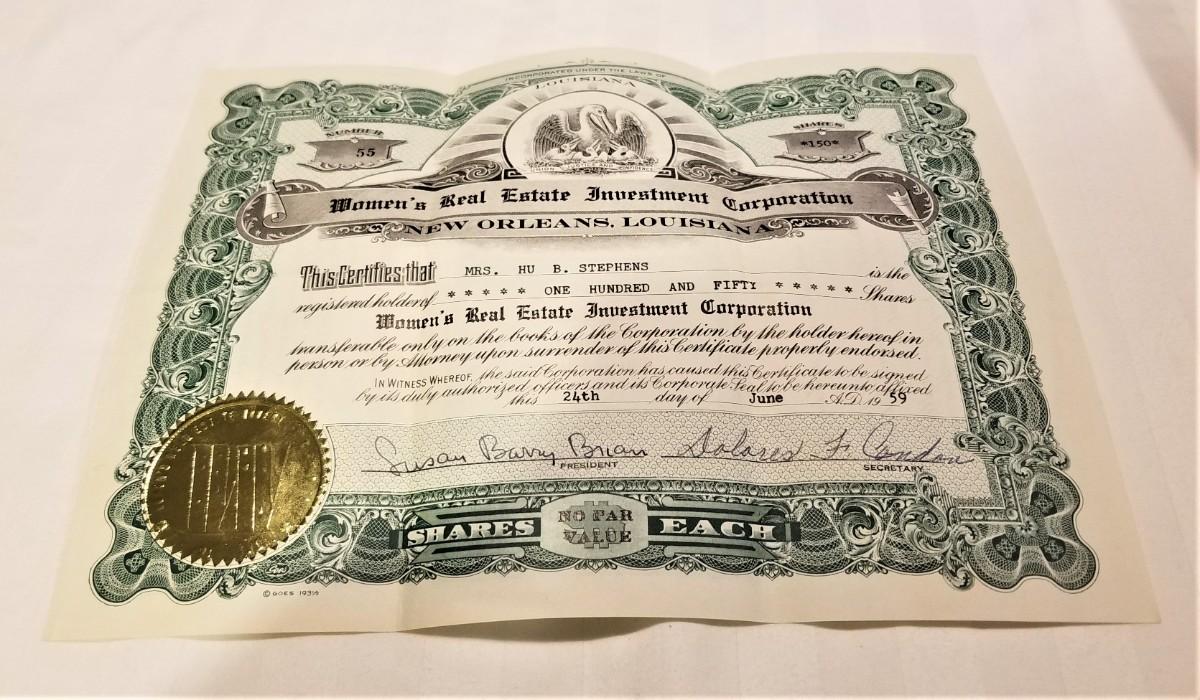 Original stock certificate for 150 shares of the Women's Real Estate Investment Corporation, New Orleans, Louisiana - issued in 1959. Excellent condition. Measures 8.5" x 6.5".
