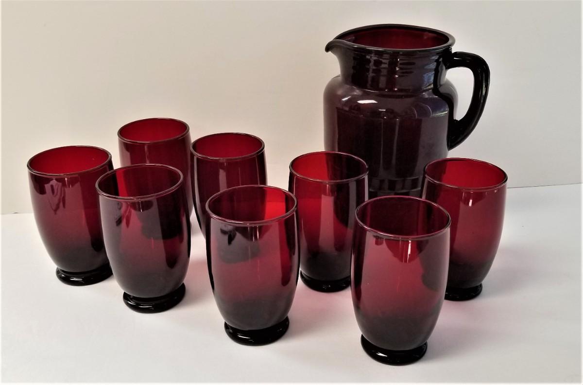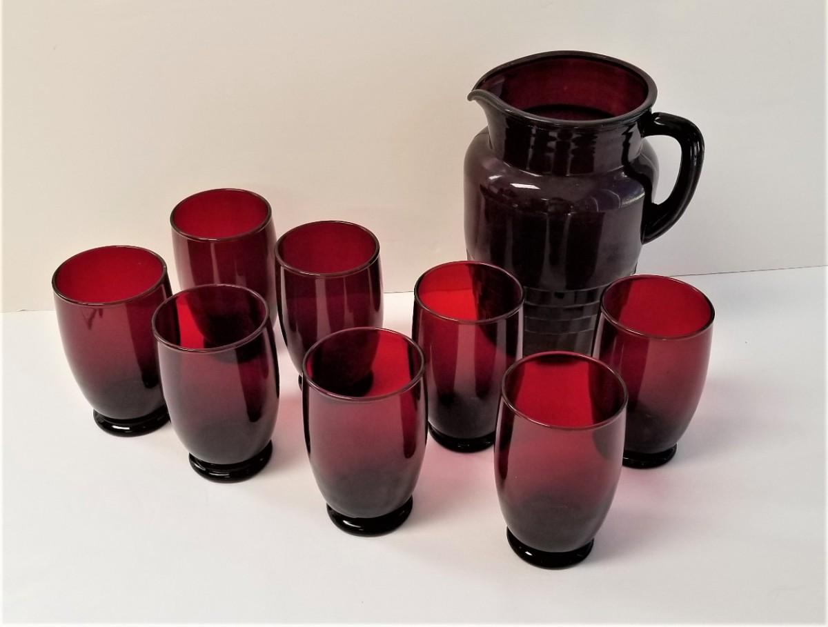 Lot #95  Vintage Ruby Red Pitcher and 8 Glasses