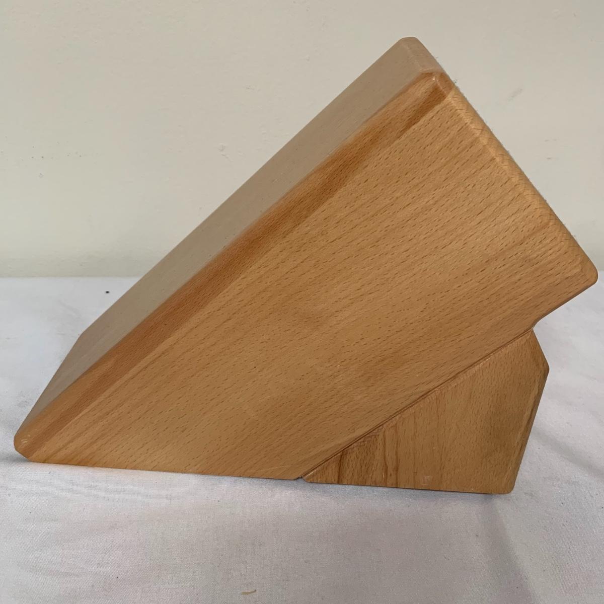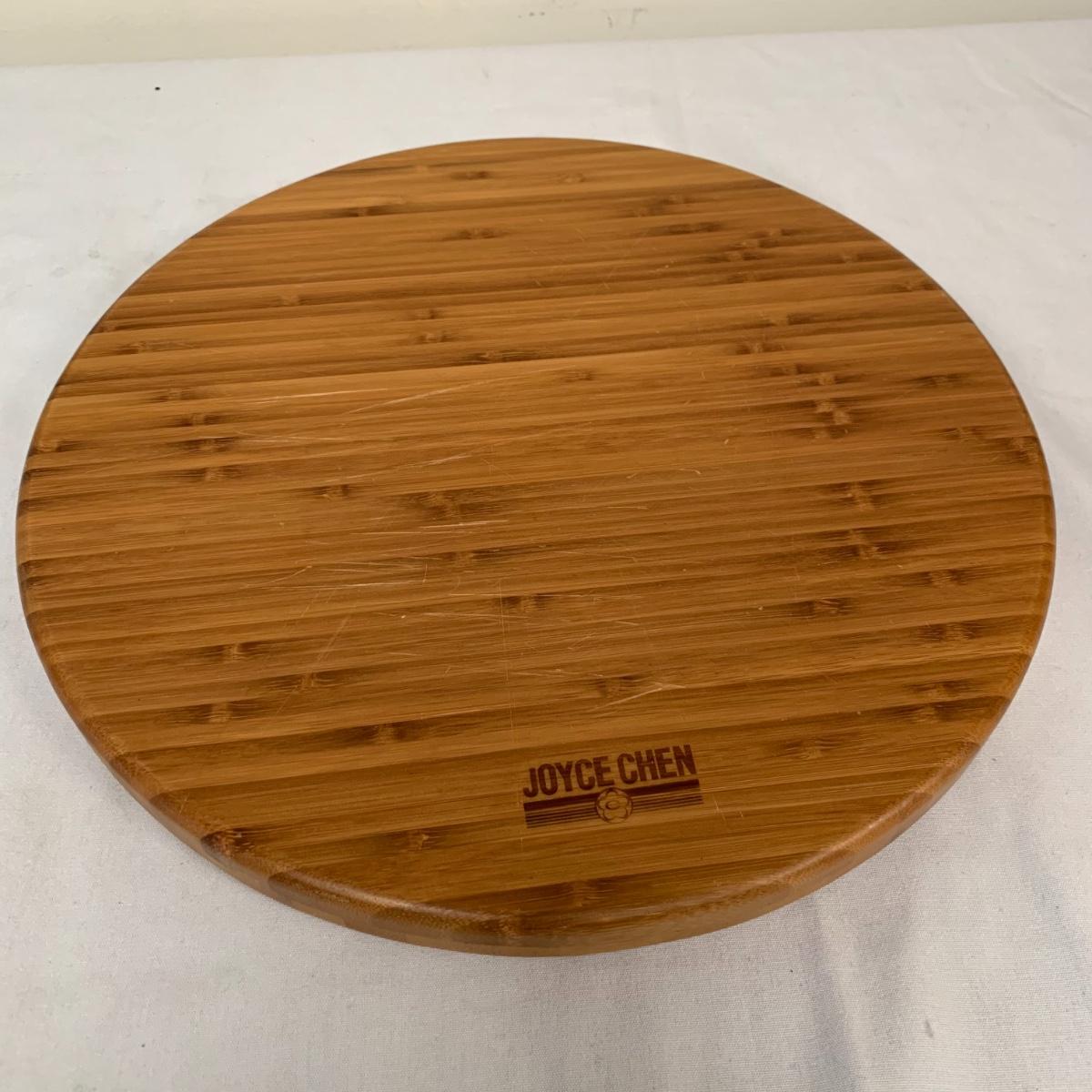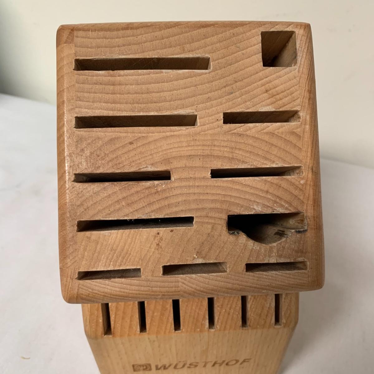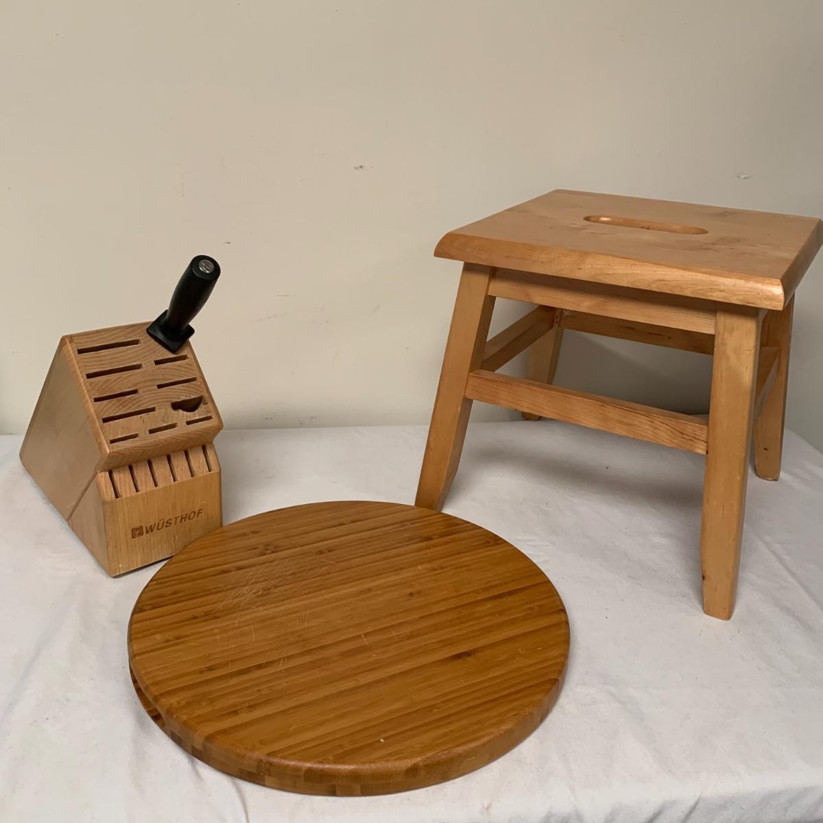 This lot includes one Wüsthof wooden knife block with a matching knife sharpener, one Joyce Chen round wooden cutting block / charcuterie tray, and one wooden step stool. The knife block has some light signs of use and is made of a heavier light colored wood. It measures about 8.5in x 11in. The round wood board can be used as a cutting block or serving tray. The cutting / serving block has some knife marks on both sides (see photos). The board also has handle indentions on either side. It measures about 14in. Diameter. The stepping stool is made of a light colored wood and measures about 12in x 12in x 12in. Shipping available.