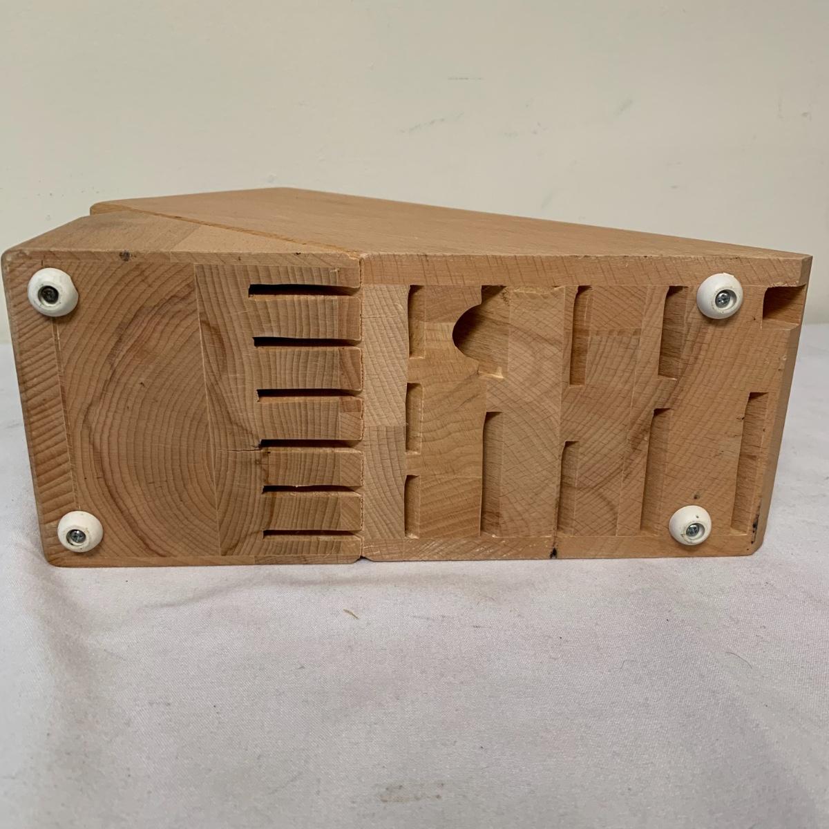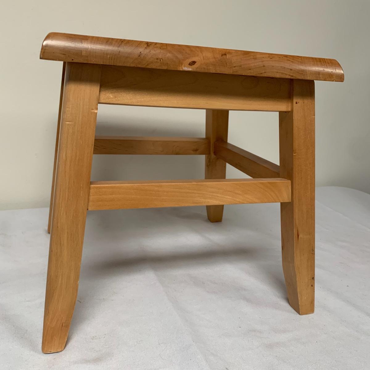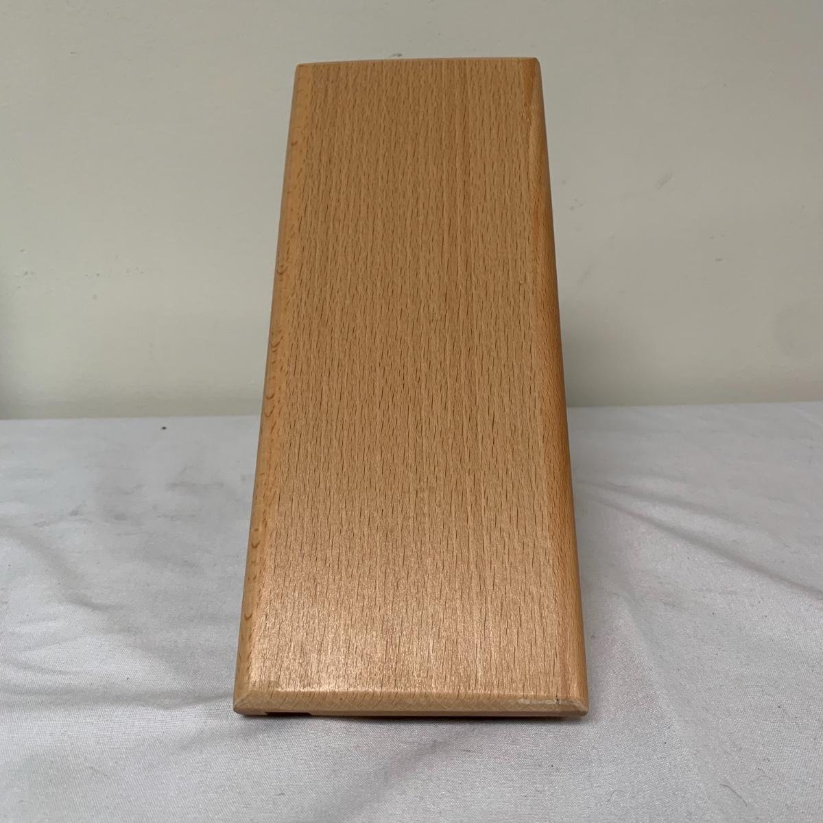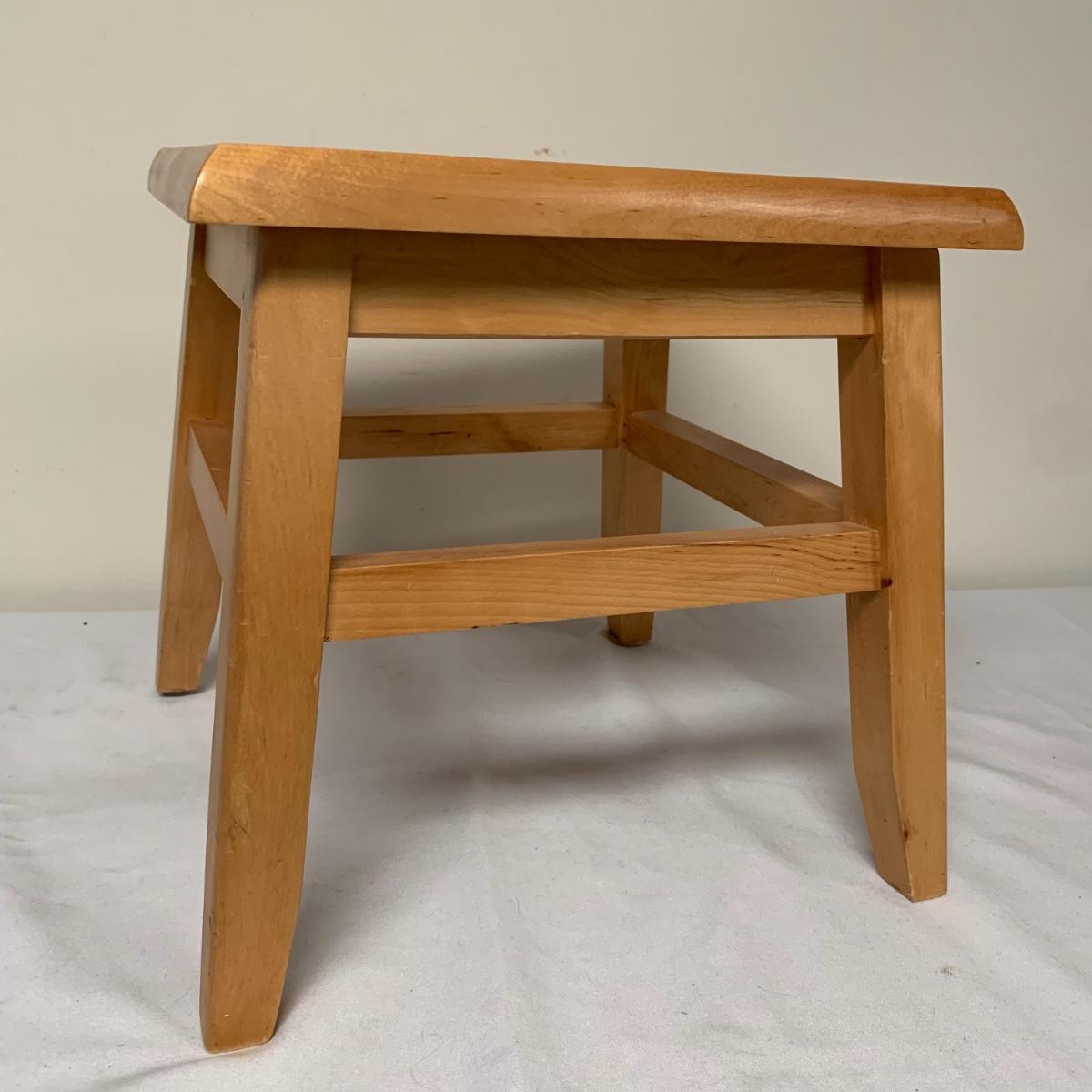 This lot includes one Wüsthof wooden knife block with a matching knife sharpener, one Joyce Chen round wooden cutting block / charcuterie tray, and one wooden step stool. The knife block has some light signs of use and is made of a heavier light colored wood. It measures about 8.5in x 11in. The round wood board can be used as a cutting block or serving tray. The cutting / serving block has some knife marks on both sides (see photos). The board also has handle indentions on either side. It measures about 14in. Diameter. The stepping stool is made of a light colored wood and measures about 12in x 12in x 12in. Shipping available.