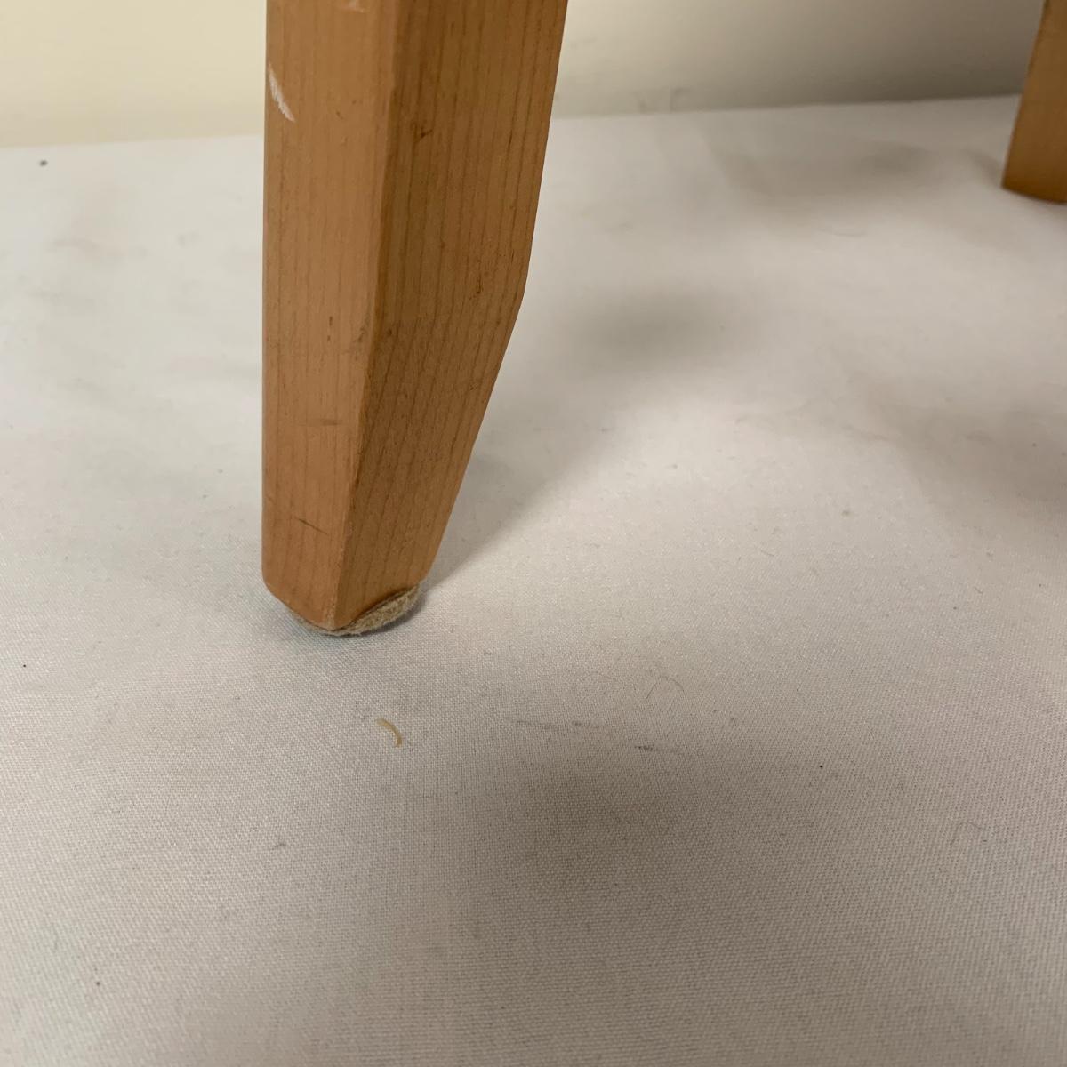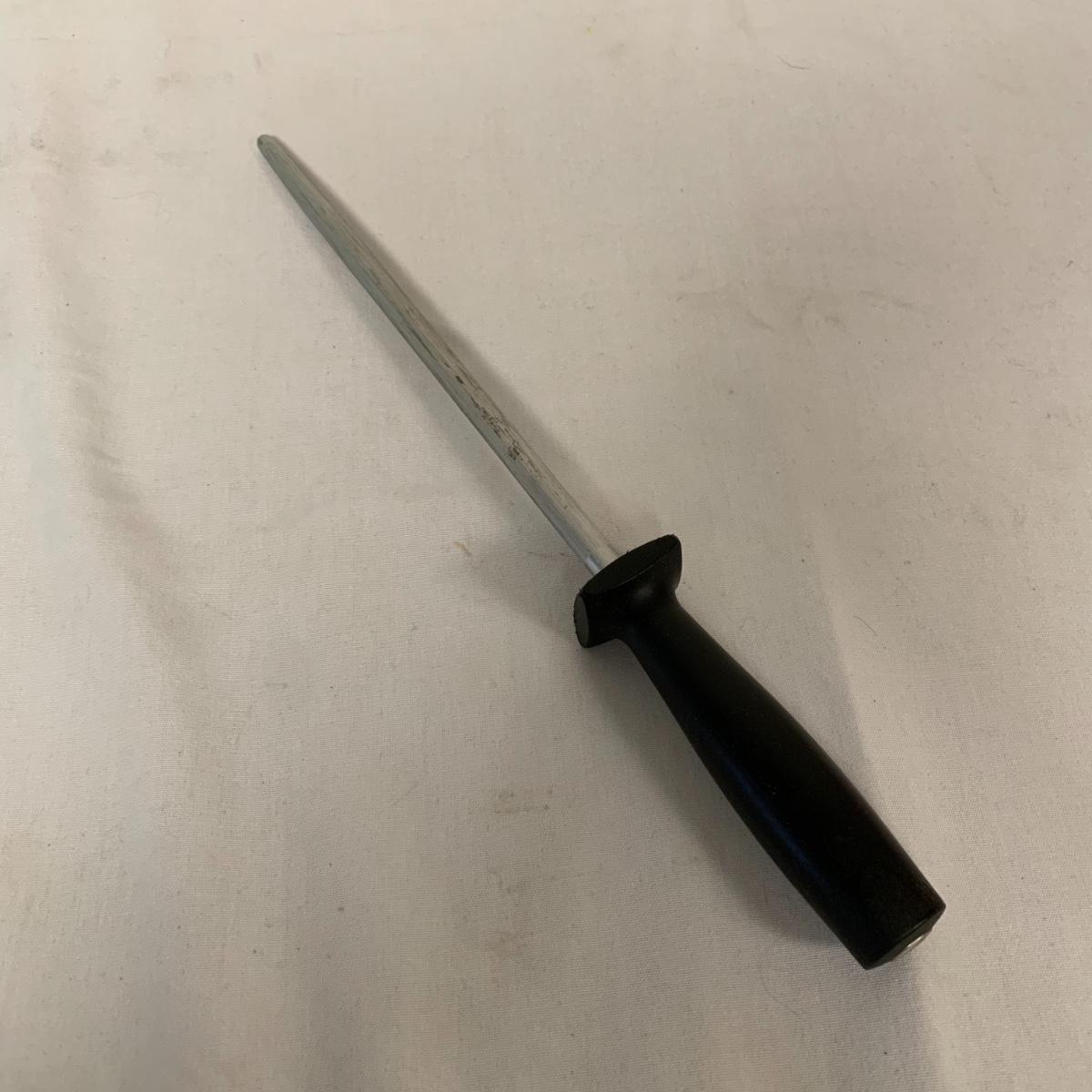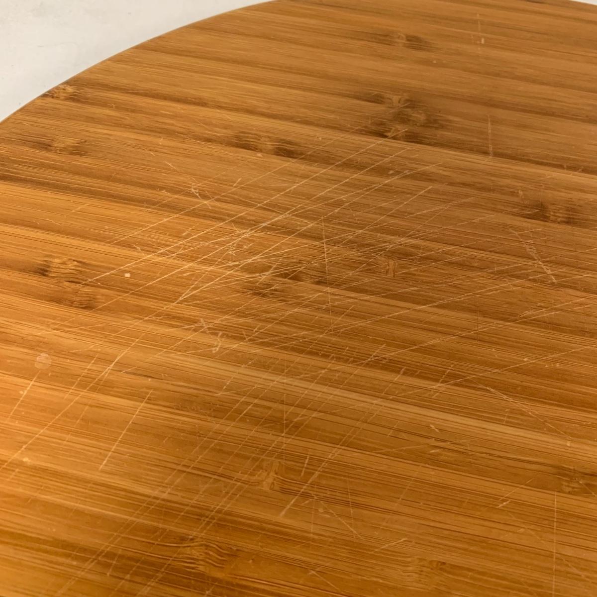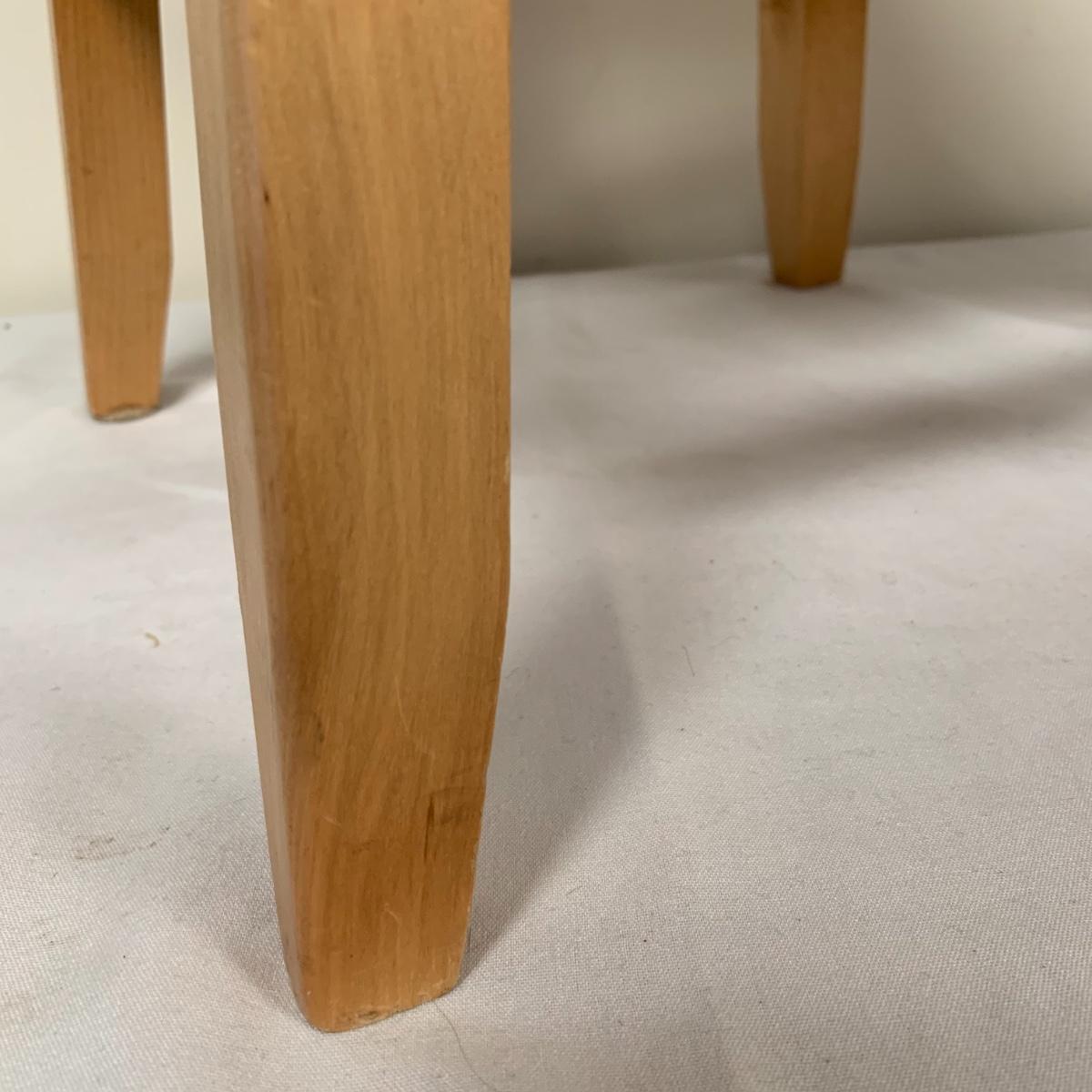 This lot includes one Wüsthof wooden knife block with a matching knife sharpener, one Joyce Chen round wooden cutting block / charcuterie tray, and one wooden step stool. The knife block has some light signs of use and is made of a heavier light colored wood. It measures about 8.5in x 11in. The round wood board can be used as a cutting block or serving tray. The cutting / serving block has some knife marks on both sides (see photos). The board also has handle indentions on either side. It measures about 14in. Diameter. The stepping stool is made of a light colored wood and measures about 12in x 12in x 12in. Shipping available.