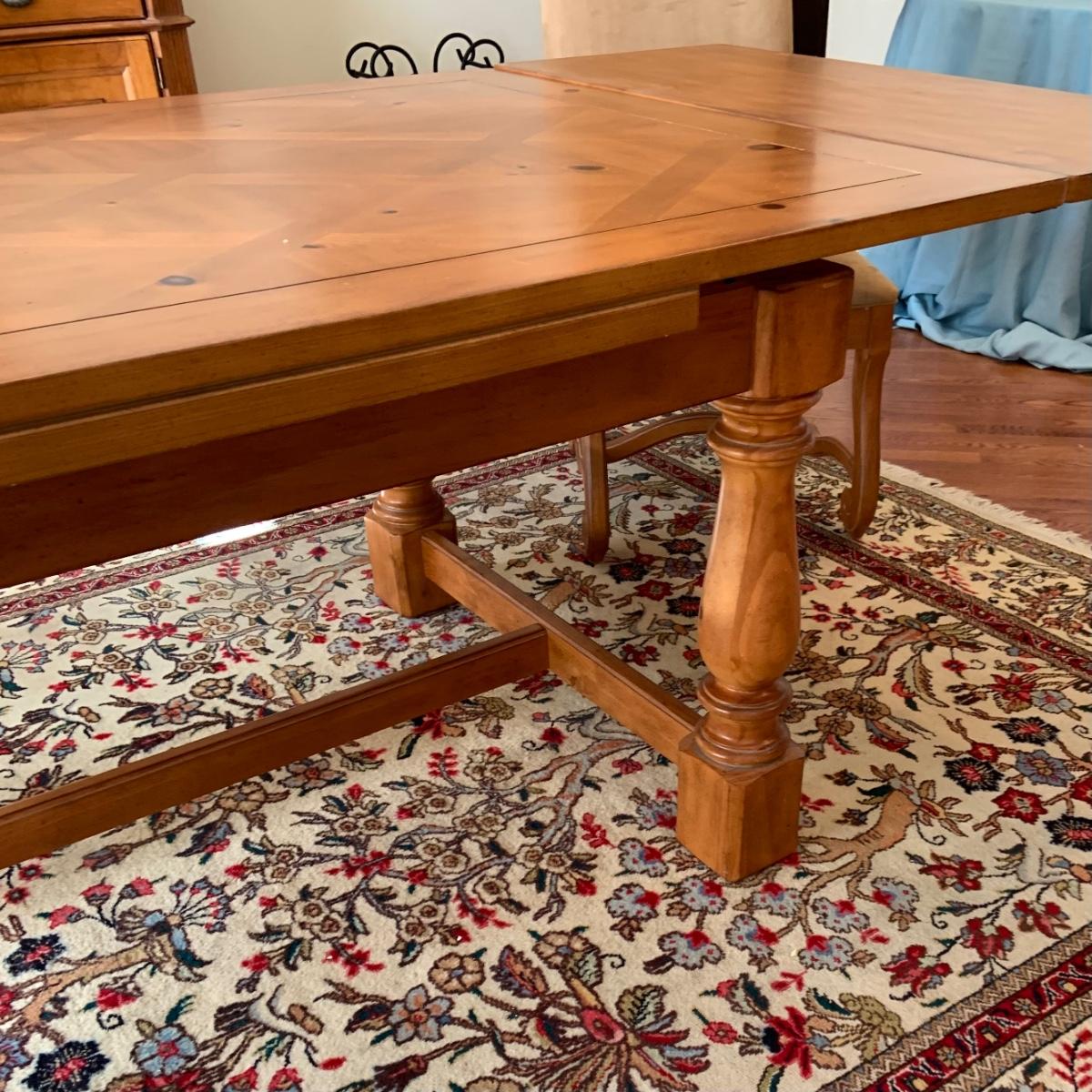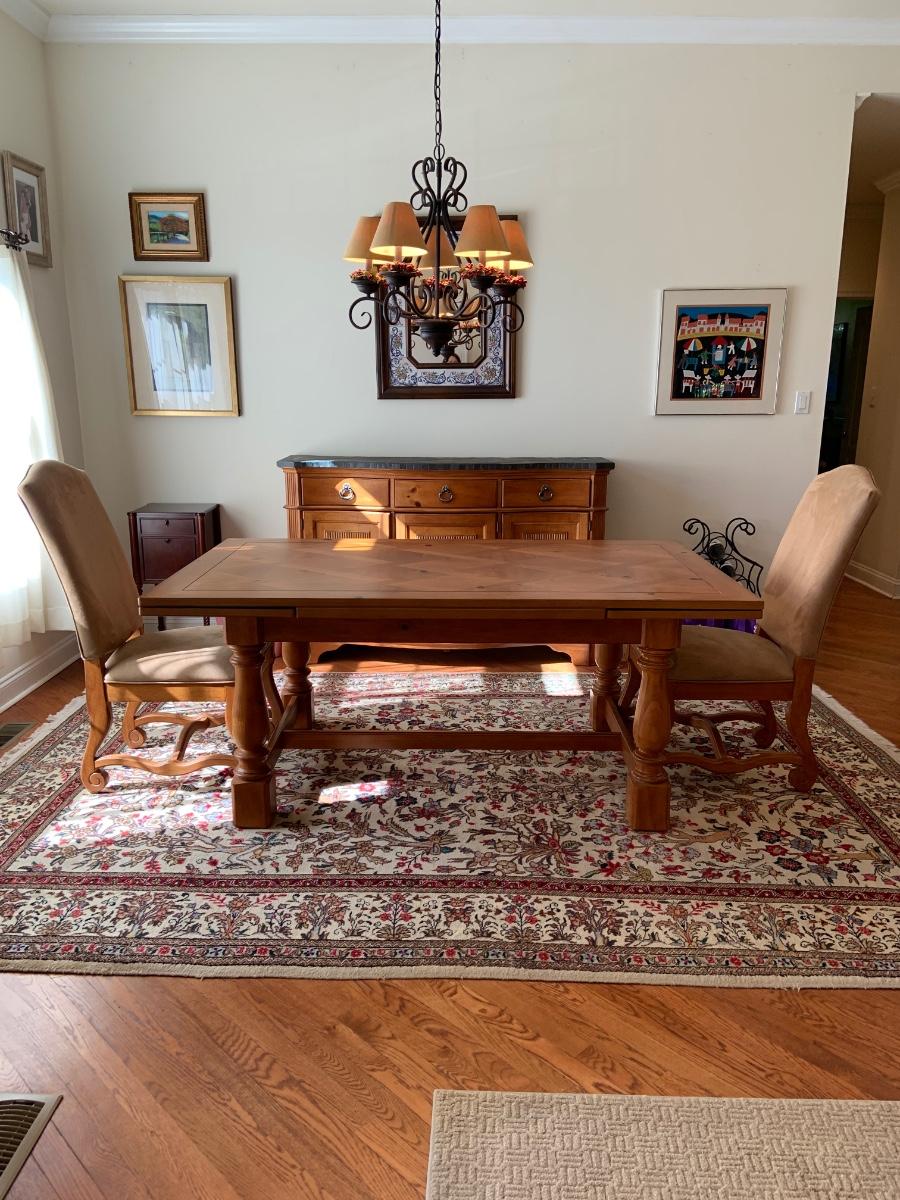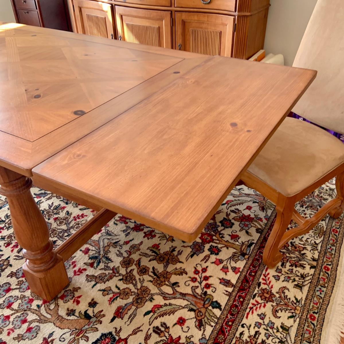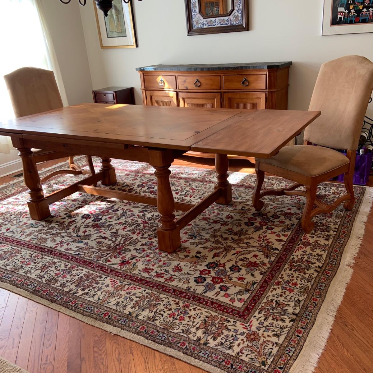The table is 72 x 42 x 31 and has 2 leafs at each end. Each leaf measures 18" each. The Charis are 22 x 24 x 34" Please see all pictures as they are the best representation of the items. The pictures show condition, measurements if taken, and what is included in the lot. Due to the large amount that we photograph and the time frame, we are not always able to take measurements. All items unless noted, are pre-owned and have been used. If you purchased furniture, you must bring help. We do not allow one person to carry large furniture out on their own. Bring help, tools and a truck for the safety of our client’s homes, and your personal safety. Any damages that result to the property including walls, and floors due to moving of the furniture will be charged to the buyer. Company policy. Thank you.