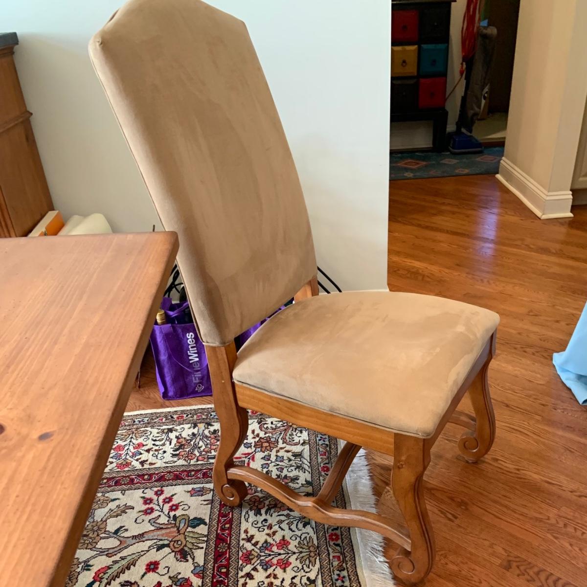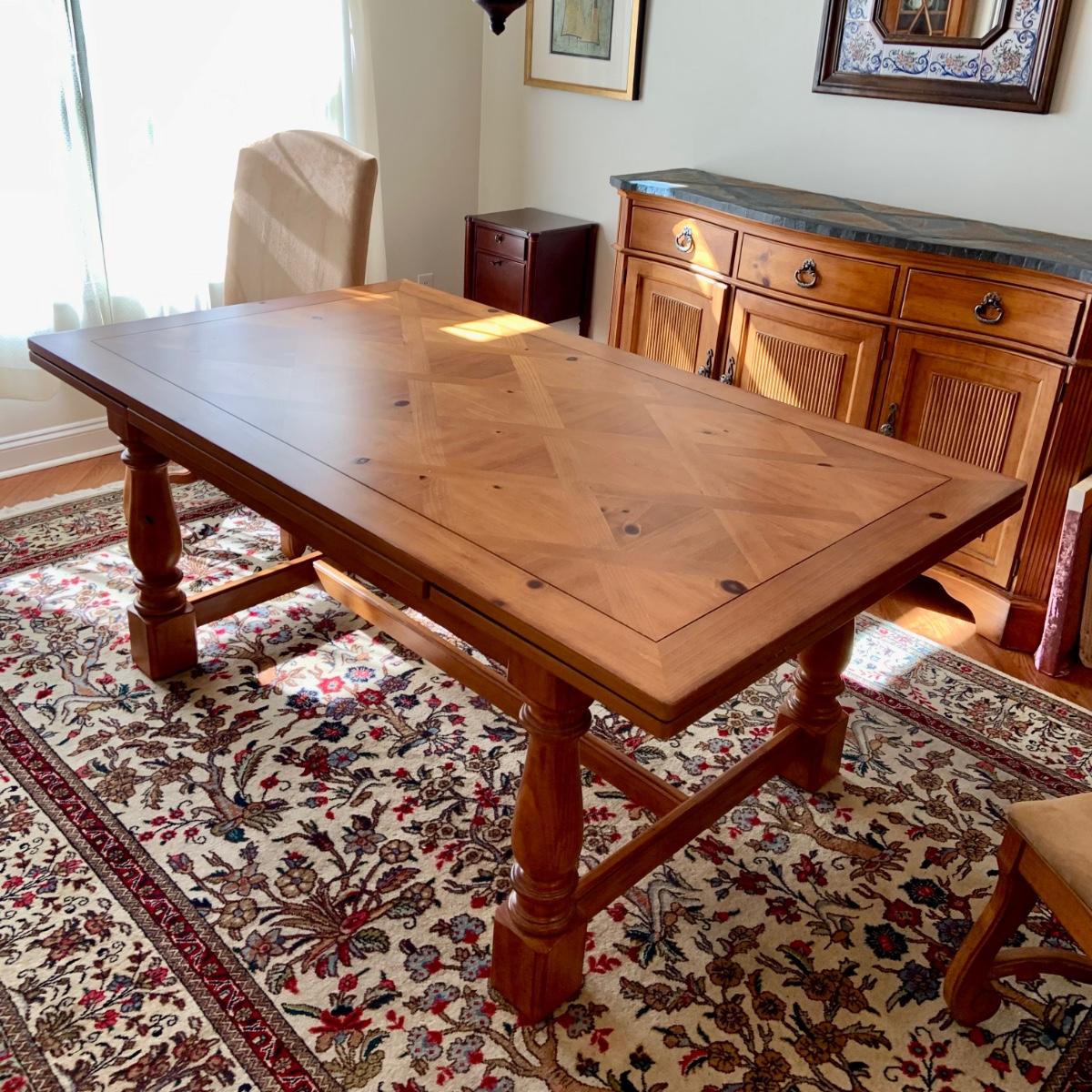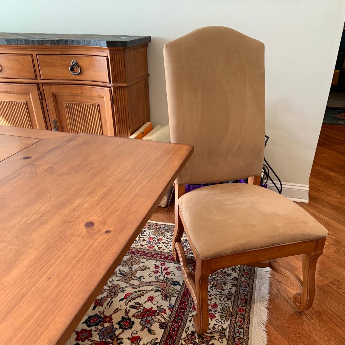 The table is 72 x 42 x 31 and has 2 leafs at each end. Each leaf measures 18" each. The Charis are 22 x 24 x 34" Please see all pictures as they are the best representation of the items. The pictures show condition, measurements if taken, and what is included in the lot. Due to the large amount that we photograph and the time frame, we are not always able to take measurements. All items unless noted, are pre-owned and have been used. If you purchased furniture, you must bring help. We do not allow one person to carry large furniture out on their own. Bring help, tools and a truck for the safety of our client’s homes, and your personal safety. Any damages that result to the property including walls, and floors due to moving of the furniture will be charged to the buyer. Company policy. Thank you.