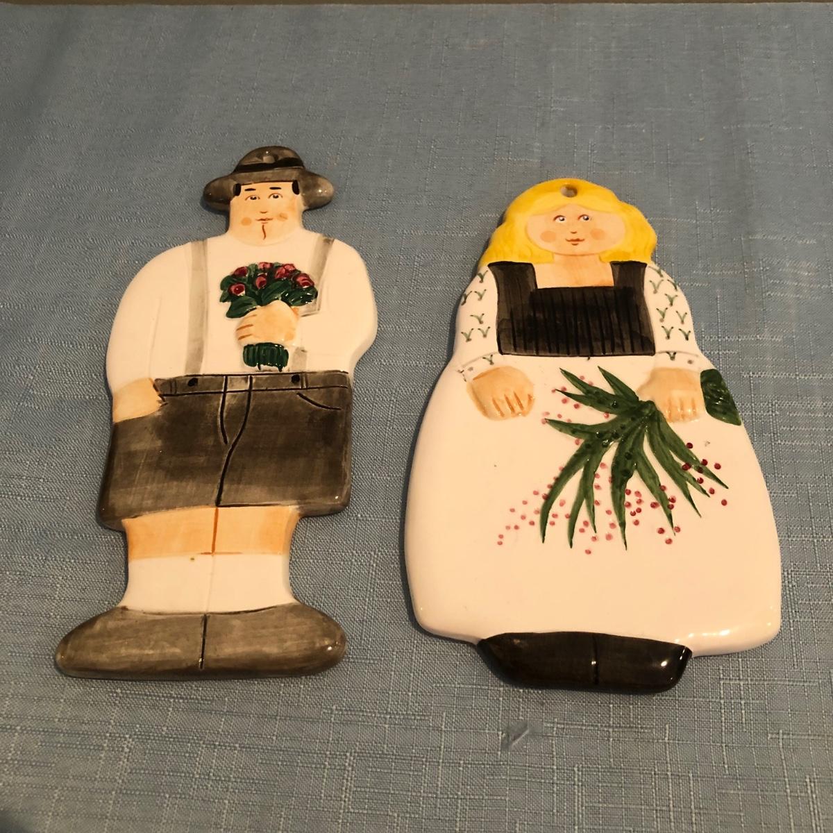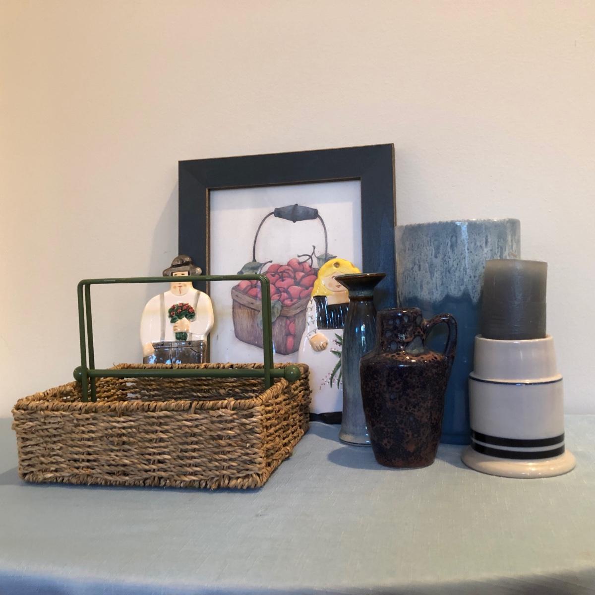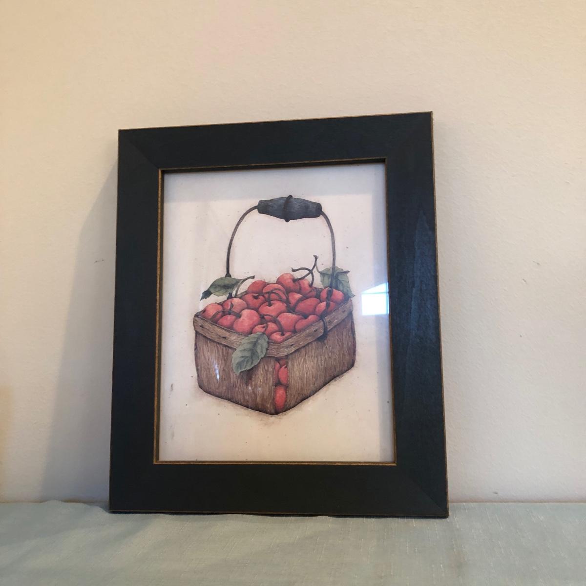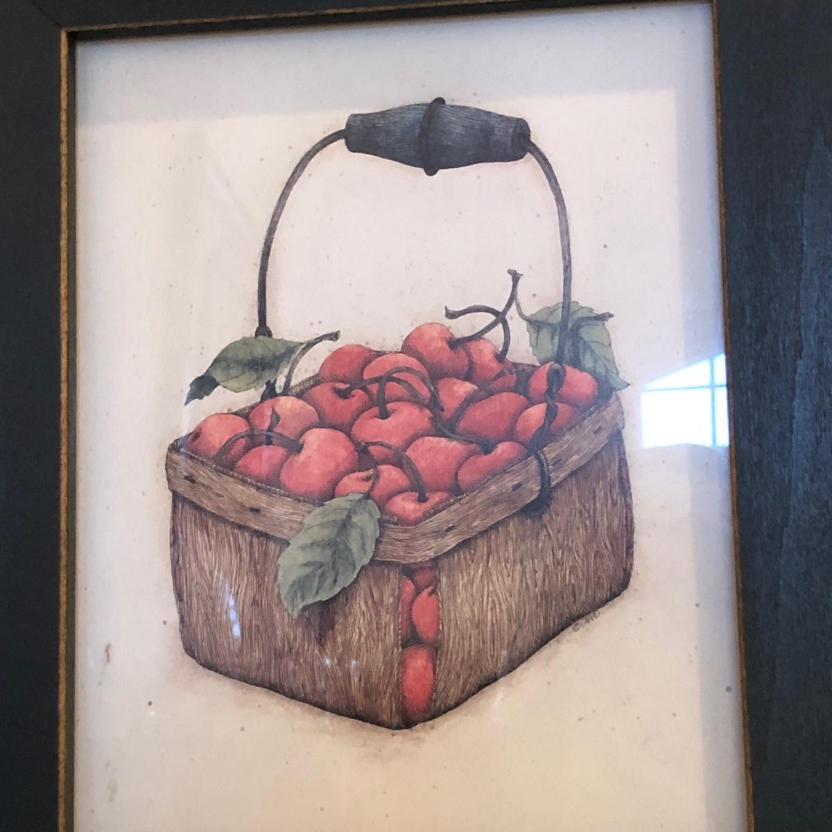 LOT 39M: Framed "Cherry Basket" Print by Nanny Faye Pictures, Towle "Les Artisants" Tastesetter Ceramic Wall Plaques, Dansk Candle Holder, Gonger Originals Pottery, More Pottery & Napkin Holder