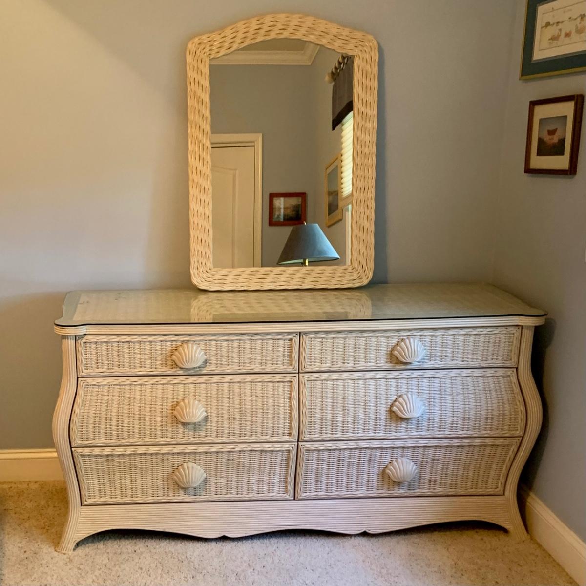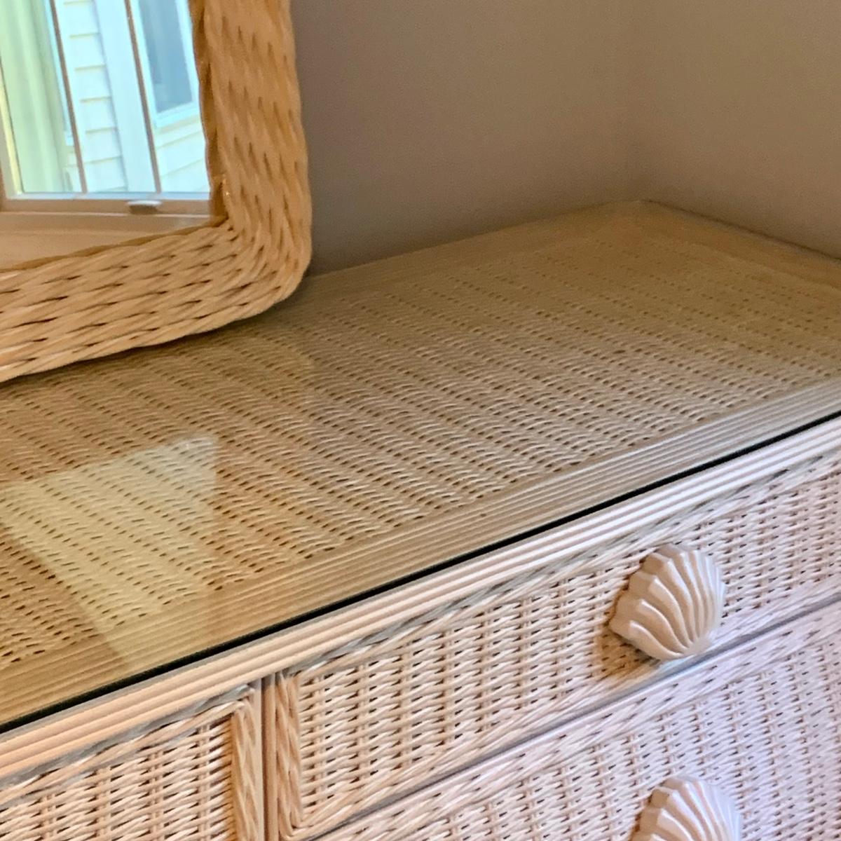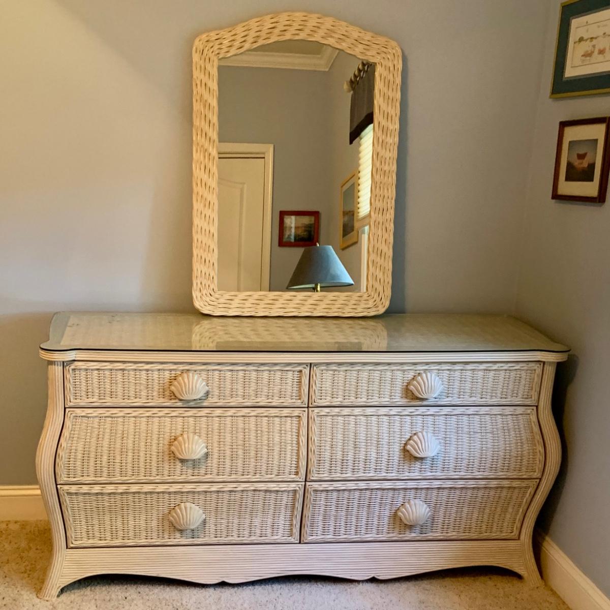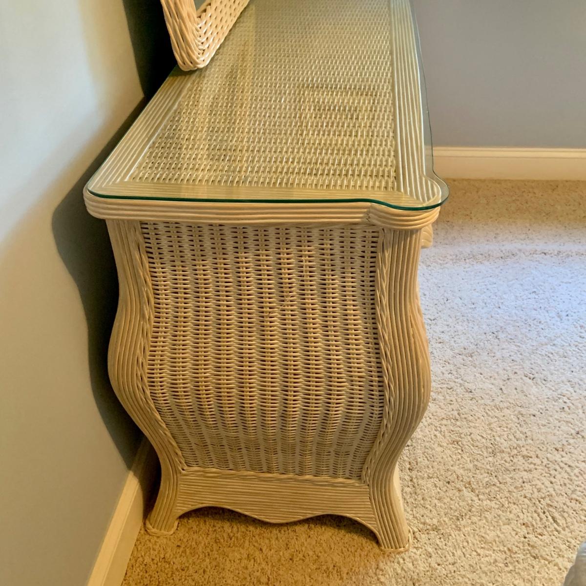 LOT:82G: Vintage White Glass Topped Wicker Dresser with Mirror