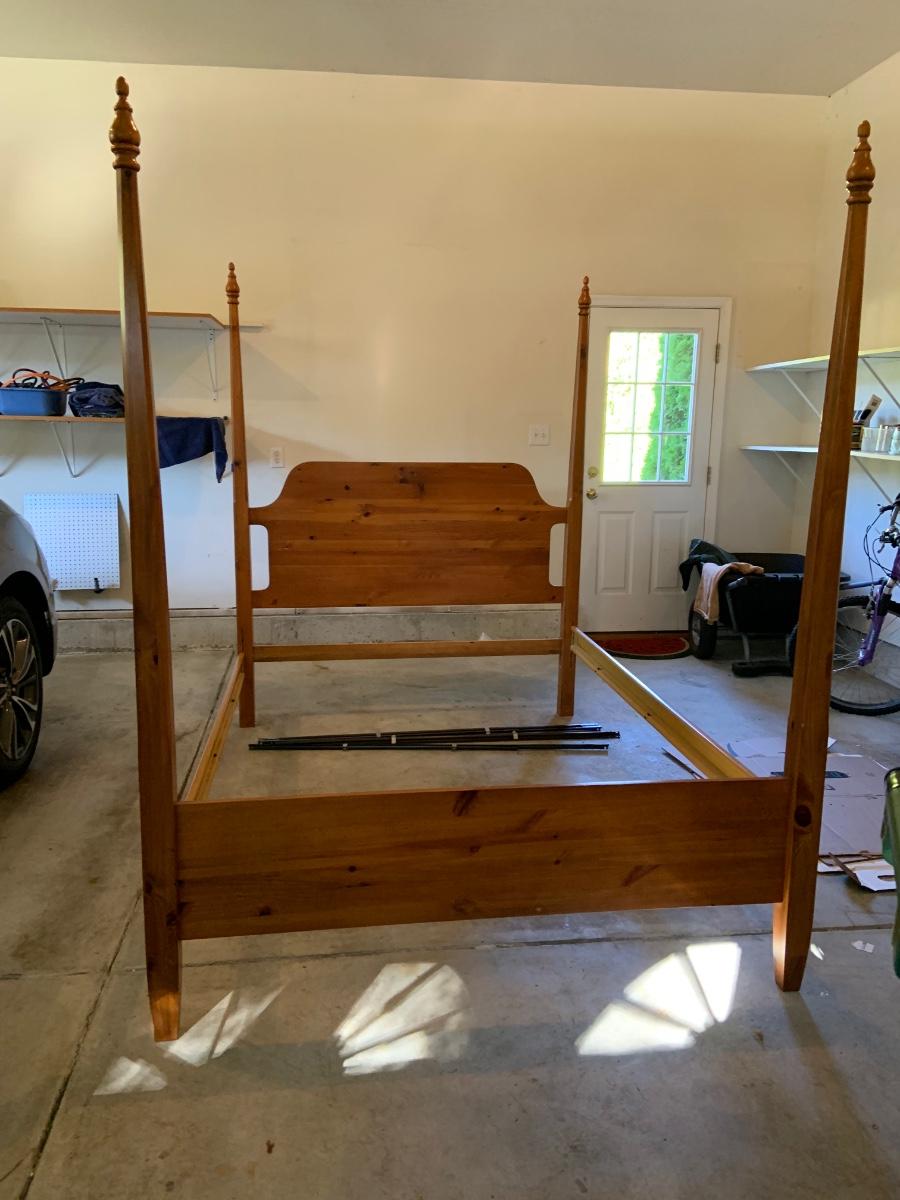 The frame is 63 x 87x 80" Please see all pictures as they are the best representation of the items. The pictures show condition, measurements if taken, and what is included in the lot. Due to the large amount that we photograph and the time frame, we are not always able to take measurements. All items unless noted, are pre-owned and have been used. If you purchased furniture, you must bring help. We do not allow one person to carry large furniture out on their own. Bring help, tools and a truck for the safety of our client’s homes, and your personal safety. Any damages that result to the property including walls, and floors due to moving of the furniture will be charged to the buyer. Company policy. Thank you.