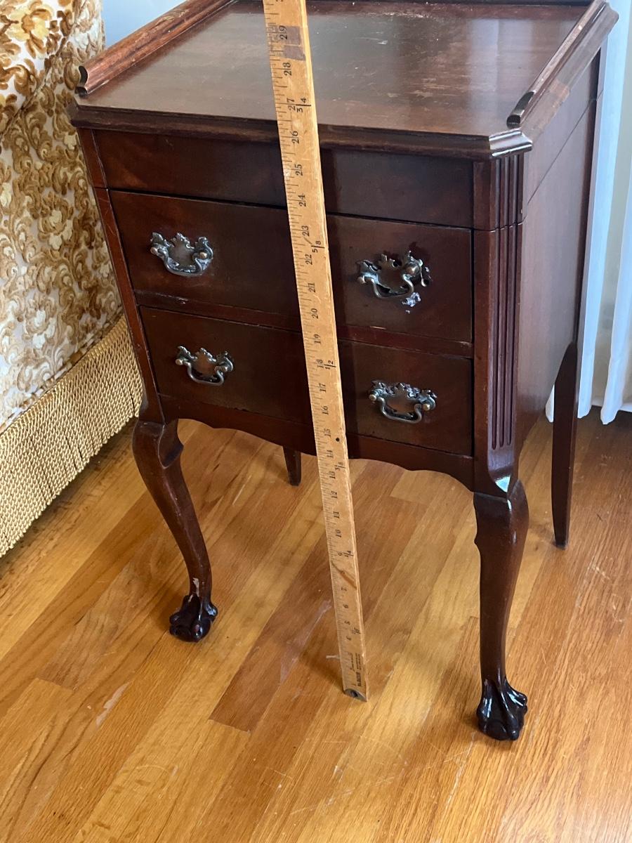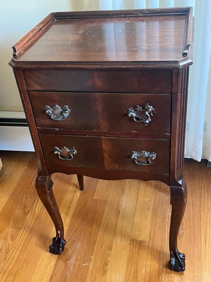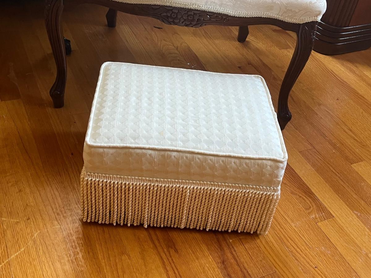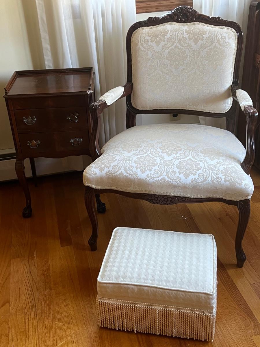 LOT 8L: Armchair, Foot Stool, Sewing Cabinet / Side Table