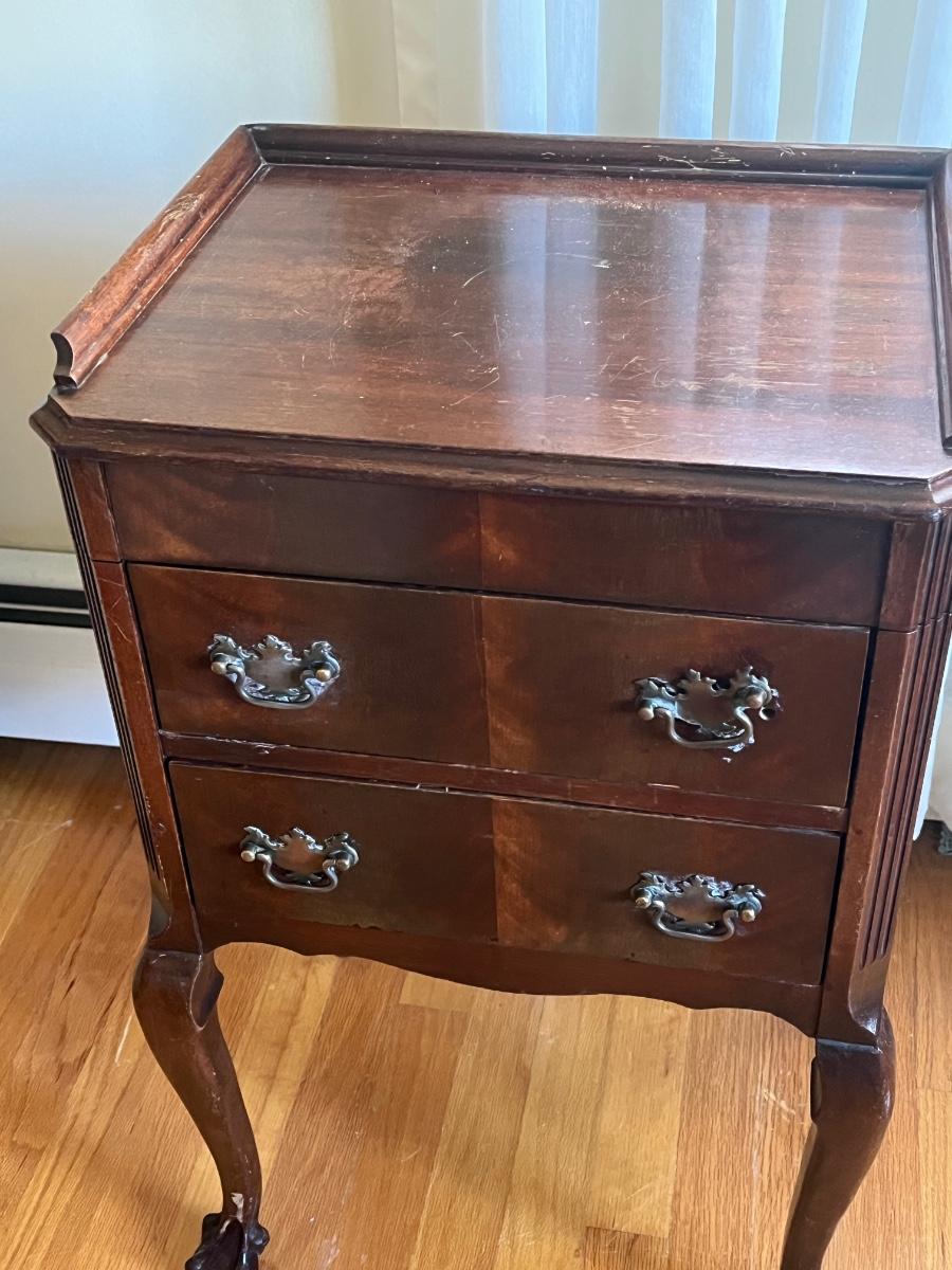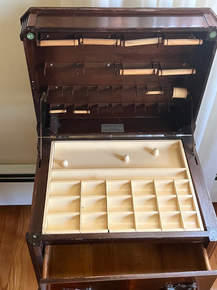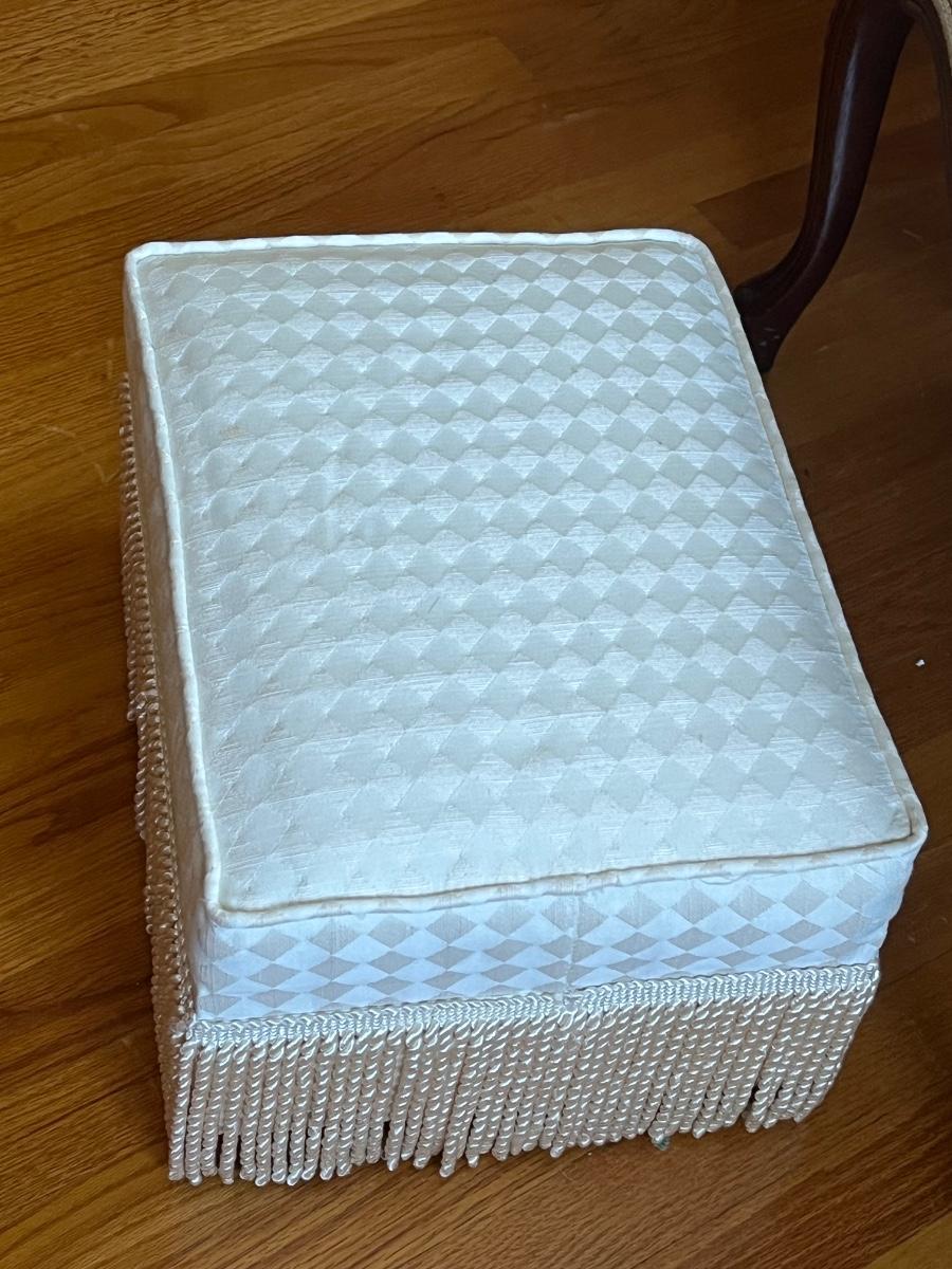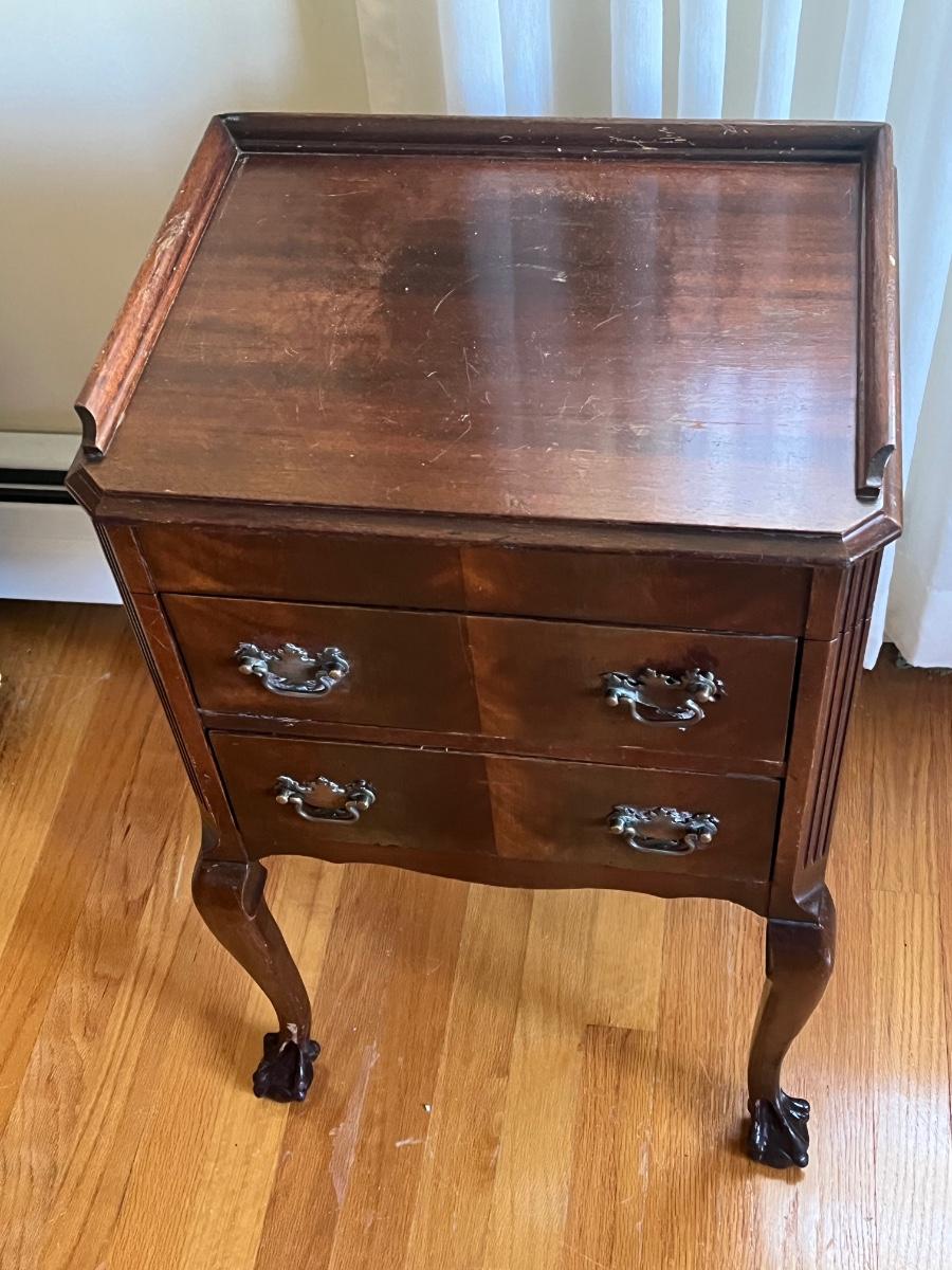 LOT 8L: Armchair, Foot Stool, Sewing Cabinet / Side Table