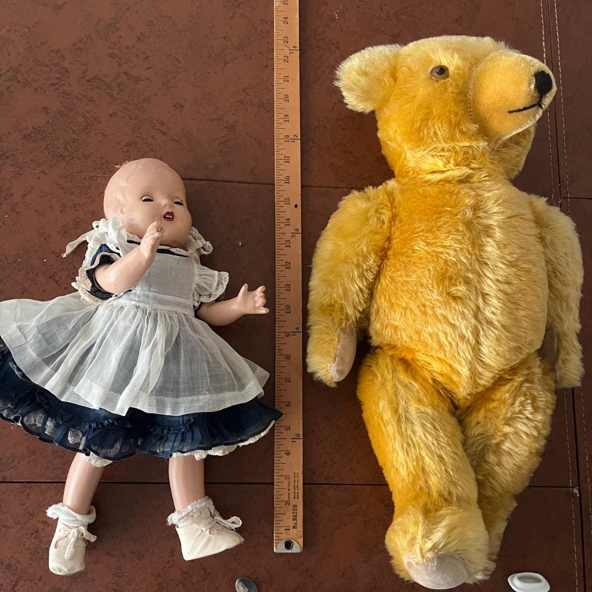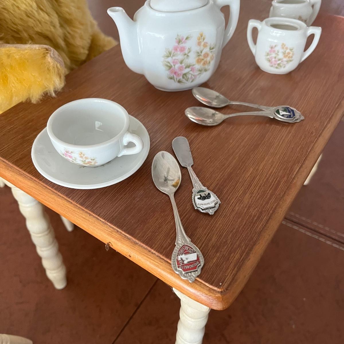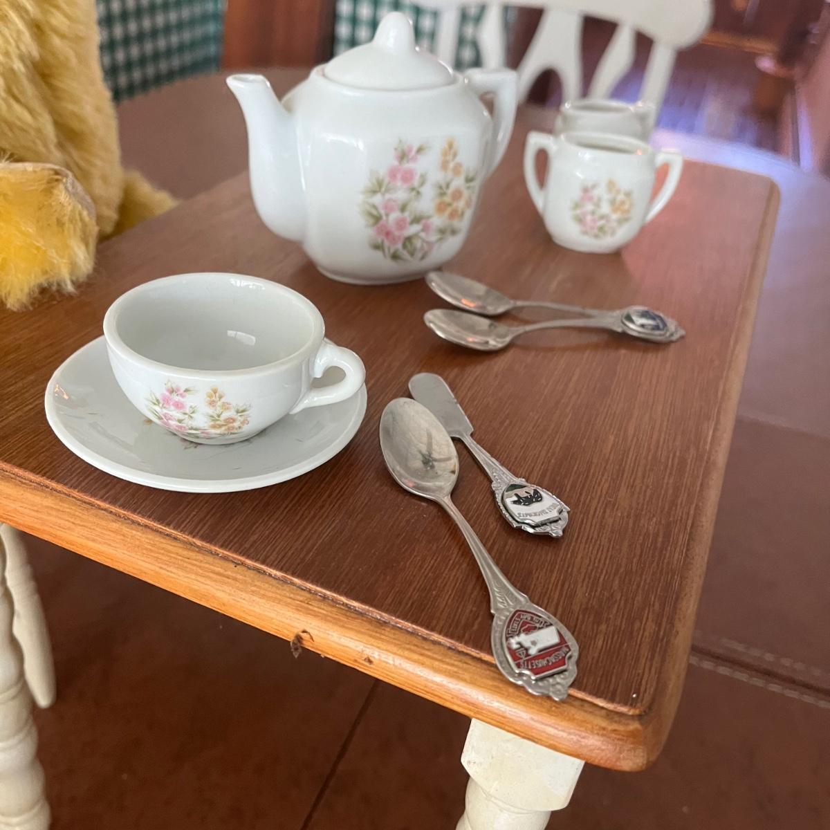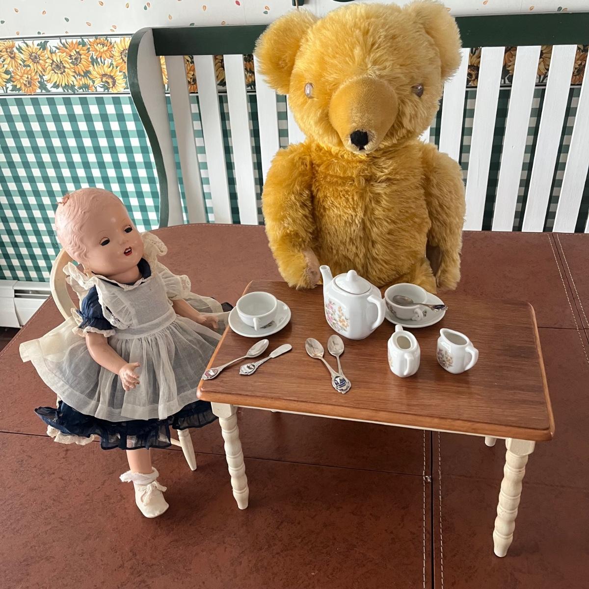 LOT 15K: Tea Party Lot - Vintage / Antique Stuffed Bear, Composite Doll, Doll Furniture, Made in Japan Children's Tea Set, Collectible Spoons,