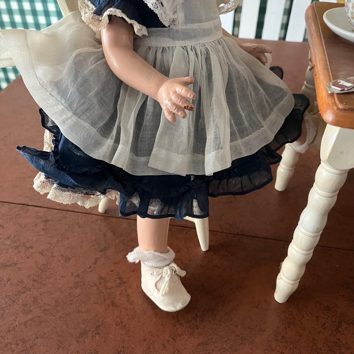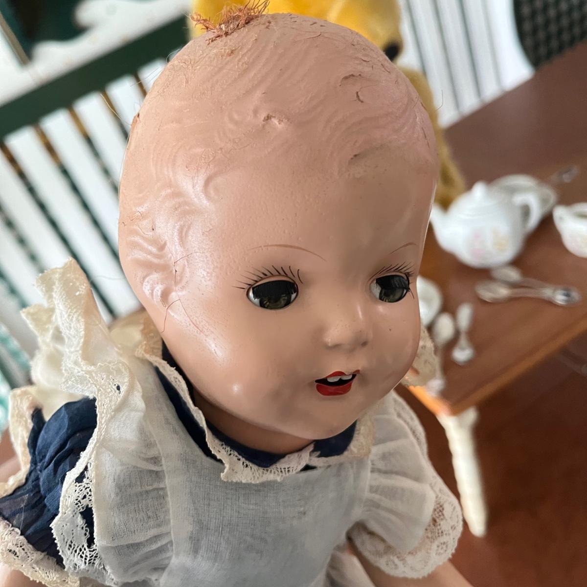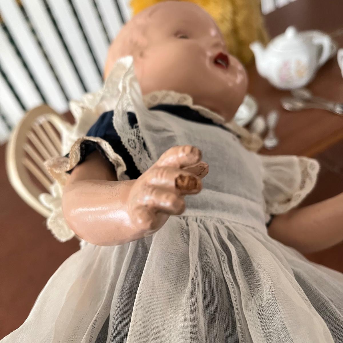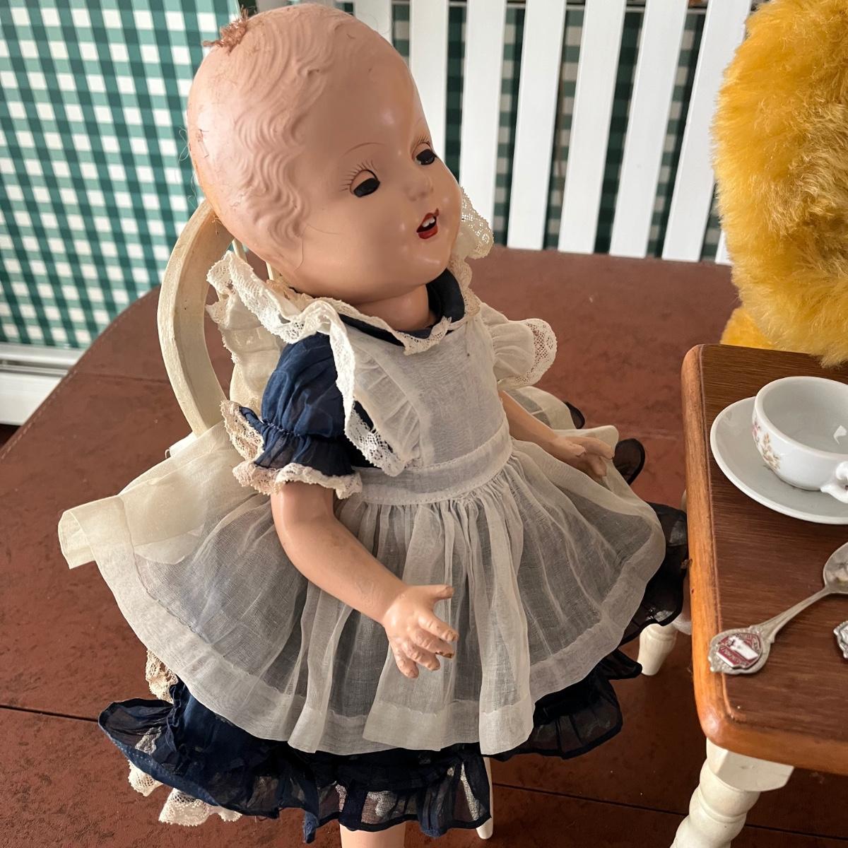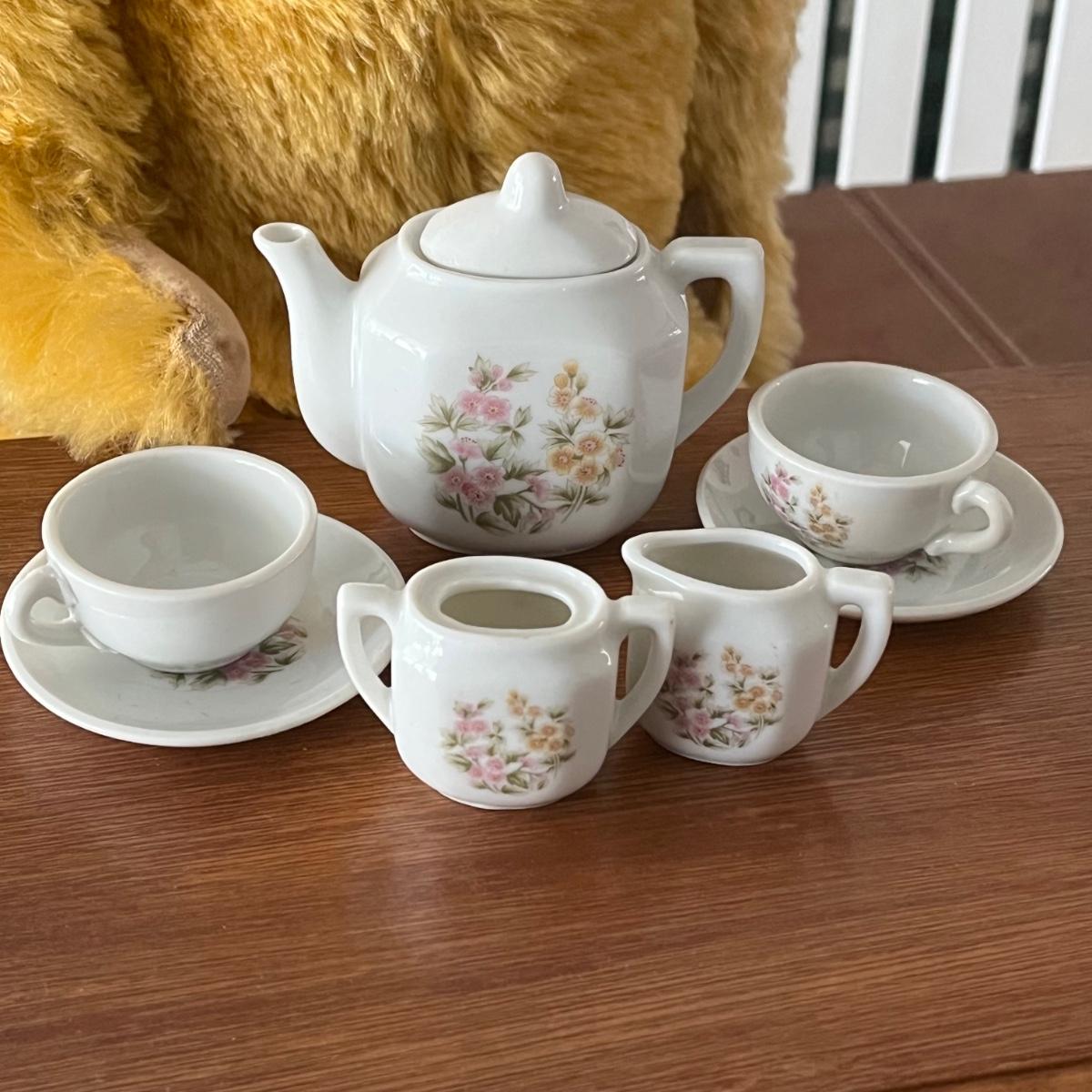 LOT 15K: Tea Party Lot - Vintage / Antique Stuffed Bear, Composite Doll, Doll Furniture, Made in Japan Children's Tea Set, Collectible Spoons,