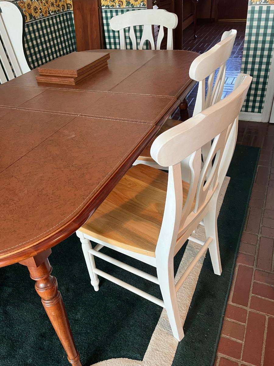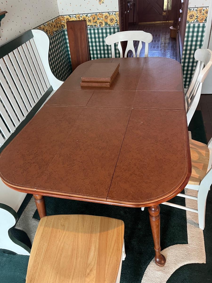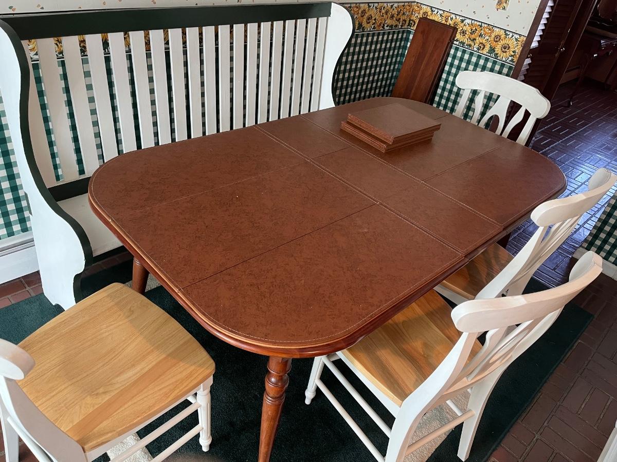 Comes with three 10" leaves (one already inserted in photos), four chairs, bench, and pads for table.
