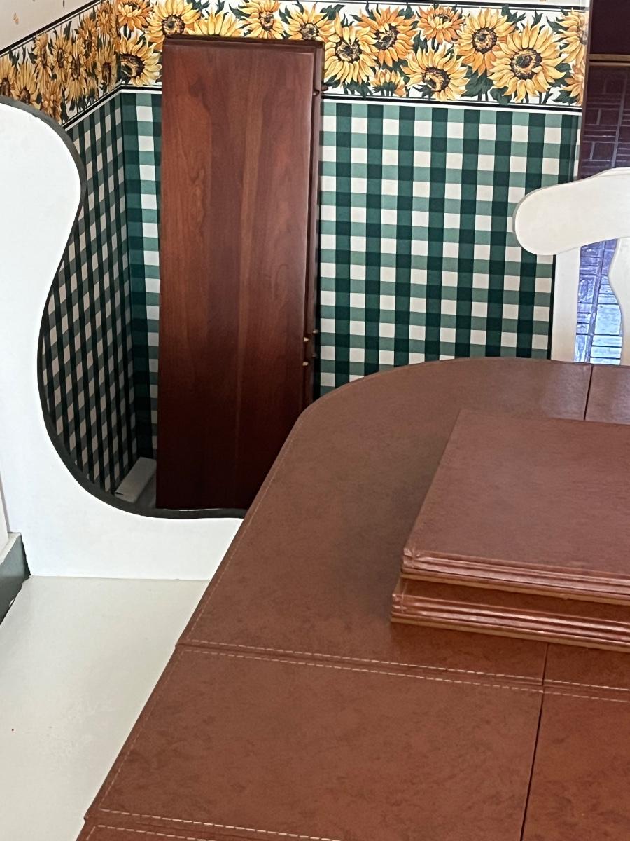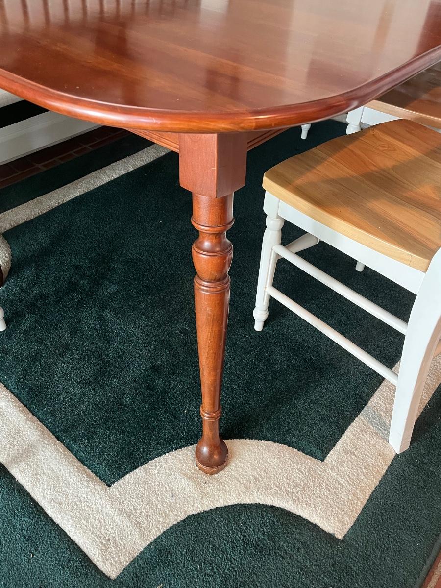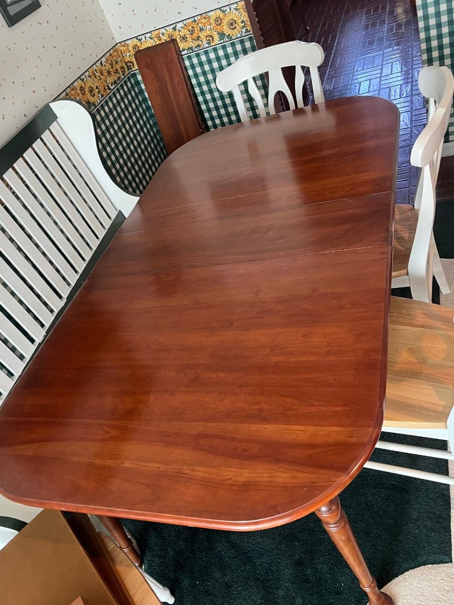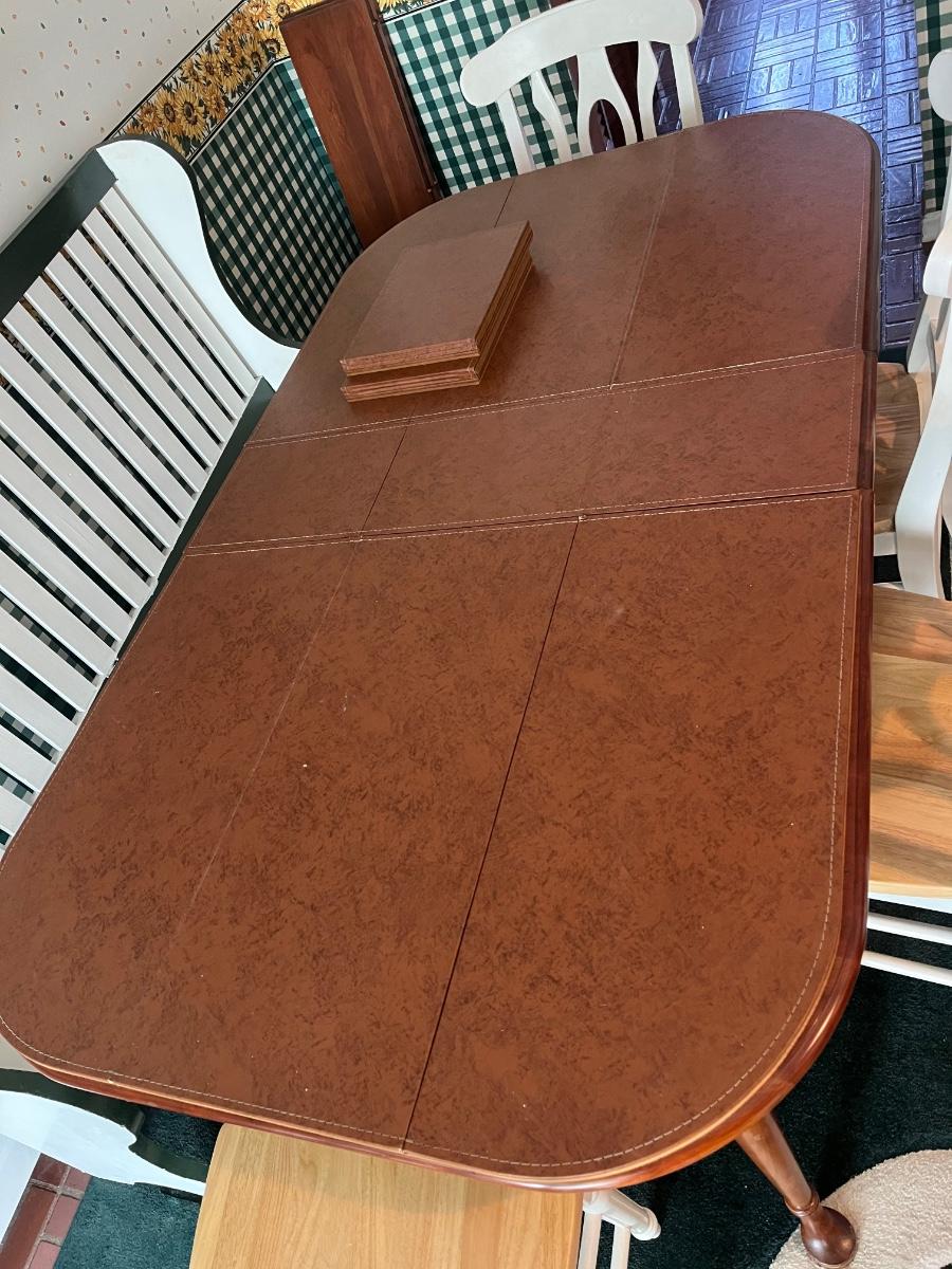 Comes with three 10" leaves (one already inserted in photos), four chairs, bench, and pads for table.