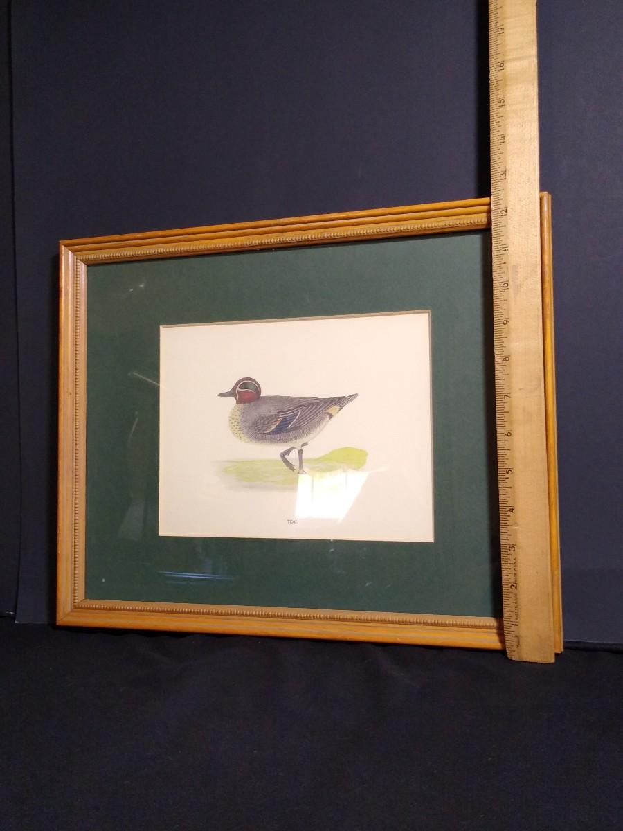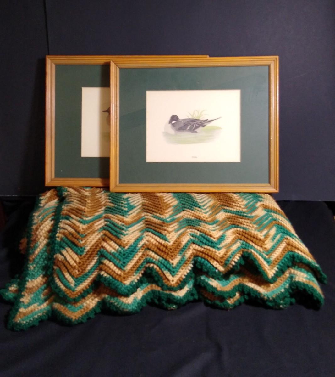 LOT 42C: Vintage Framed Teal and Pintail Duck Prints w/ Crochet Blanket