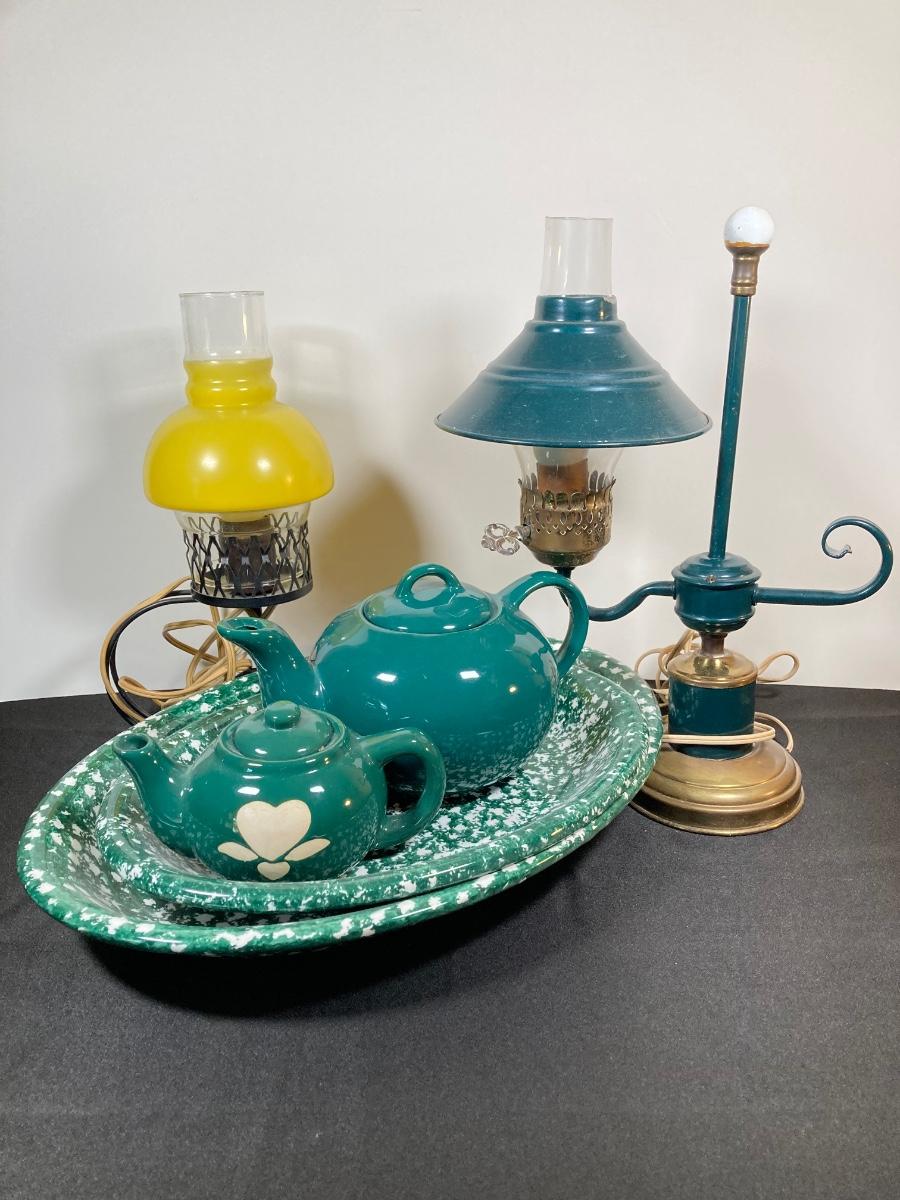 LOT 150K: Vintage Lamps, Tea Pots and Hand Painted Serving Dishes