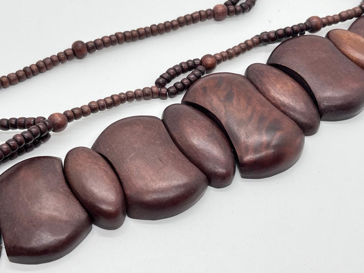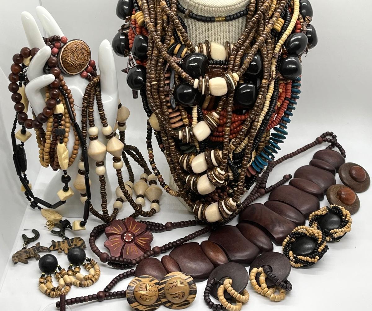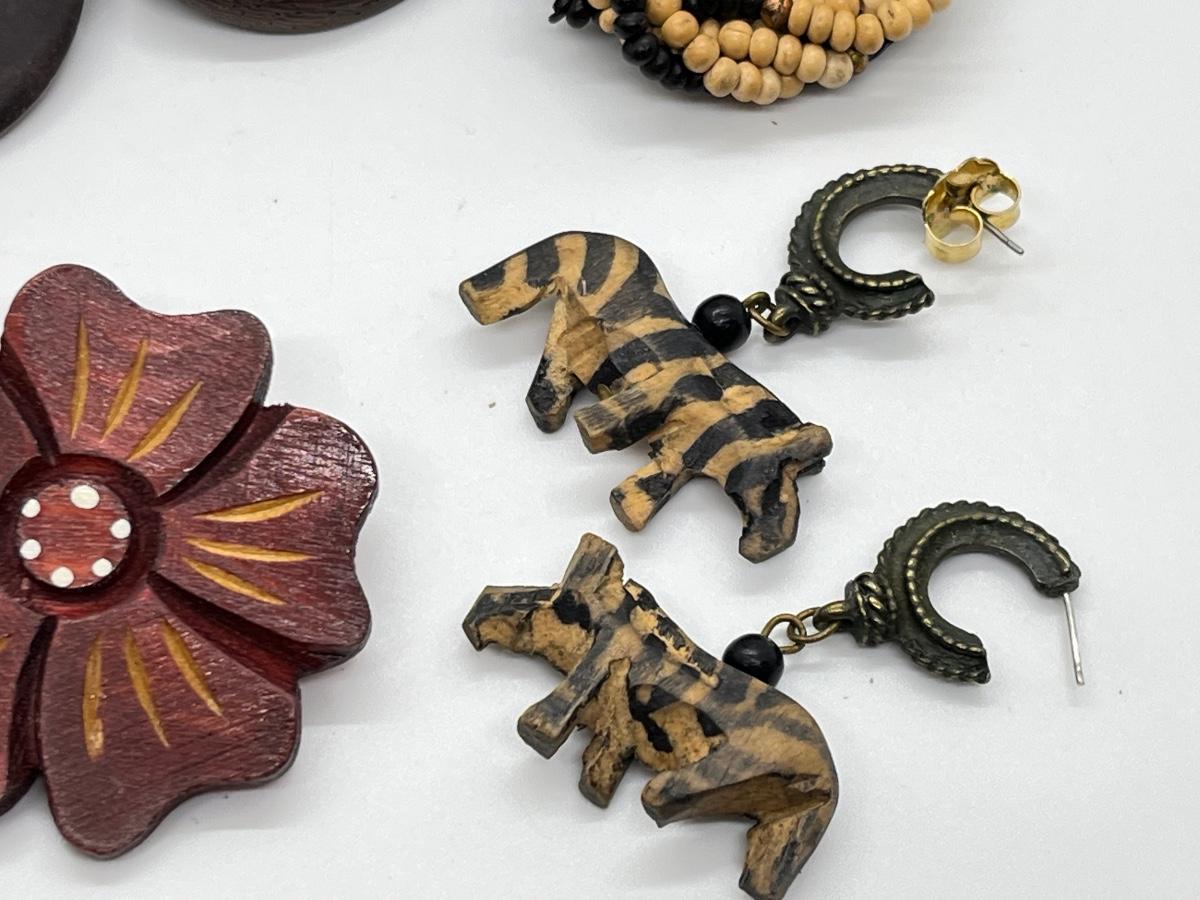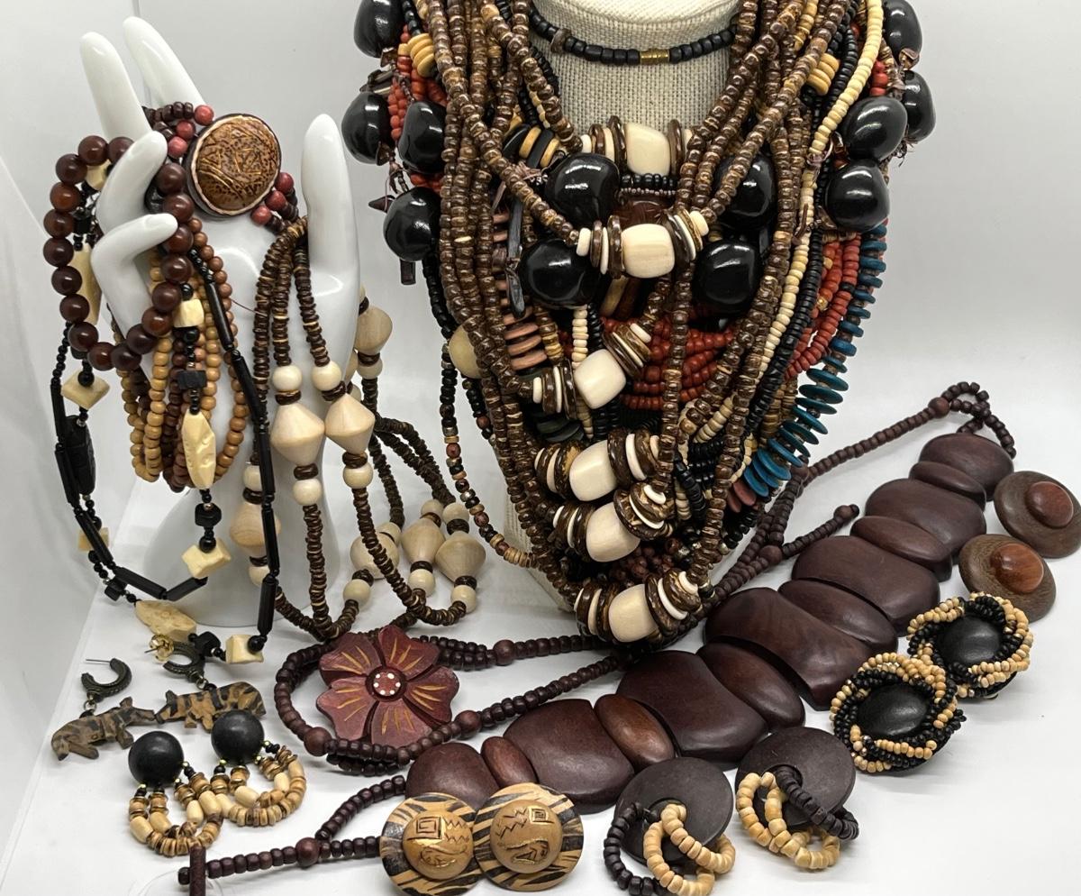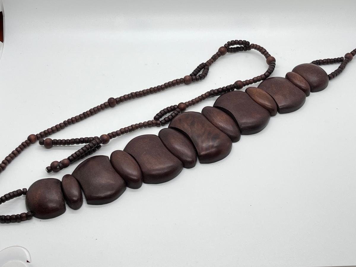 LOT 165J: Wood Beaded Brown Necklaces, Bracelets, Earrings, Belt and Floral Pin