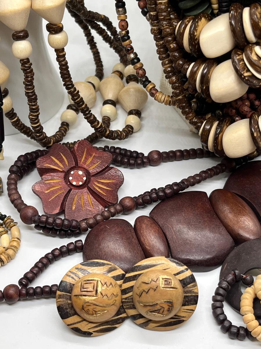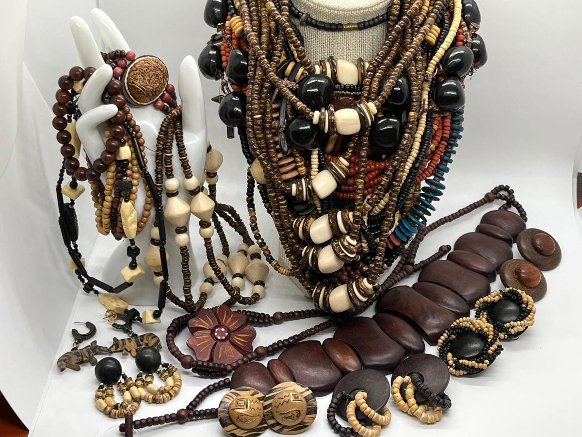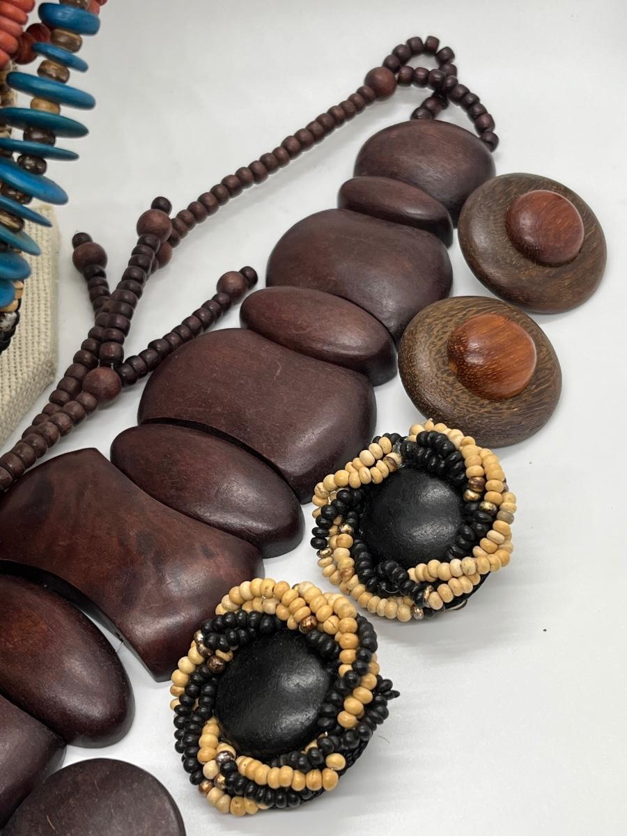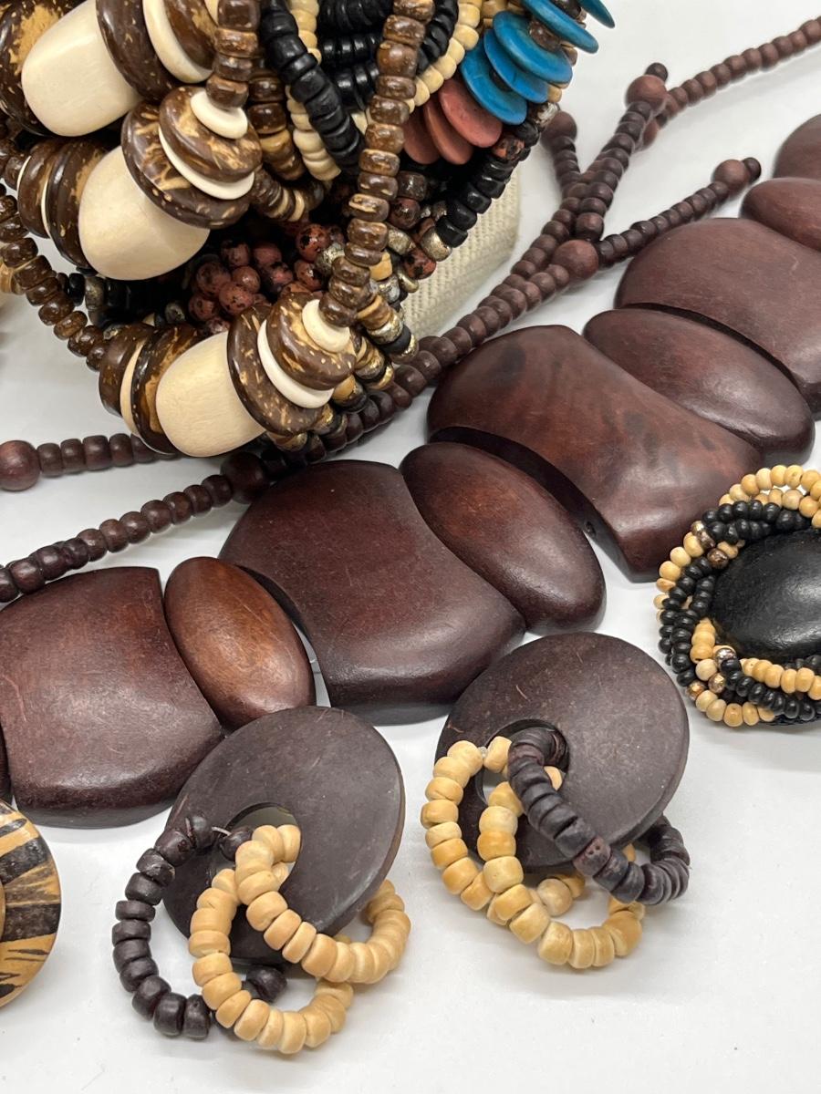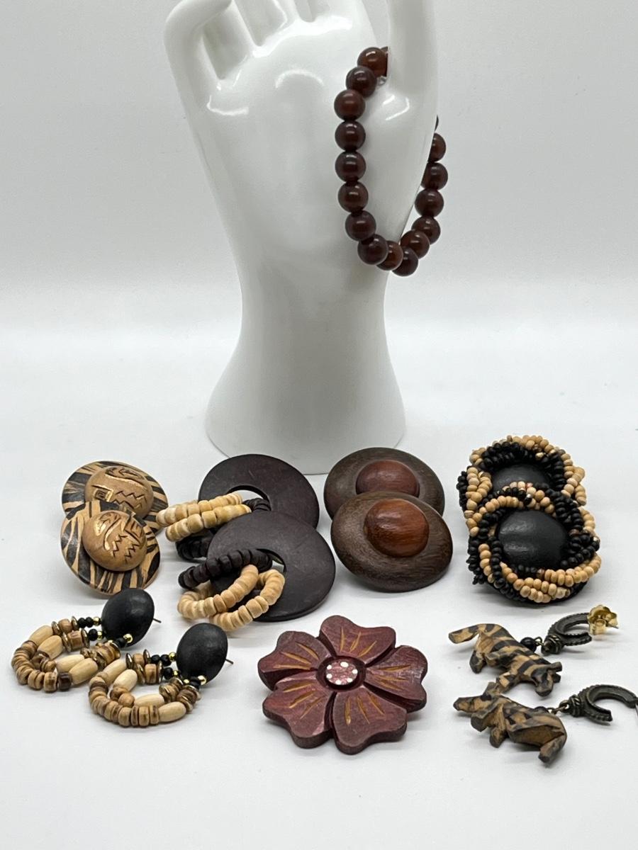 LOT 165J: Wood Beaded Brown Necklaces, Bracelets, Earrings, Belt and Floral Pin