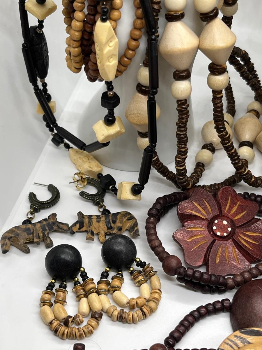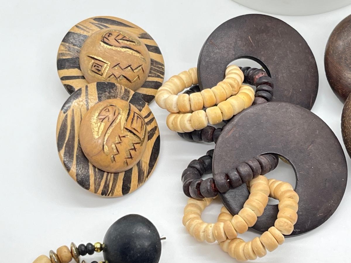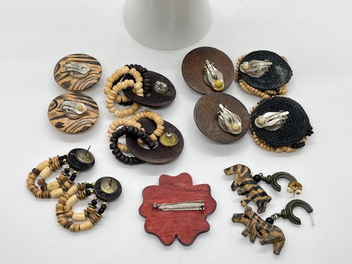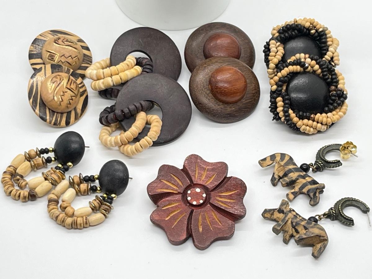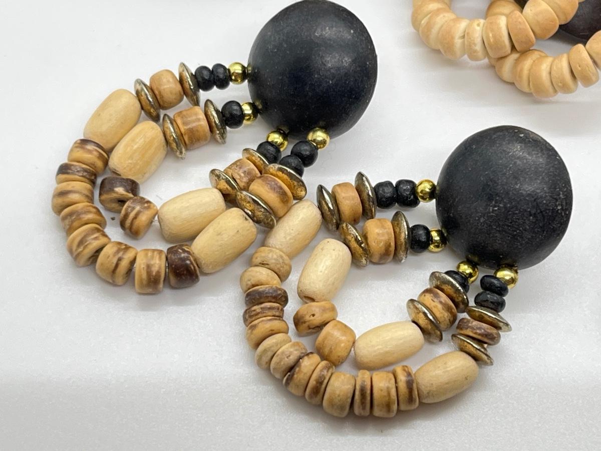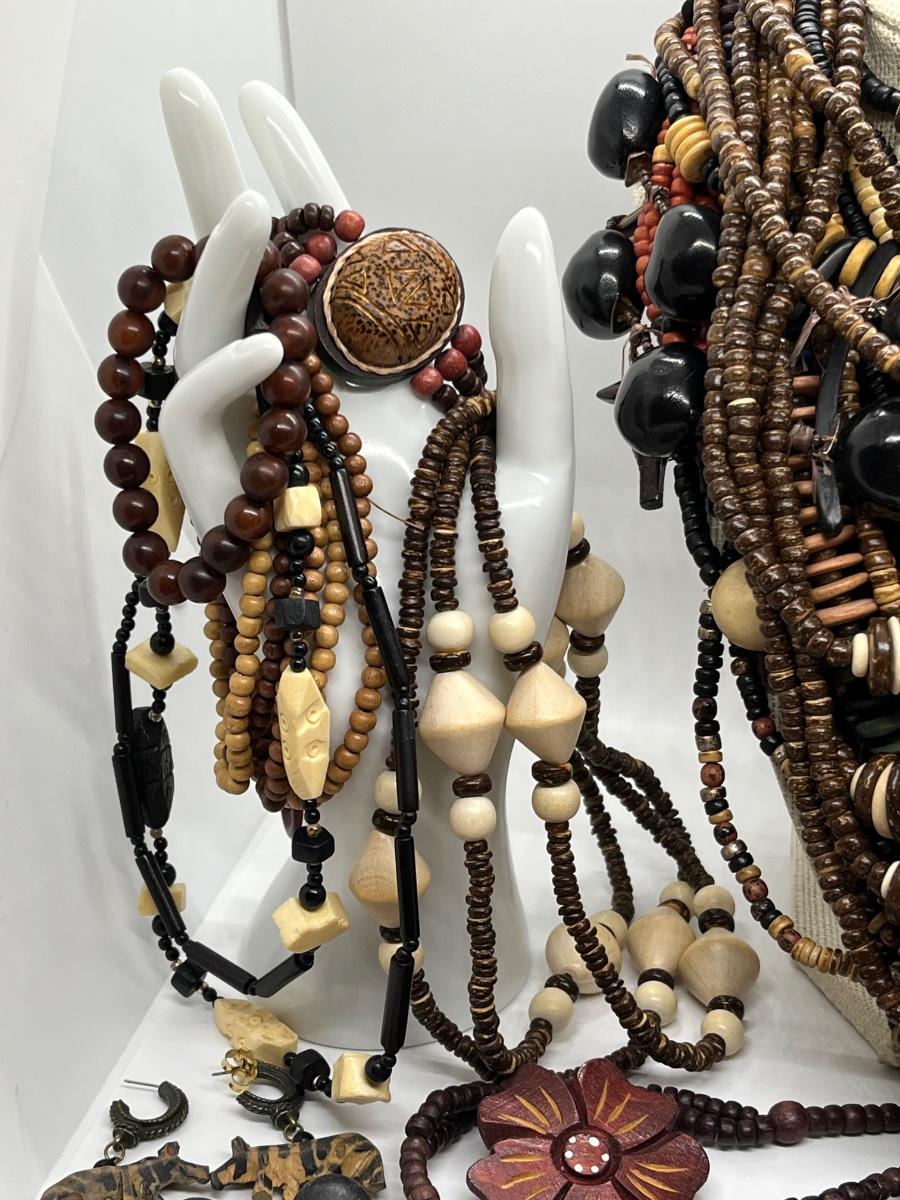 LOT 165J: Wood Beaded Brown Necklaces, Bracelets, Earrings, Belt and Floral Pin