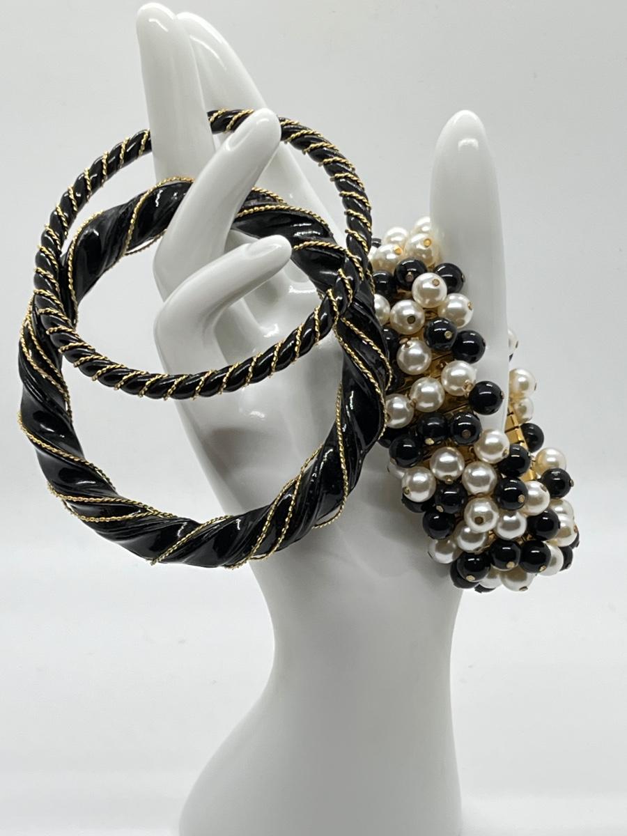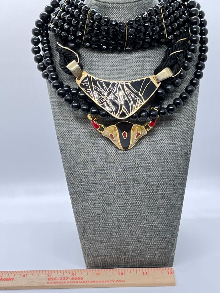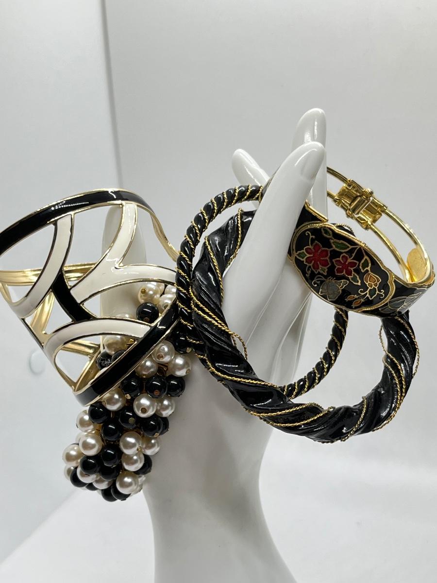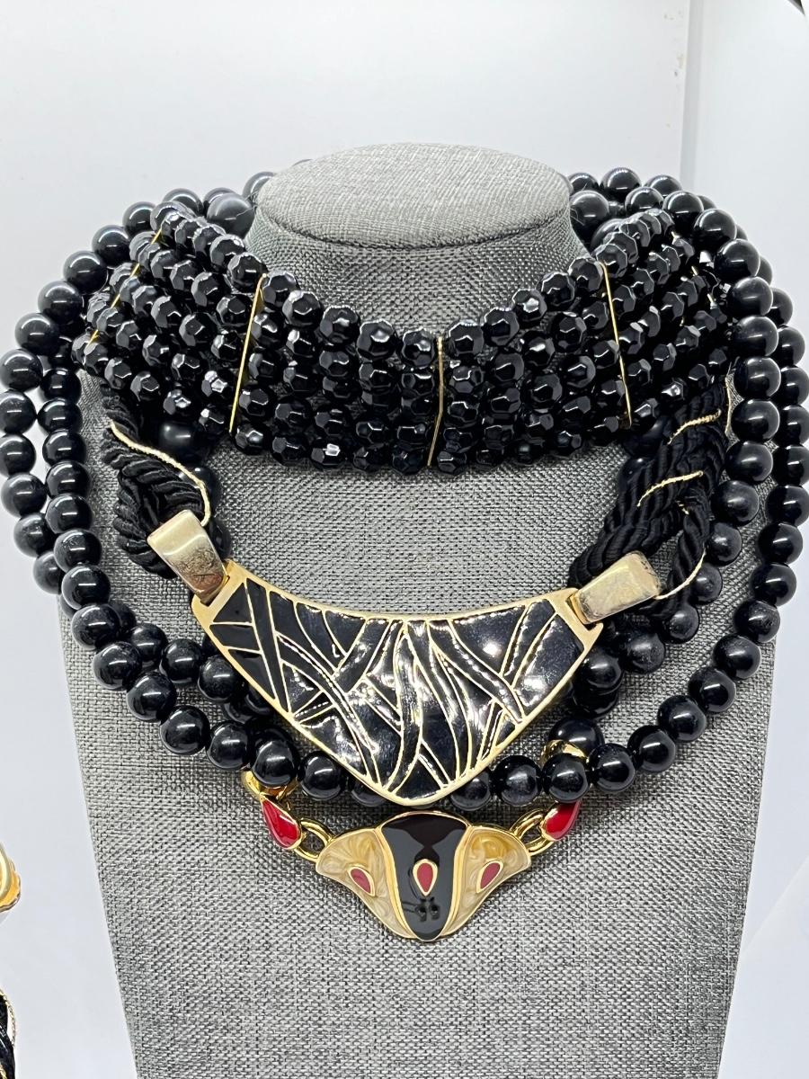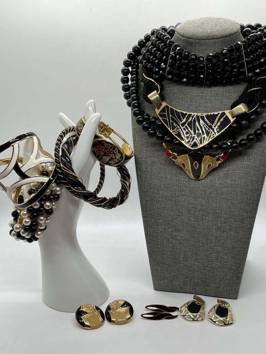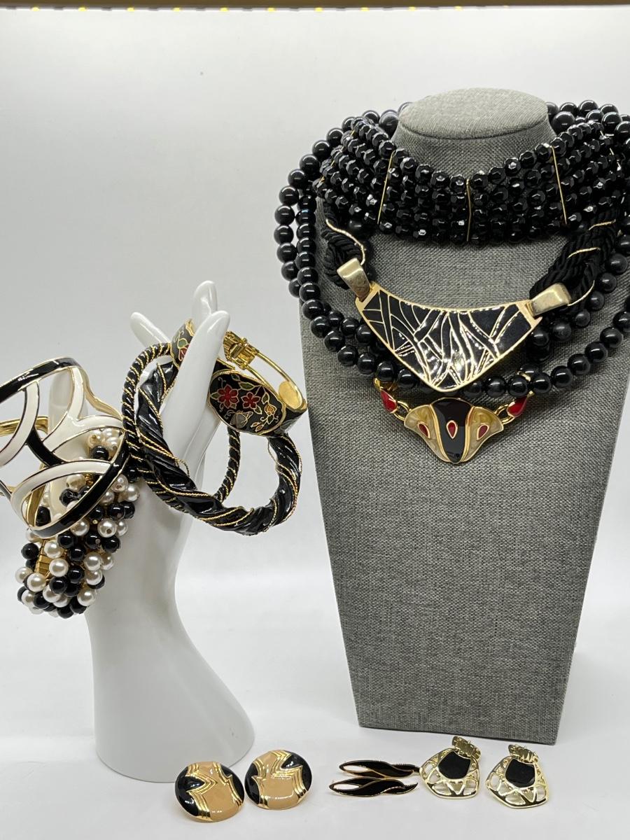 LOT 169J: Black and Gold Chokers, Clamper Bracelet, Expandable Beaded Bracelet and Bangle Earrings...Kenneth Jay Lane, Monet, Cloissone and More