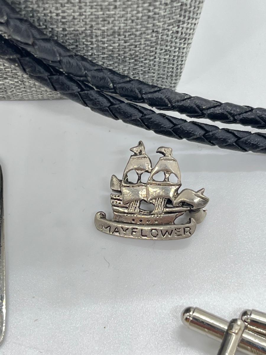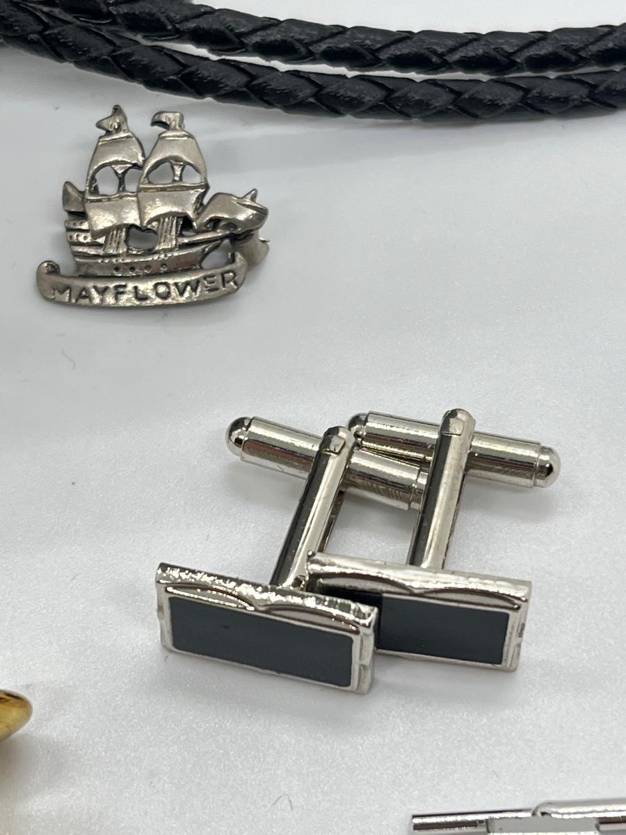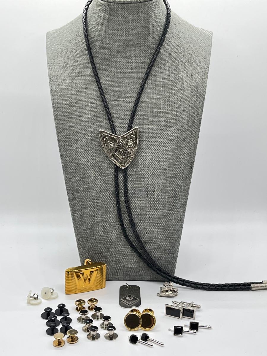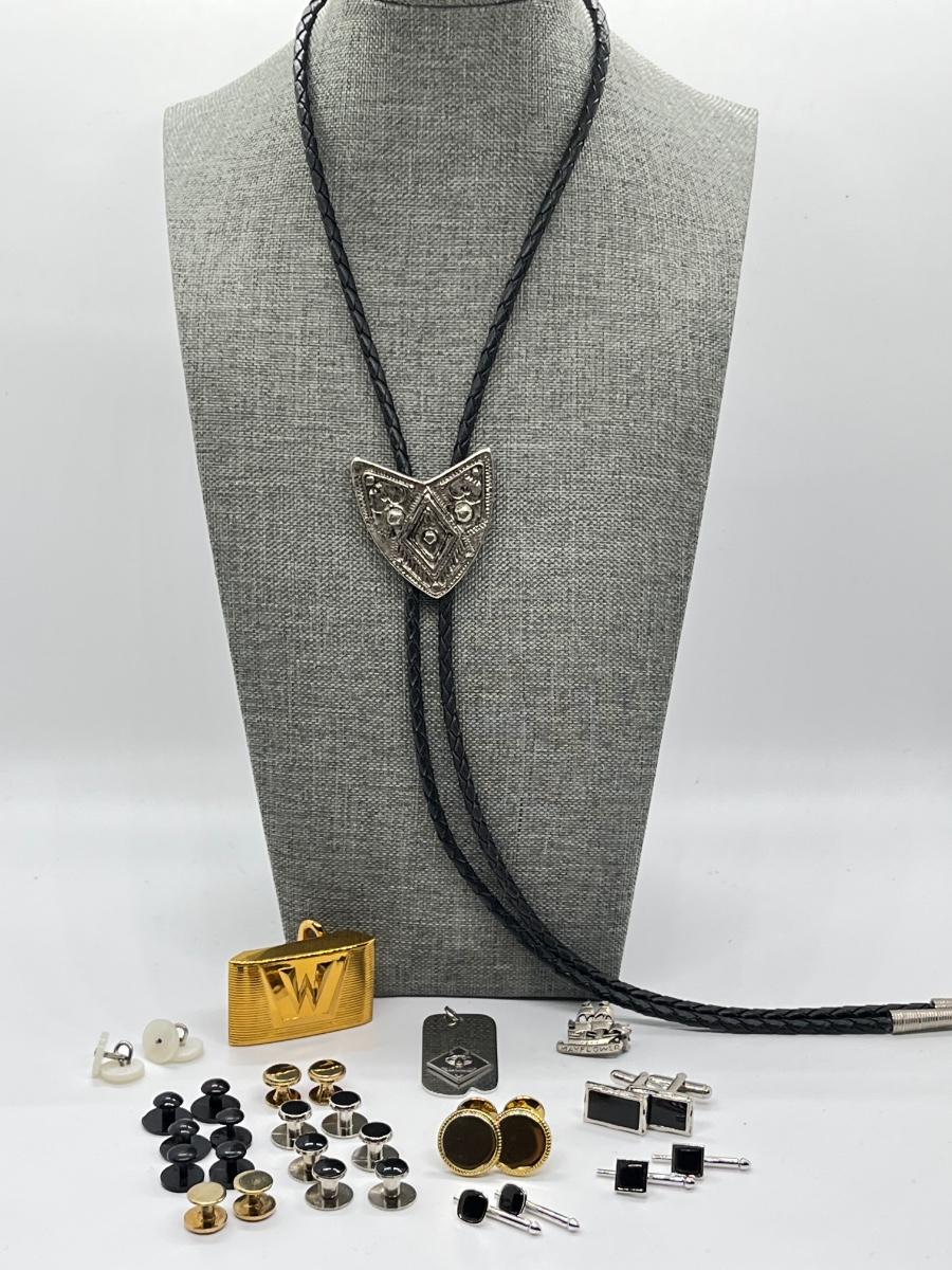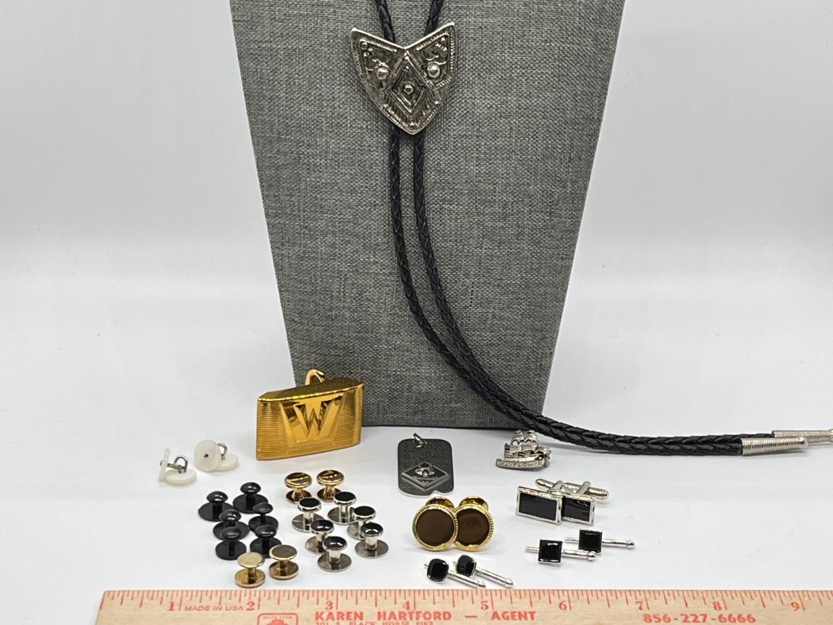LOT 185J: Leather Bolo Tie, Cub Scout Dog Tag, Hickock USA Belt Buckle, Cuff Links and More