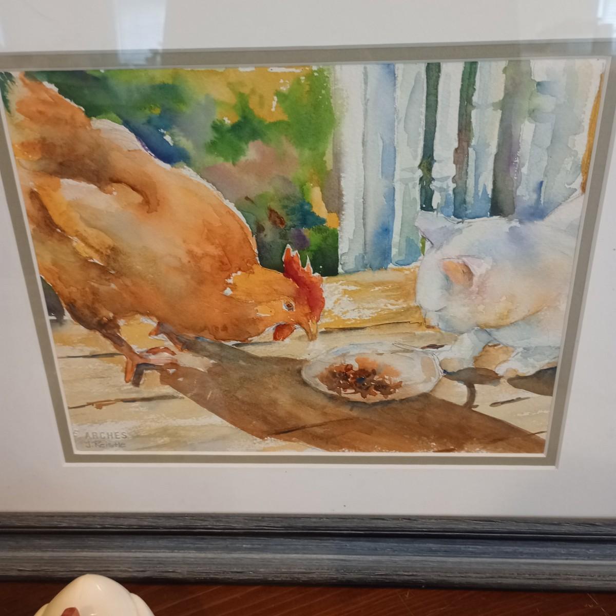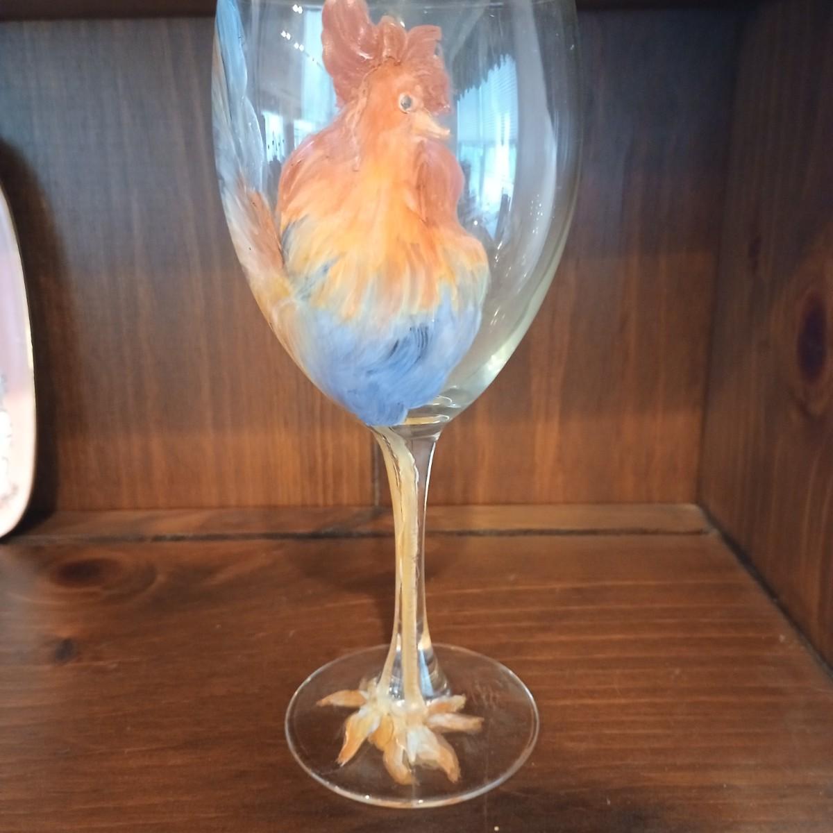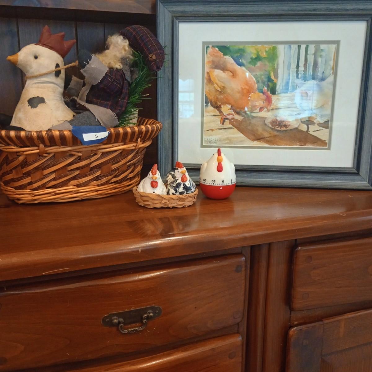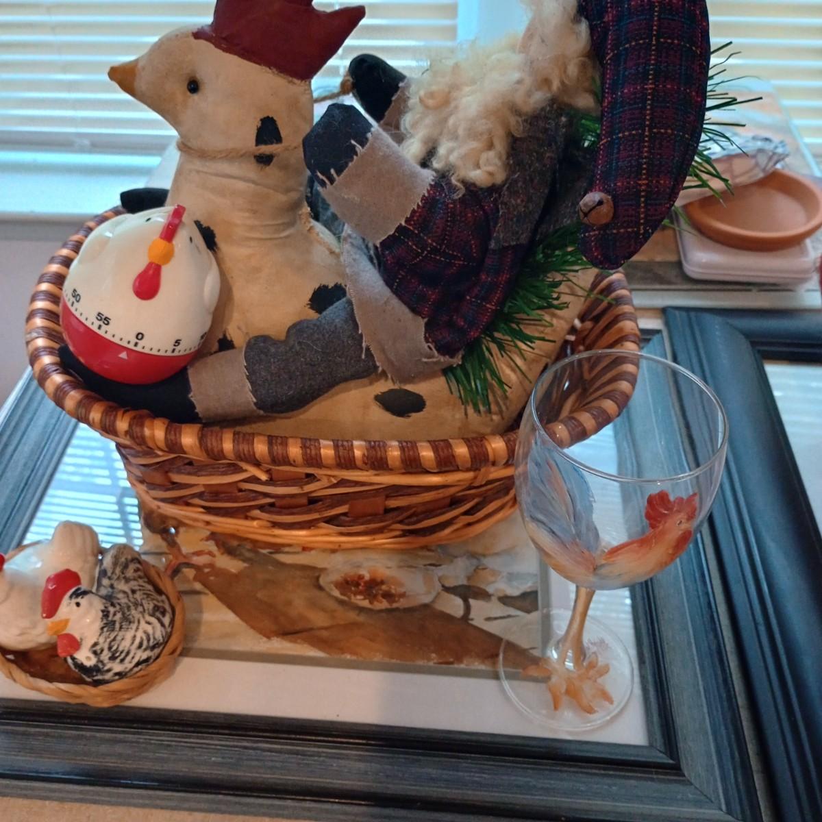 LOT 5P: Chicken Decor- Artwork, Salt and Pepper Shakers, Wine Glass, Timer, and Santa and Chicken Decoration