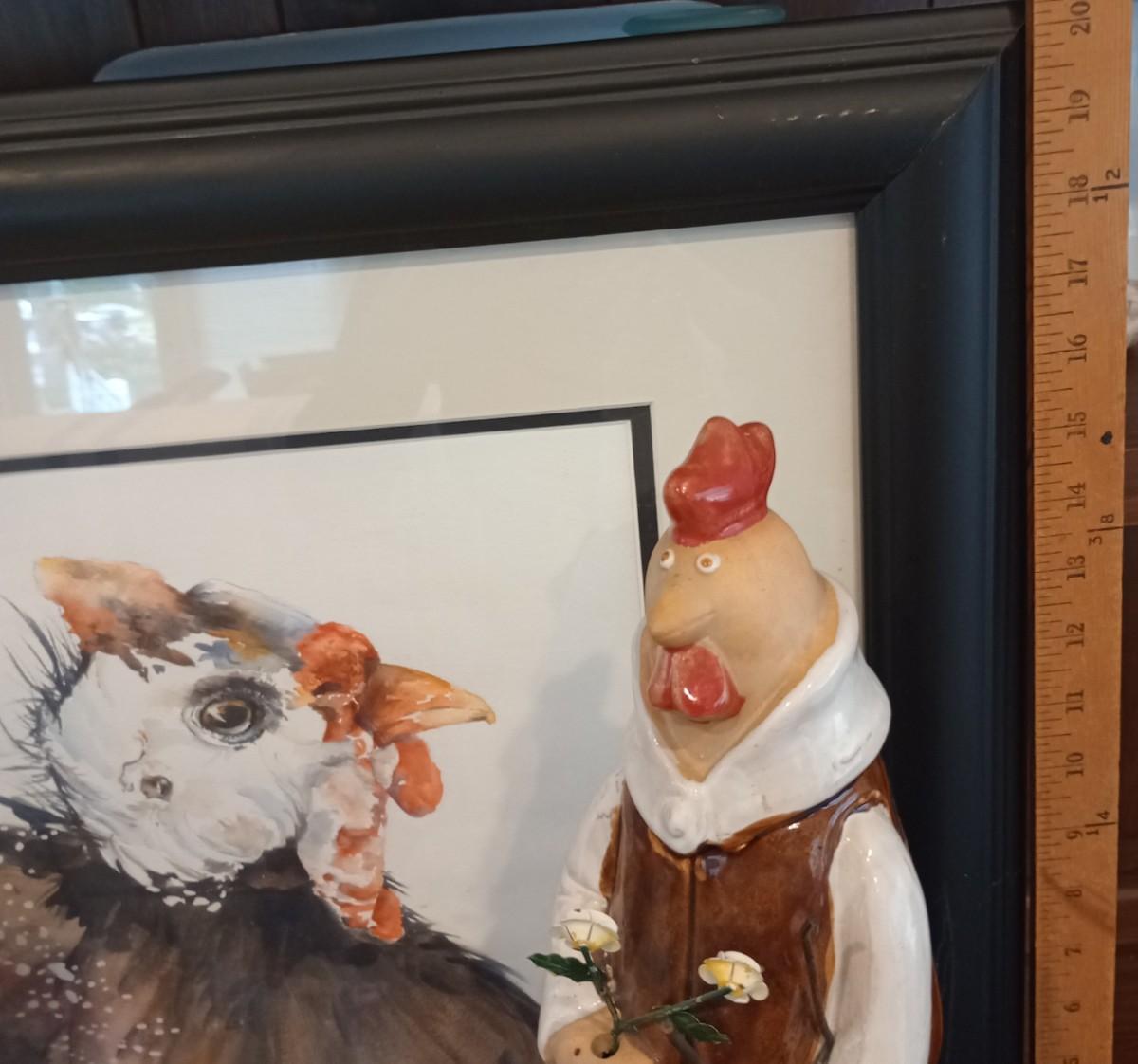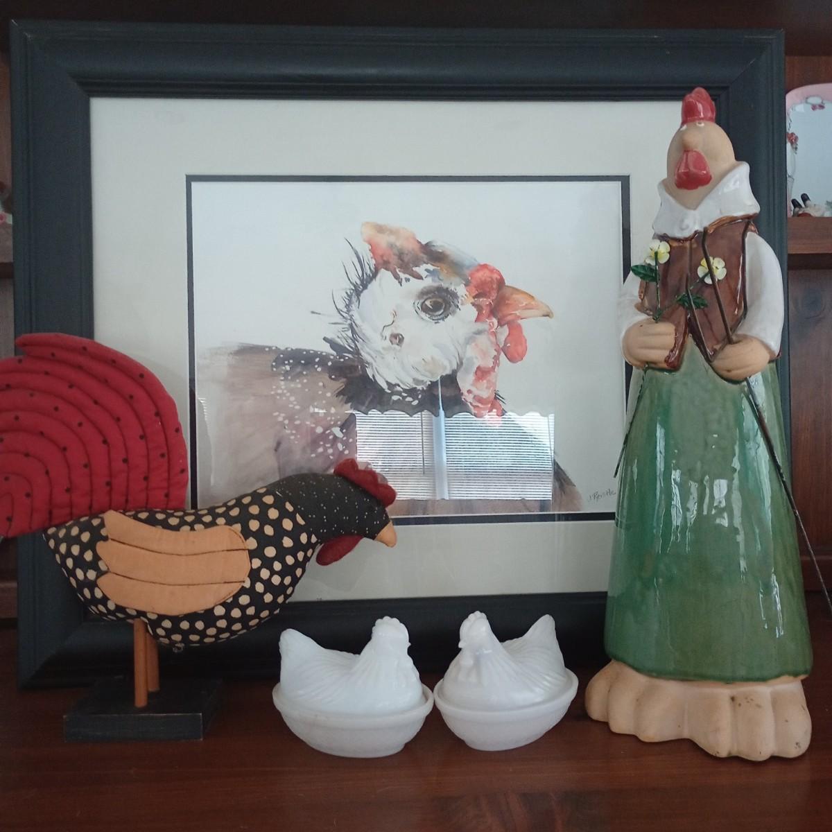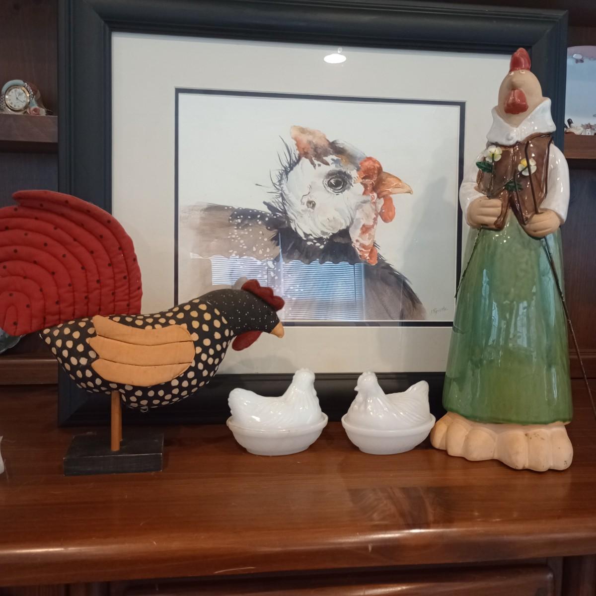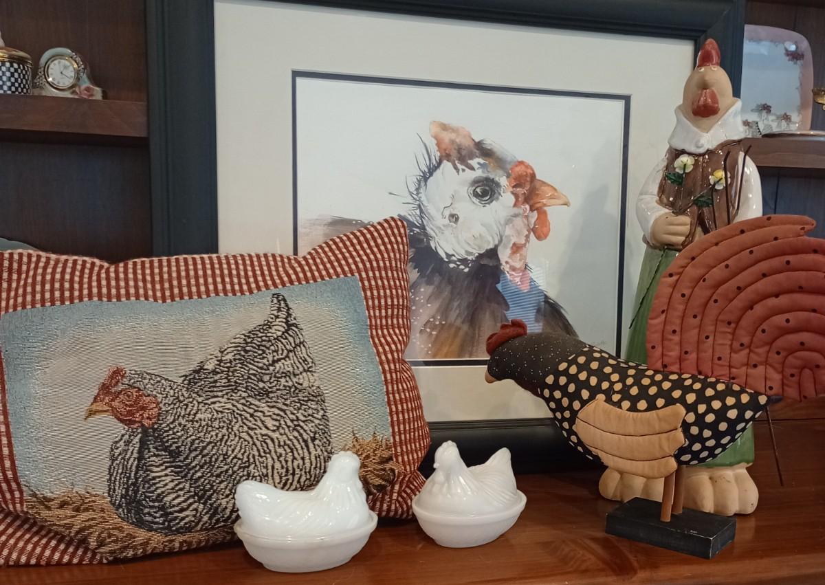 LOT 6P: More Chicken Decor -Artwork, Pillow, Candy Dishes, and More
